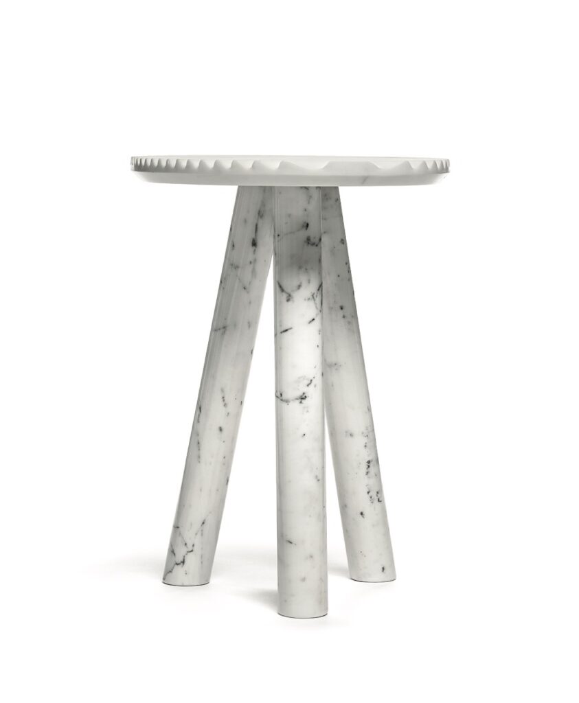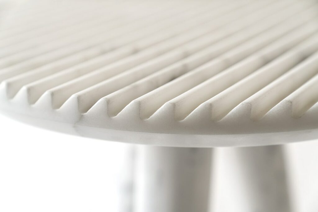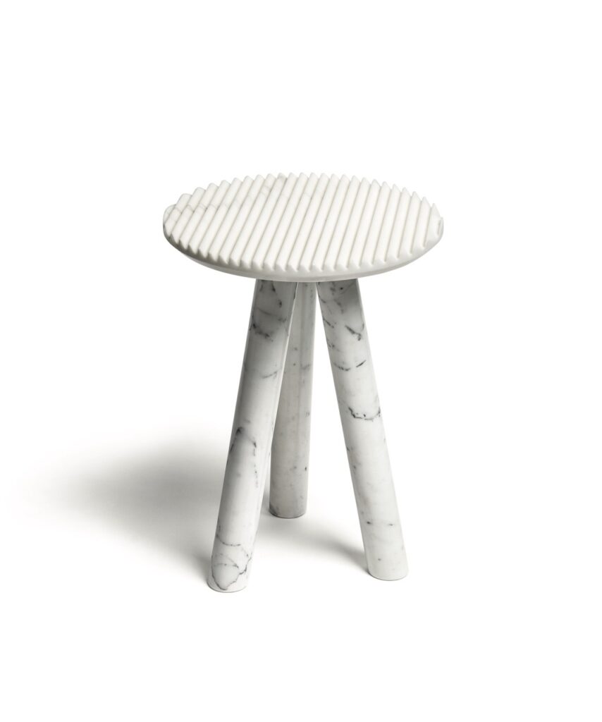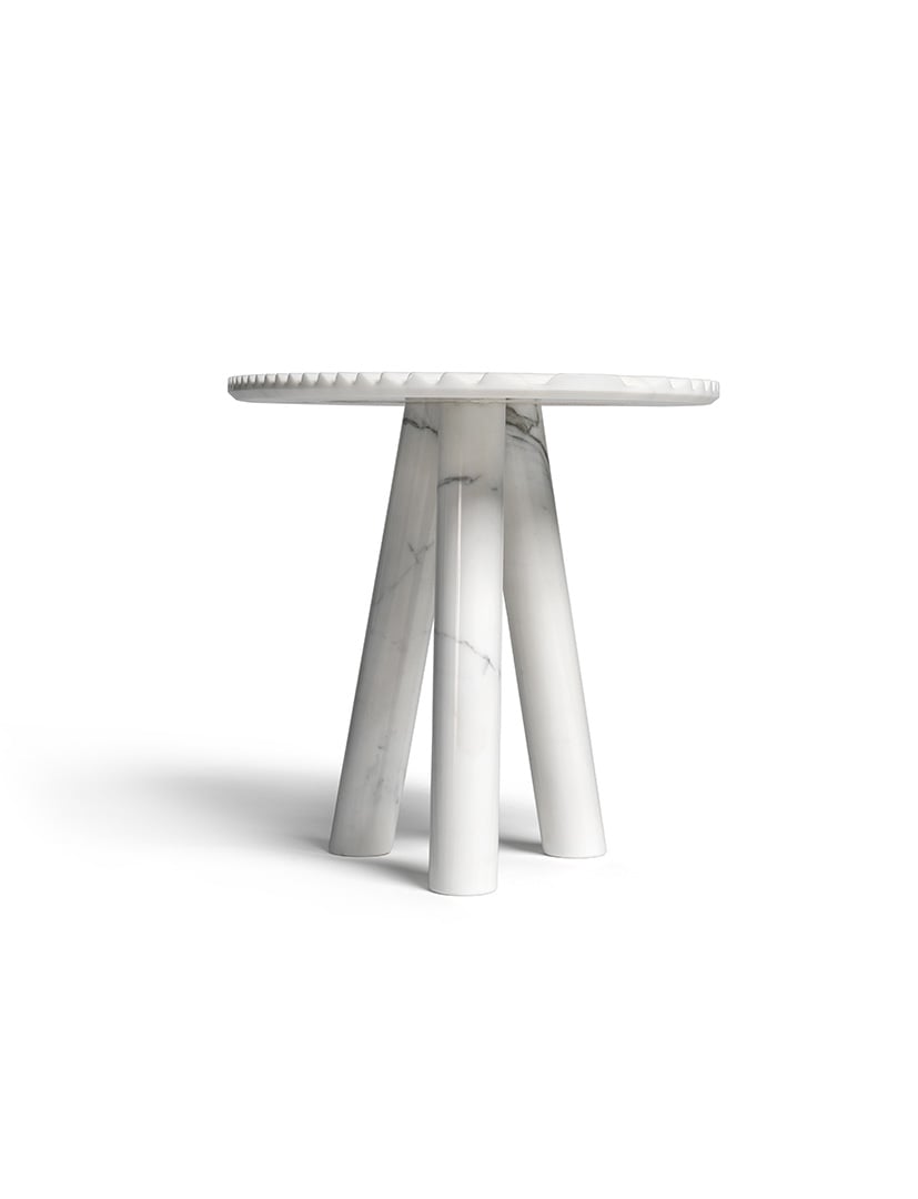 Patricia UrquiolaRabbet coffee tables in Calacatta marble. The ridged-texture tops have slanted, bevelled edge. The tubular legs underline the geometric forms and focus on the marble’s natural vein patterns. The tables are available in two different sizes and can be purchased individually.