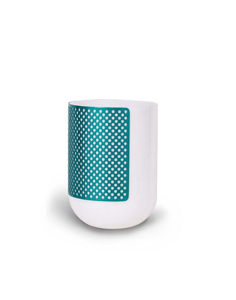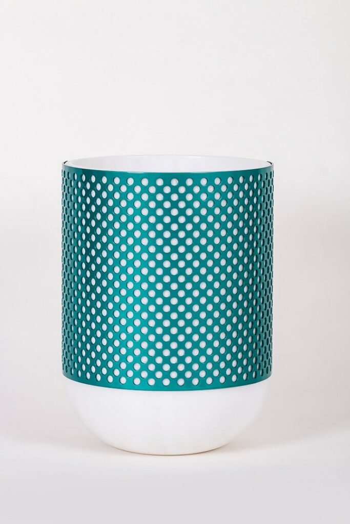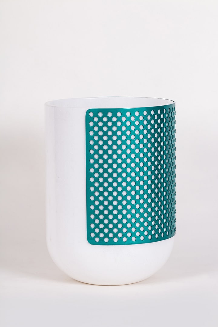 Patricia UrquiolaVase created from a solid block of Bianco Lasa Covelano partially covered by a perforated Blu Caribbean-coloured metal sheath.