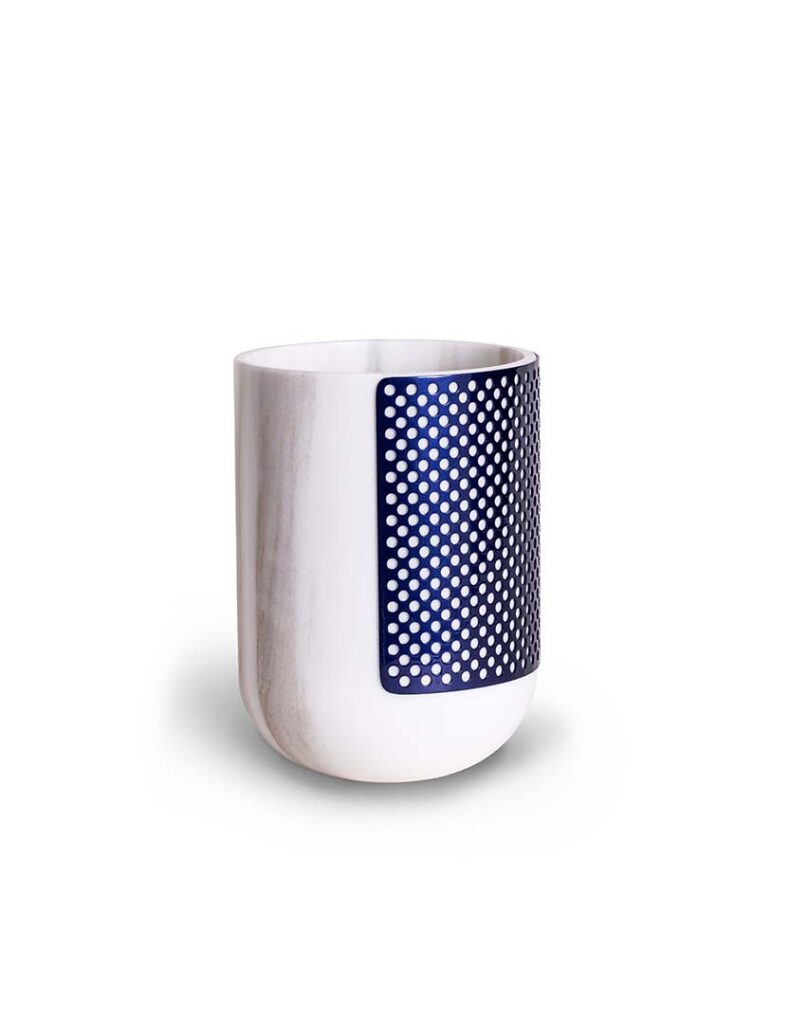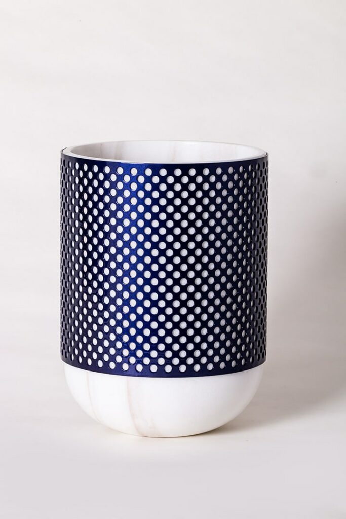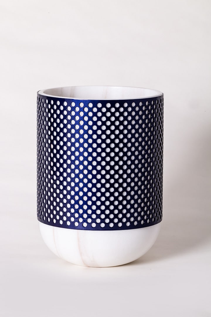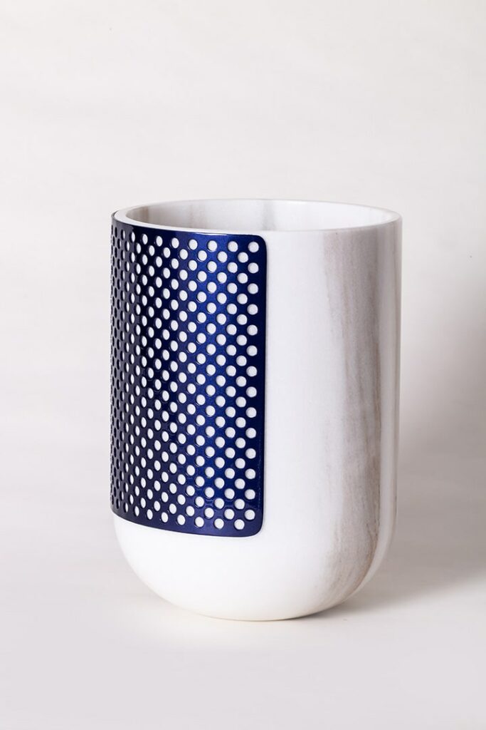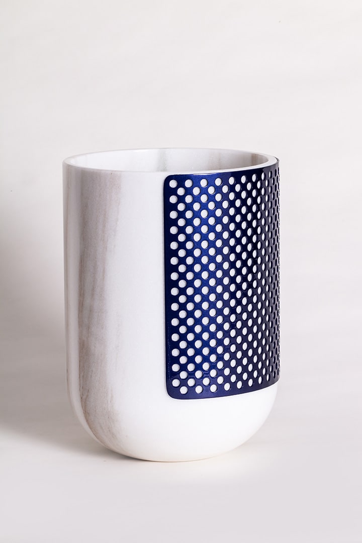 Patricia UrquiolaVase created from a solid block of Bianco Lasa Covelano partially covered by a perforated Indigo Blue-coloured metal sheath.