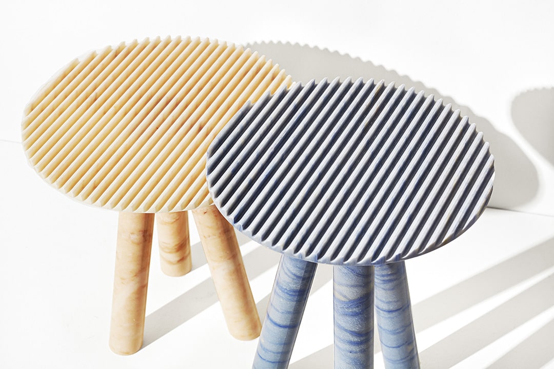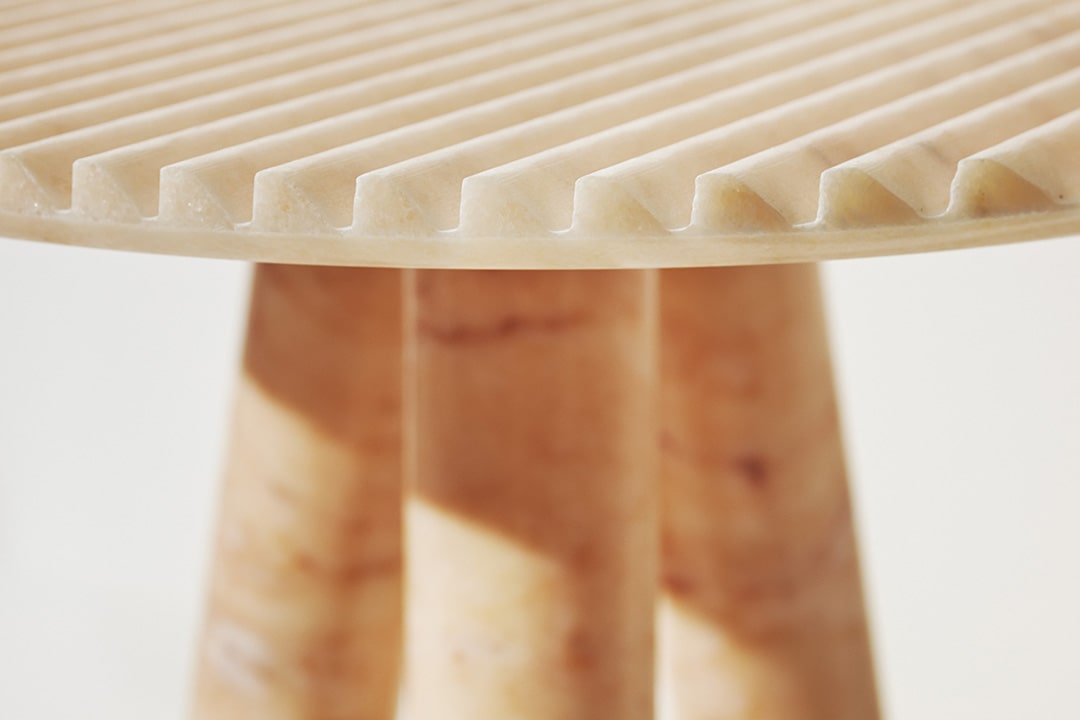 Patricia UrquiolaRabbet Coffee Table in Rosa Portogallo. The ridged-texture tops have slanted, bevelled edge. The tubular legs underline the geometric forms and focus on the marble’s natural vein patterns. Rabbet Rosa Portogallo coffee table can be combined with Rabbet Azul Coffee Table.
