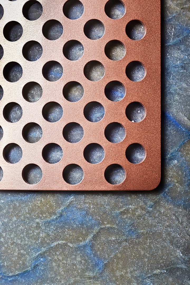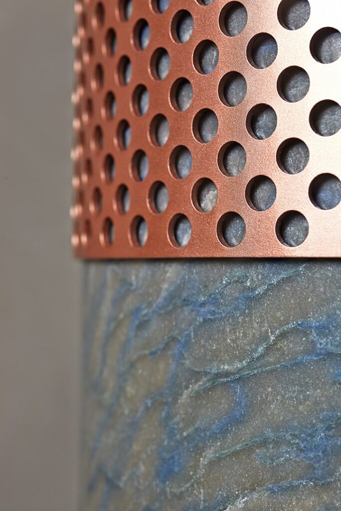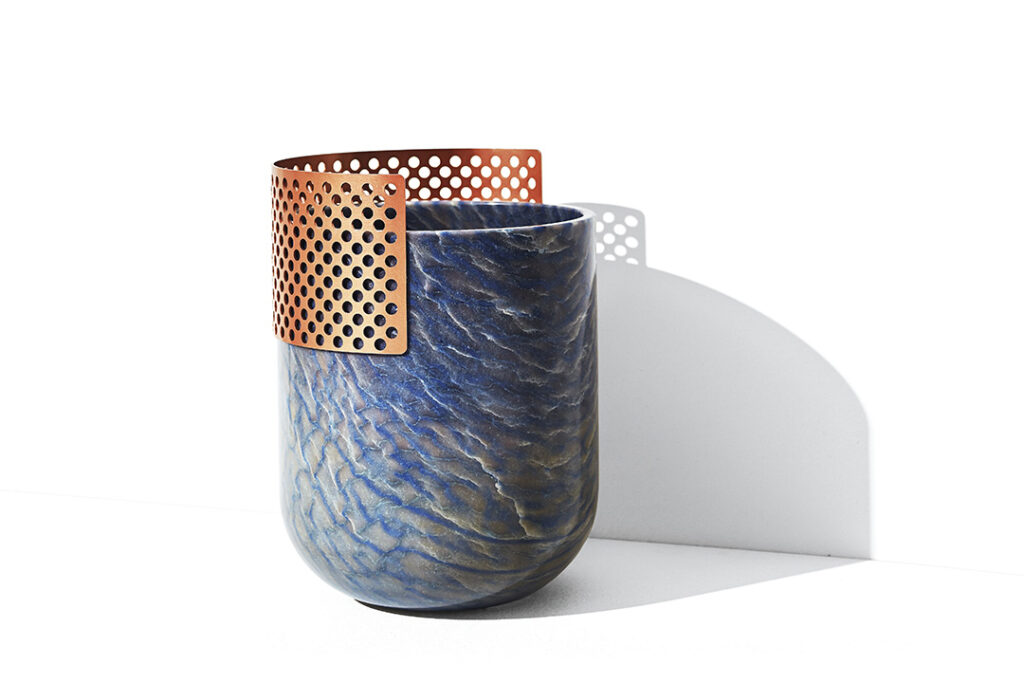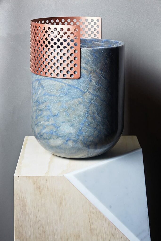 Patricia UrquiolaVase created from a solid block of Azul Macauba/Azul Boquira, topped by a shaped perforated plate in copper-coloured metal.