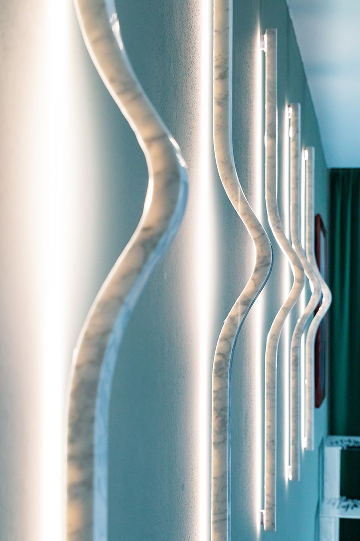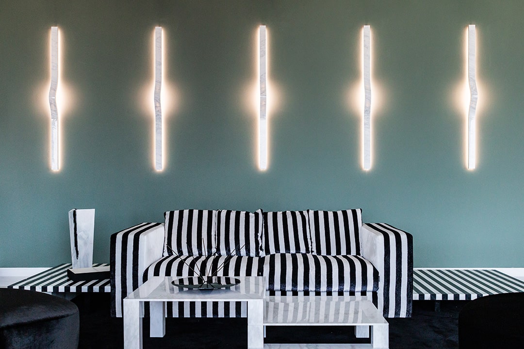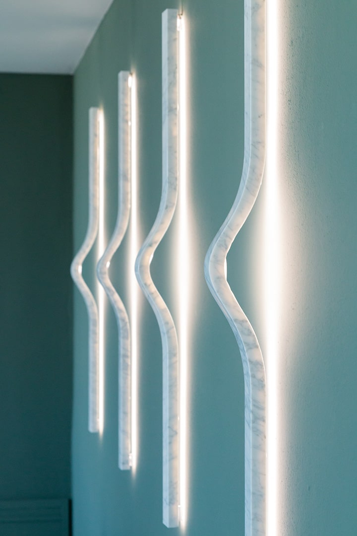 Gwenael NicolasThin and sinuous, the elegant Thinium wall light, made of Statuarietto marble, creates a sophisticated but discreet ray of light. In pair, or in multiple sequence, it takes on a sculptural and decorative look.
