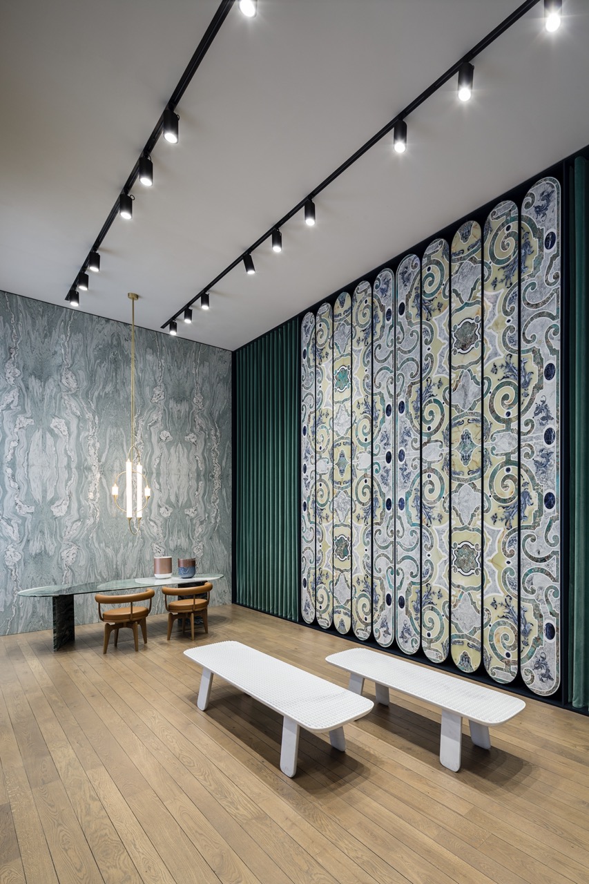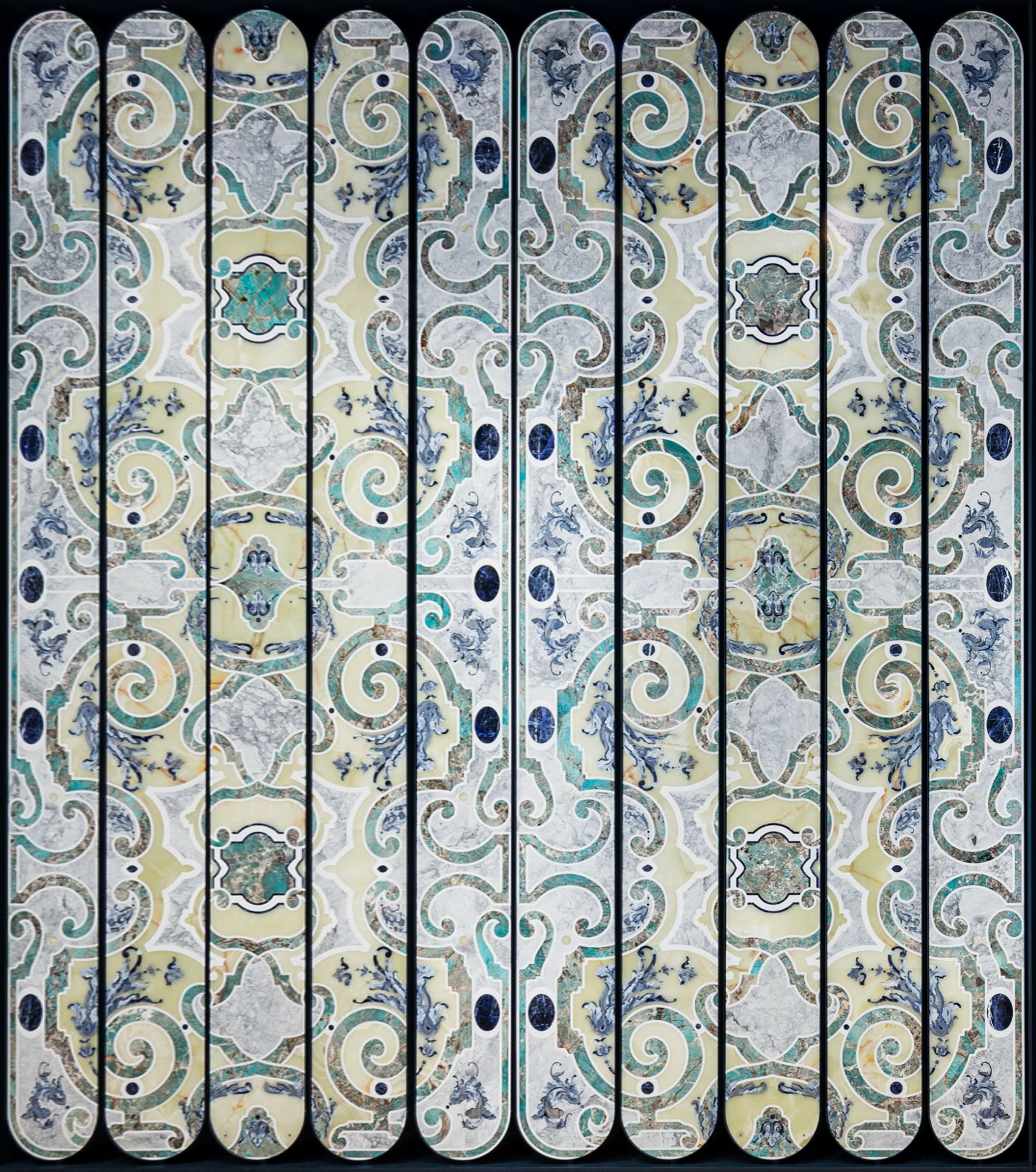 "Today’s Reinassance" Artwork is inspired by Renaissance inlaid floors and walls, but revisited in a modern way. In fact, despite being a classic decoration, the marbles used are absolutely contemporary. The bottom in Green Jade Onyx and the inlays in Amazonite of Patagonia and Lapis Lazuli make this coating unique and timeless.