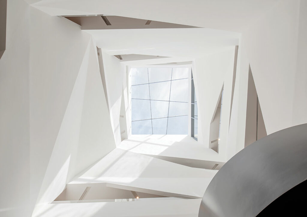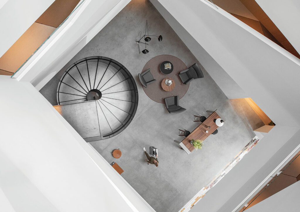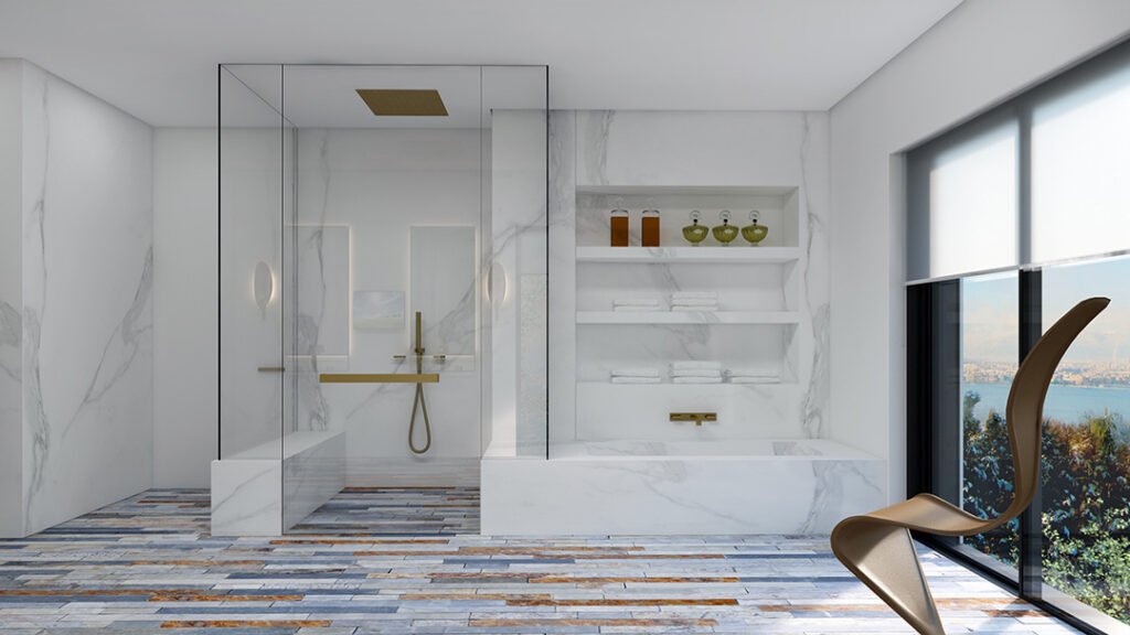 Custom project in which Budri created the extensive flooring in the dining area. Slabs in different colours and lengths alternate with a white marble background for an effect that’s visually striking. Award-winning project.