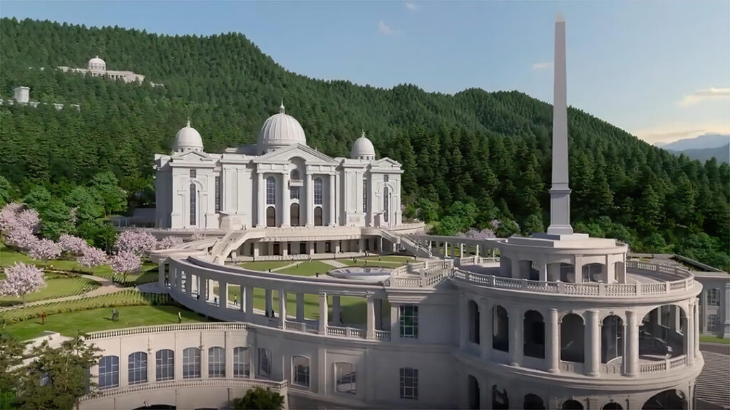 Characterised by an imposing 30-metre-high monumental spire at the top of an entrance tower, the most important structure of Cheonwon Palace is the central building, which is topped by five large domes, testifying to the Korean stone architecture extended over four floors underground and three floors above.