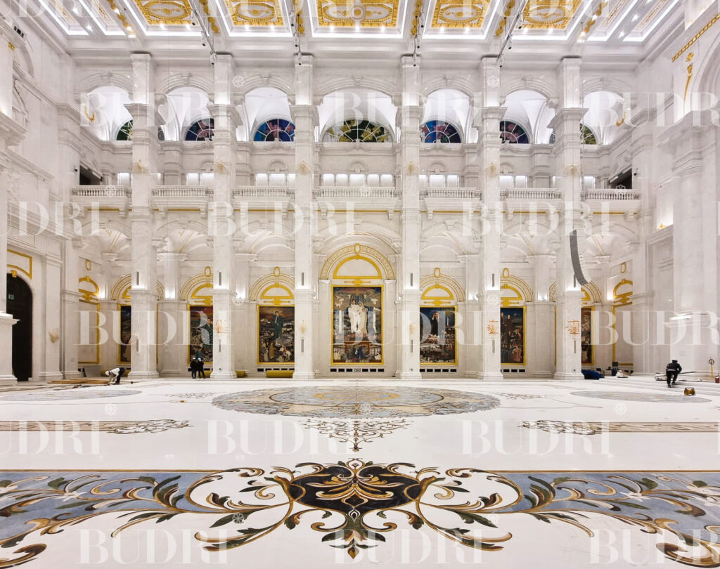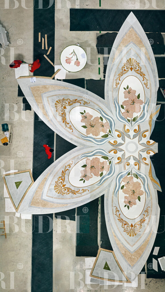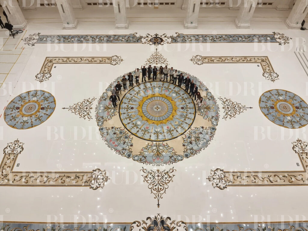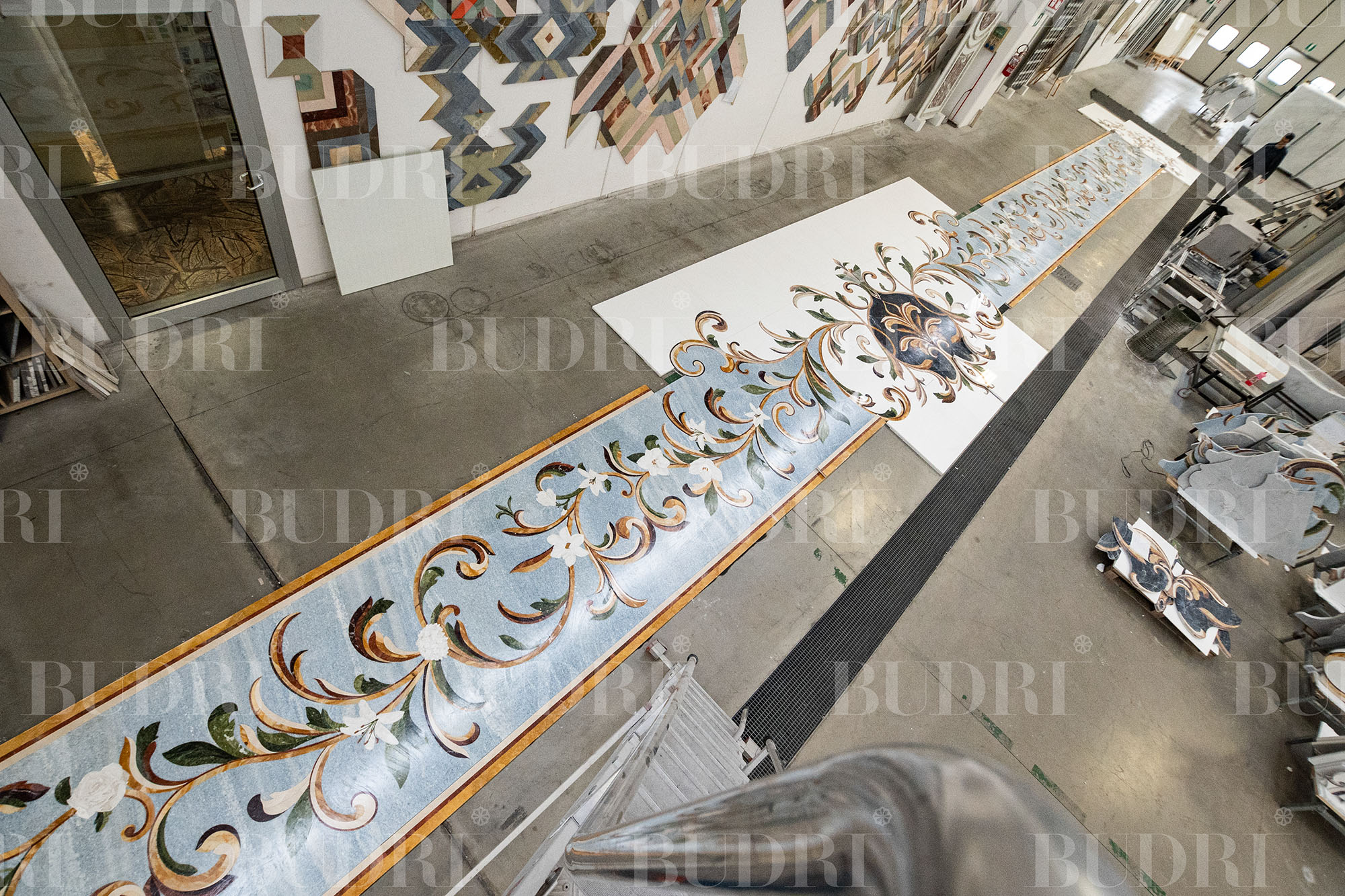 Inside the sumptuous main building, three large circular floors welcome visitors: a central one with a diameter of 18 m and two lateral ones of 6 m depicting immense flower bouquets: roses, forsythias, lilies, hibiscus and chrysanthemums. Made of different types of marble, onyx and semi-precious stone, they are truly one of a kind thanks to the extremely minute details and the refined nuances of the petals, leaves and individual pistils. The artistic team studied flowers from real life to transfer their beauty into each tiny inlay. A triumph of many hands and many minds, it’s a feather in the cap of Budri for its elevated artistic value.