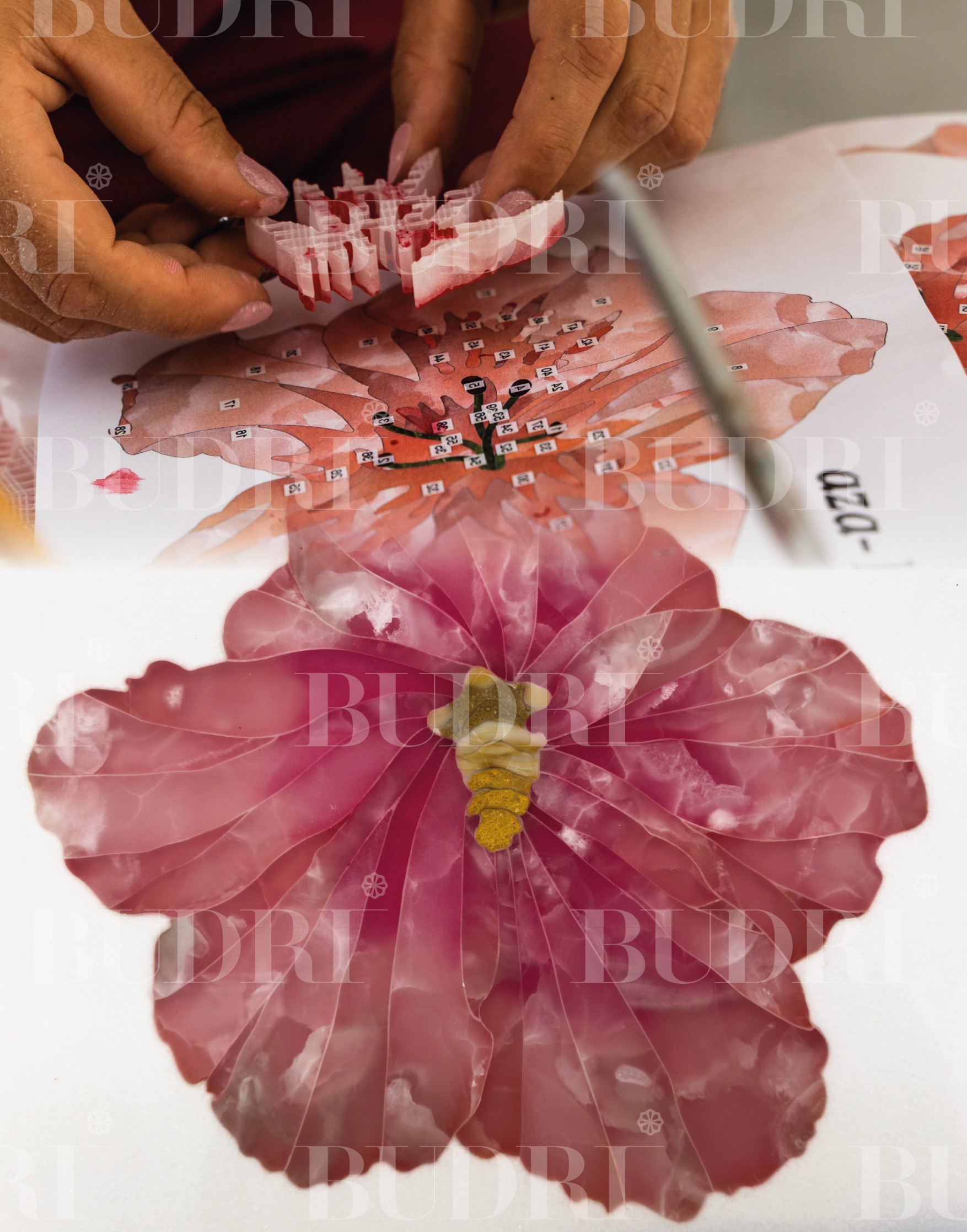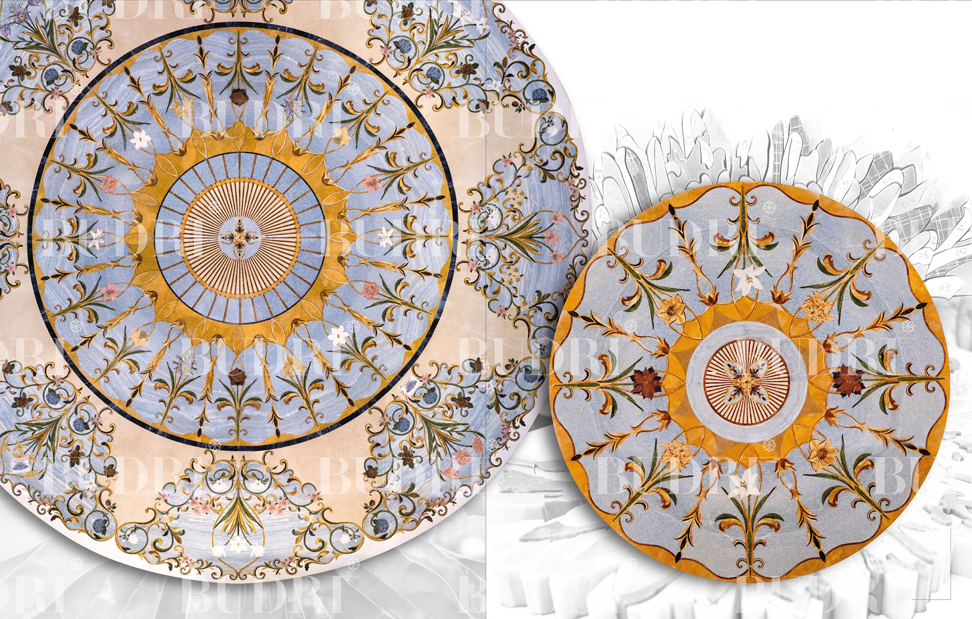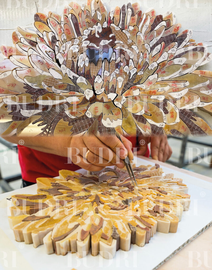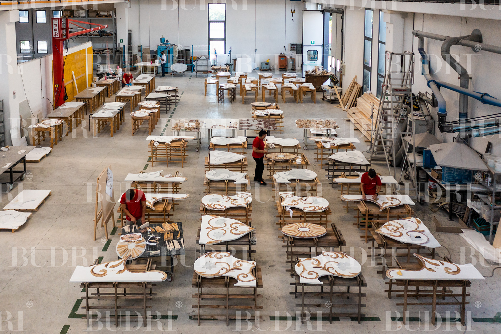 Inside the sumptuous main building, three large circular floors welcome visitors: a central one with a diameter of 18 m and two lateral ones of 6 m depicting immense flower bouquets: roses, forsythias, lilies, hibiscus and chrysanthemums. Made of different types of marble, onyx and semi-precious stone, they are truly one of a kind thanks to the extremely minute details and the refined nuances of the petals, leaves and individual pistils. The artistic team studied flowers from real life to transfer their beauty into each tiny inlay. A triumph of many hands and many minds, it’s a feather in the cap of Budri for its elevated artistic value.