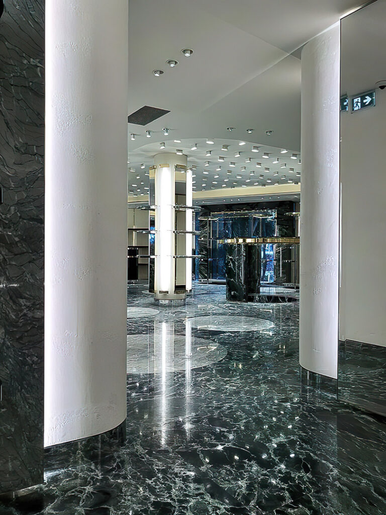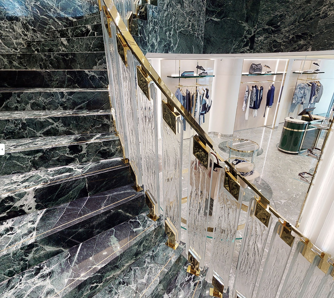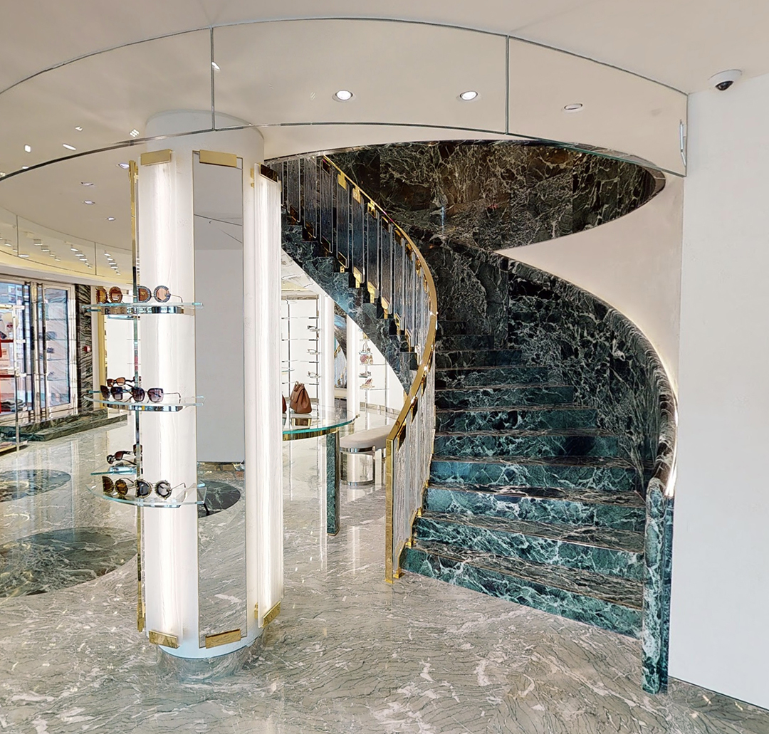 Custom project for which Budri created the flooring, indoor and outdoor wall facings, portals and architectural elements. The boutique is entirely made of a very painterly type of green marble, combined with two other tones (lighter and darker). The dark green, solid, free-standing marble staircase in the centre of the boutique is particularly outstanding.