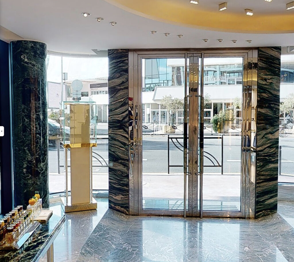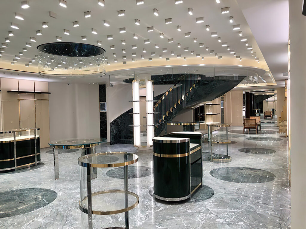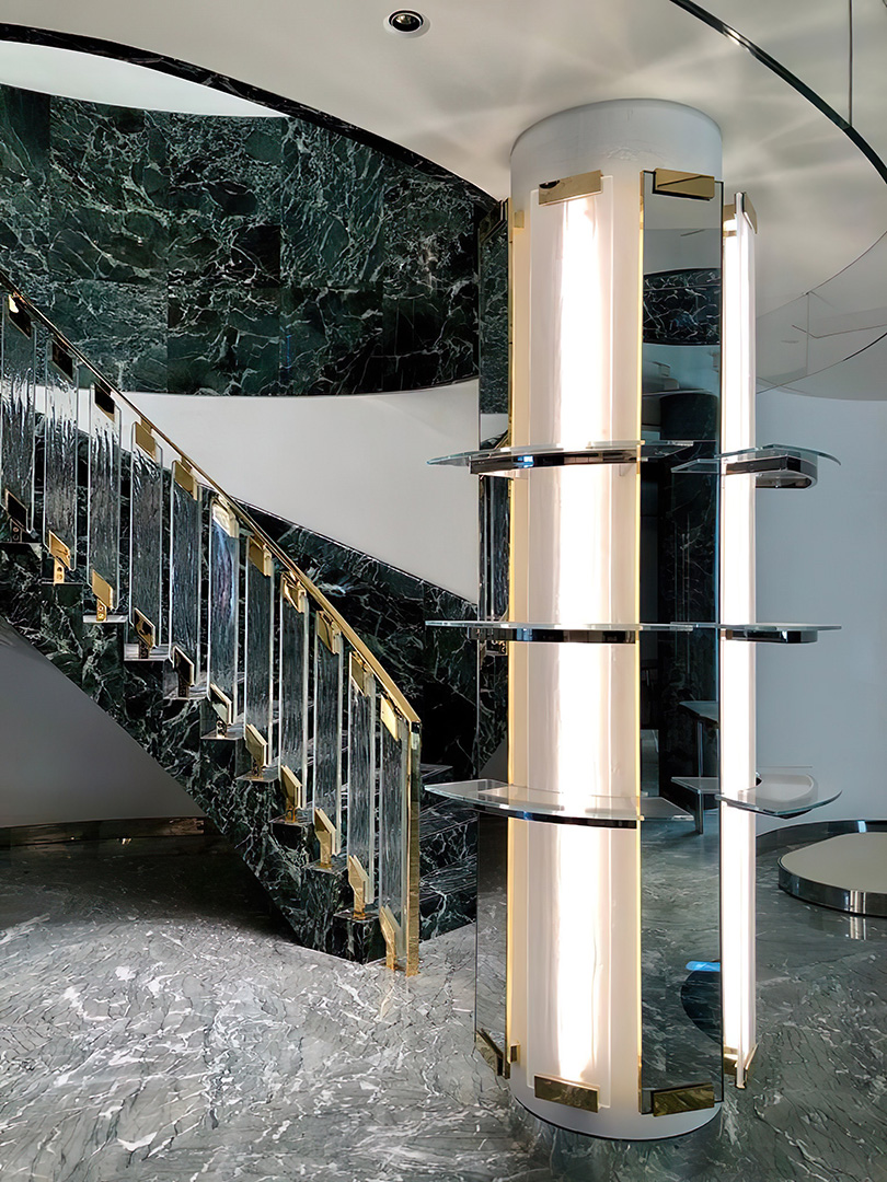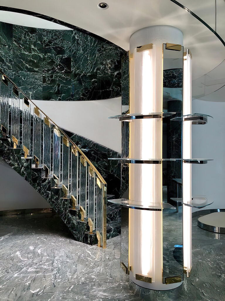 Custom project for which Budri created the flooring, indoor and outdoor wall facings, portals and architectural elements. The boutique is entirely made of a very painterly type of green marble, combined with two other tones (lighter and darker). The dark green, solid, free-standing marble staircase in the centre of the boutique is particularly outstanding.