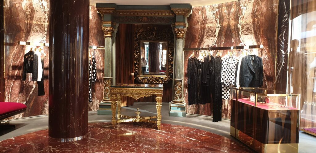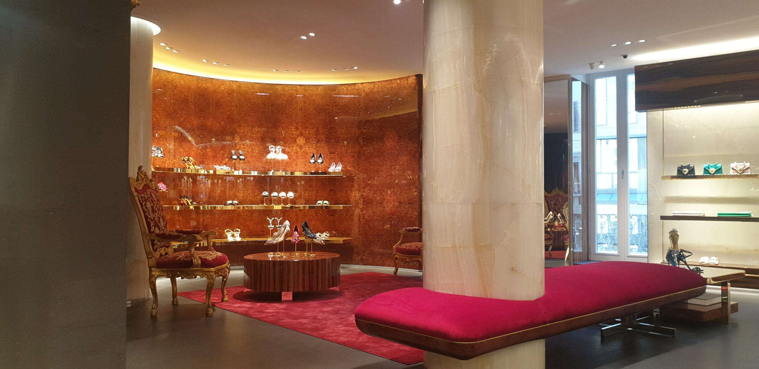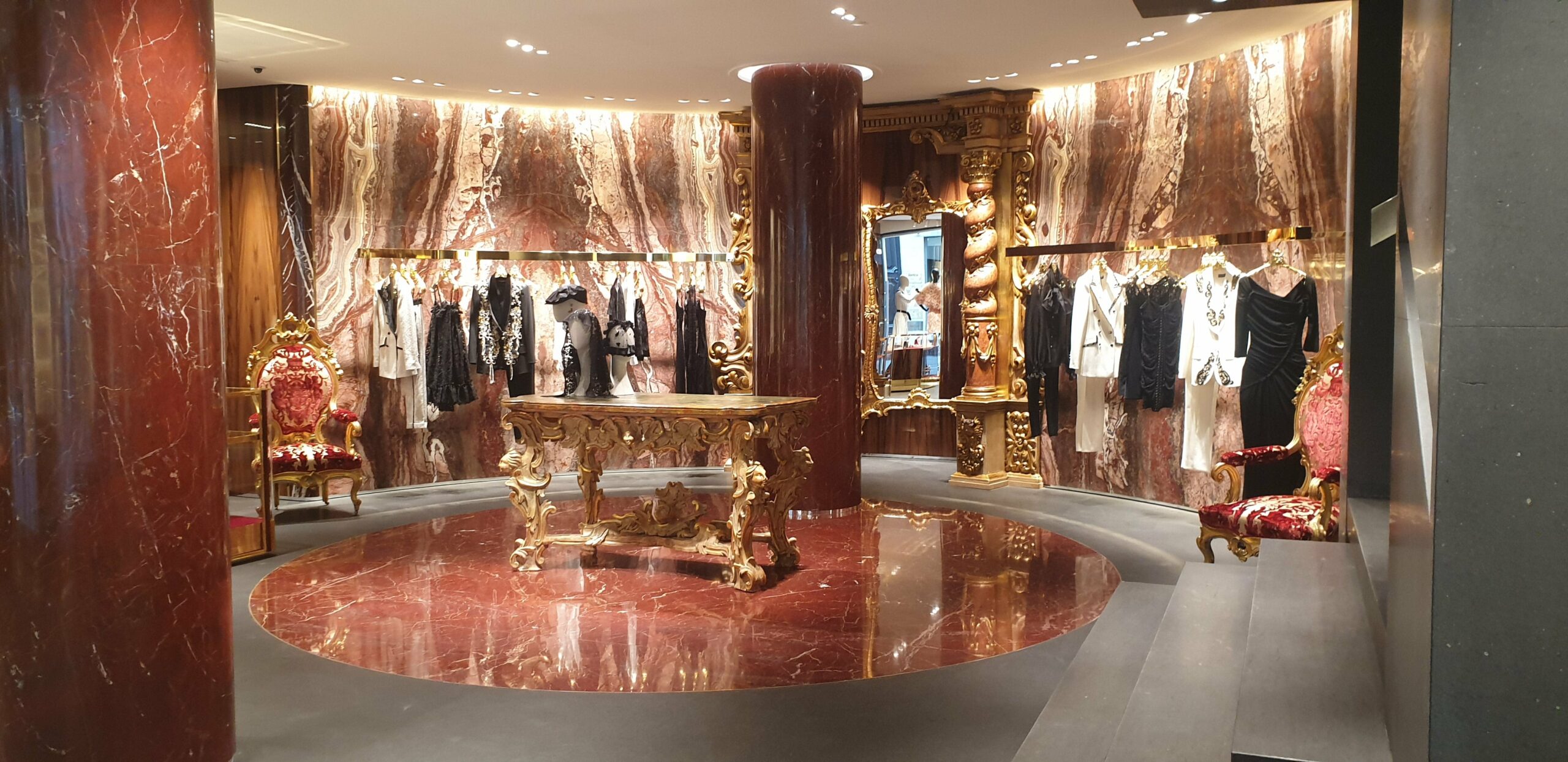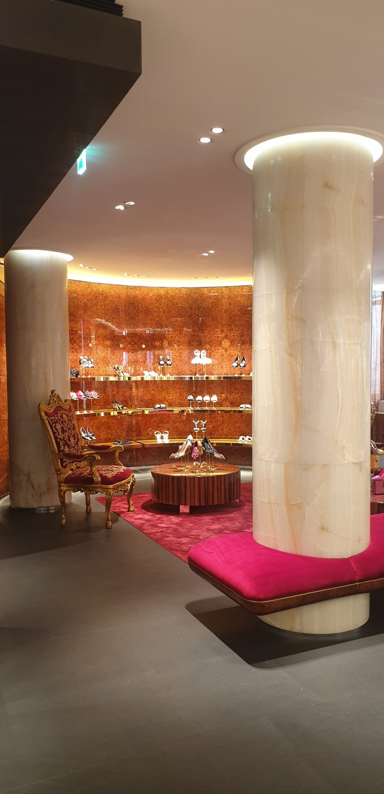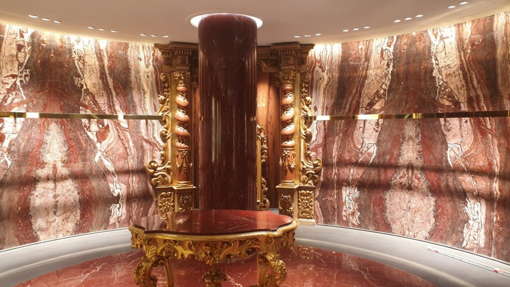 Custom project for which Budri created the flooring, wall facings, and architectural elements. The curved red onyx wall treatments and the Bordeaux red marble floor are majestic, as are the columns within the space.