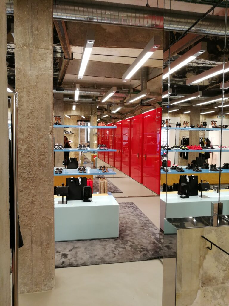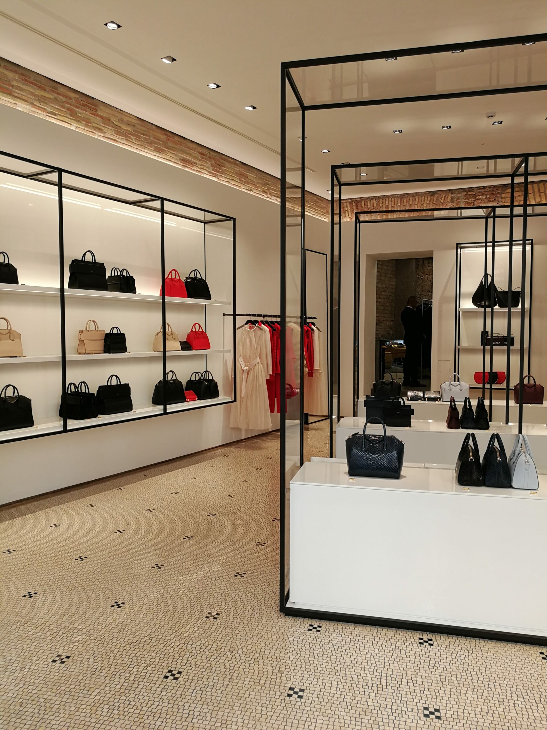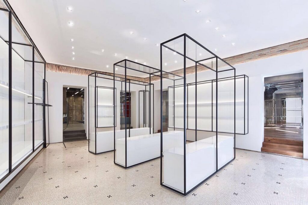 Custom project for which Budri created the flooring and wall facings. The geometric floor in modular seminato comes in two tones of white. Here as in other boutiques decorated by Budri, the historical building is in harmony with the designer's contemporary style.