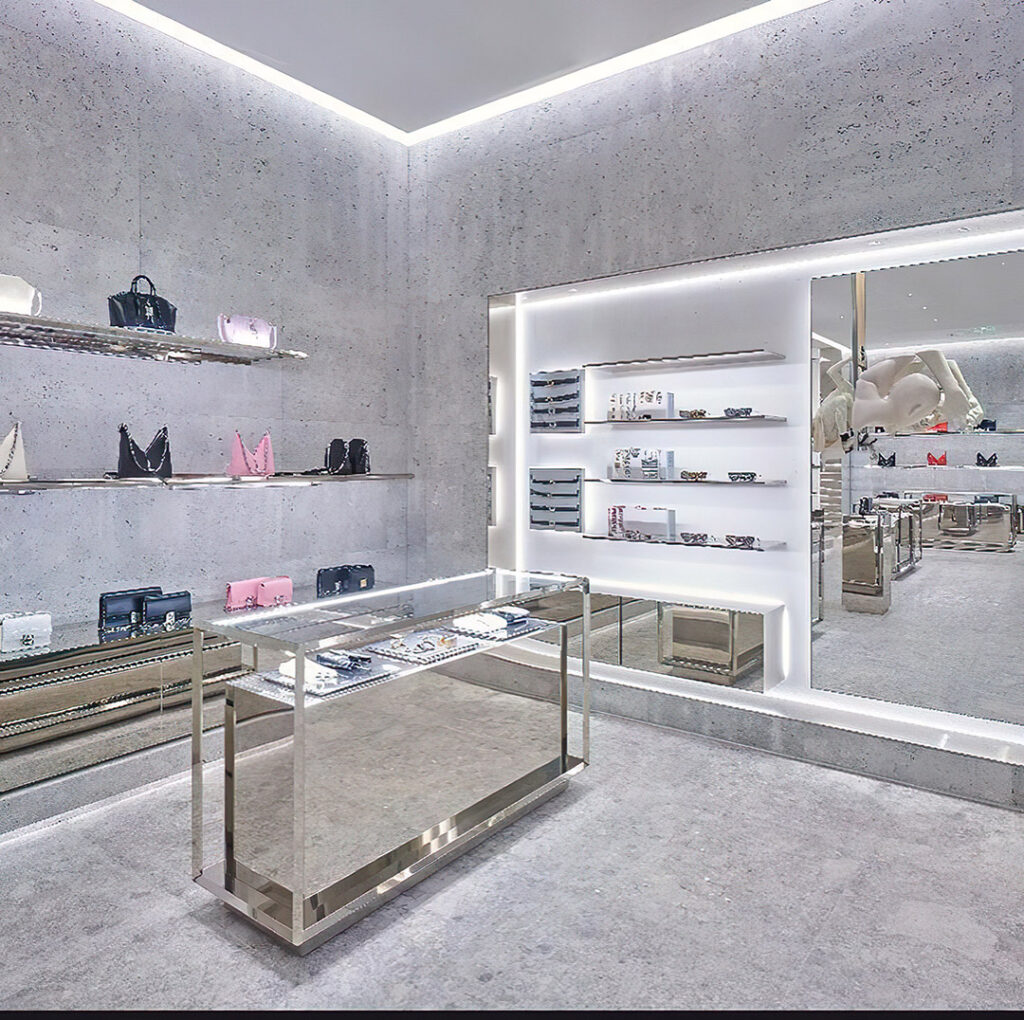 Custom project for which Budri created the flooring and wall facings. The geometric floor in modular seminato comes in two tones of white. Also in this boutique, the historical building is in harmony with the designer's contemporary style.