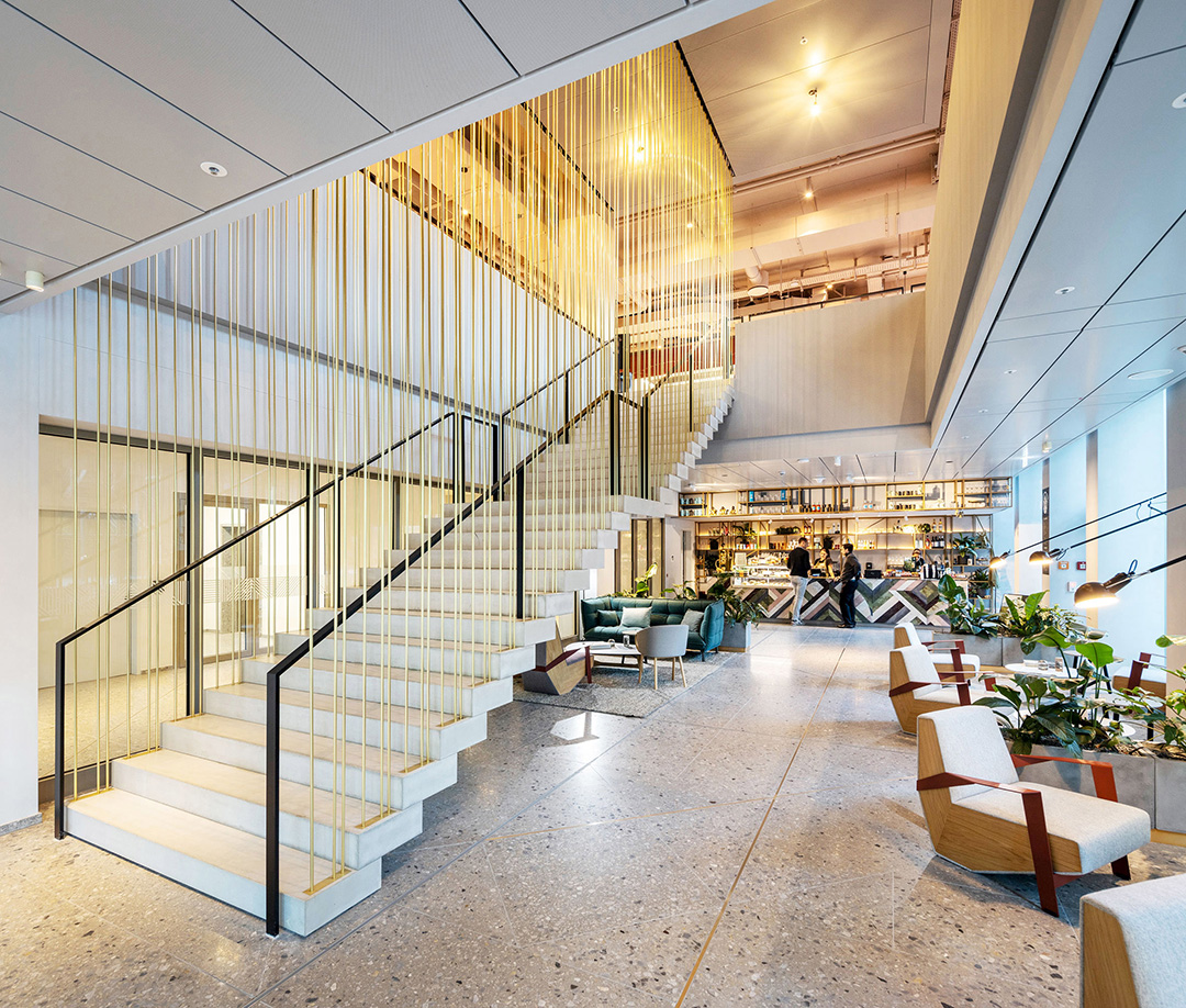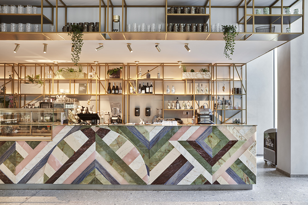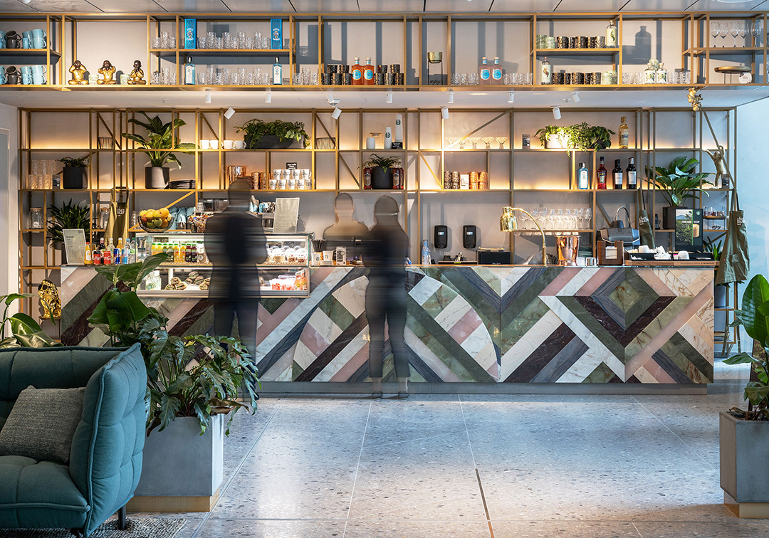 Custom project in which Budri created the large bar counter in the building's lobby. The fishbone pattern, designed by Patricia Urquiola for Budri, is made of marble and onyx, in different thicknesses, to emphasise the movement of the surface and make it the protagonist of the space.