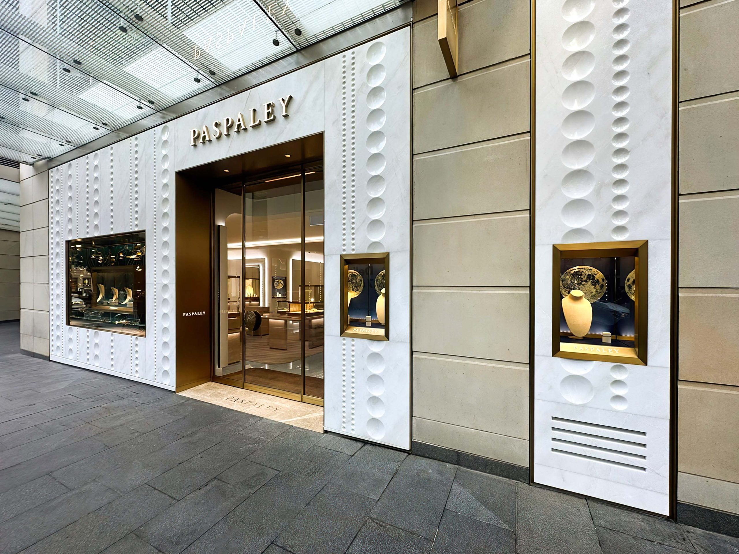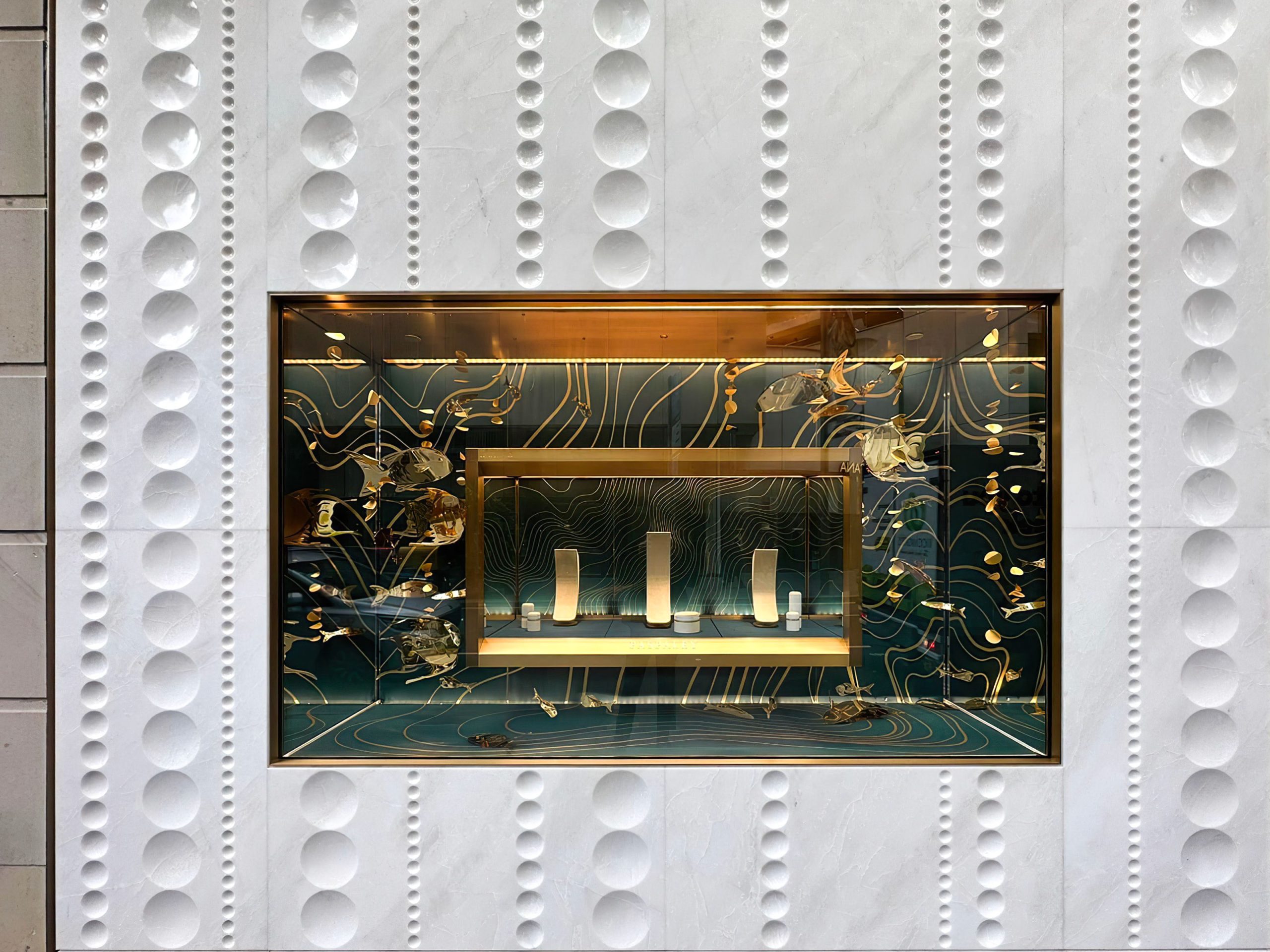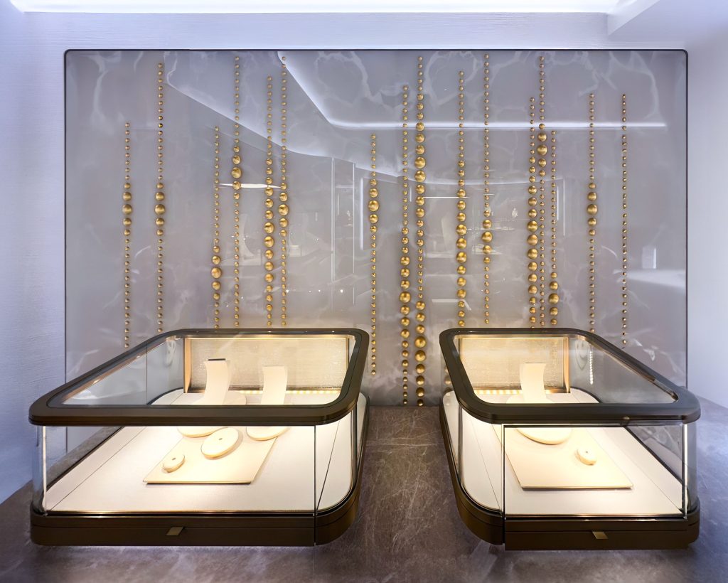 Fine pearl and jewelry boutique project in Sydney, for which Budri crafted the facades and the precious displays in Iranian White Onyx. The stone, with spherical recessed effect, reminiscent of pearl necklaces, embellished in the displays by ennobling with 24-carat gold leaf.