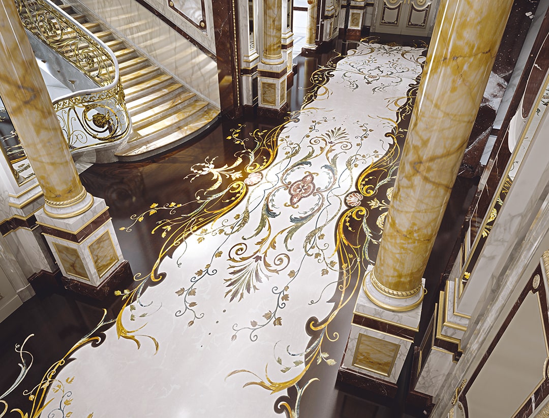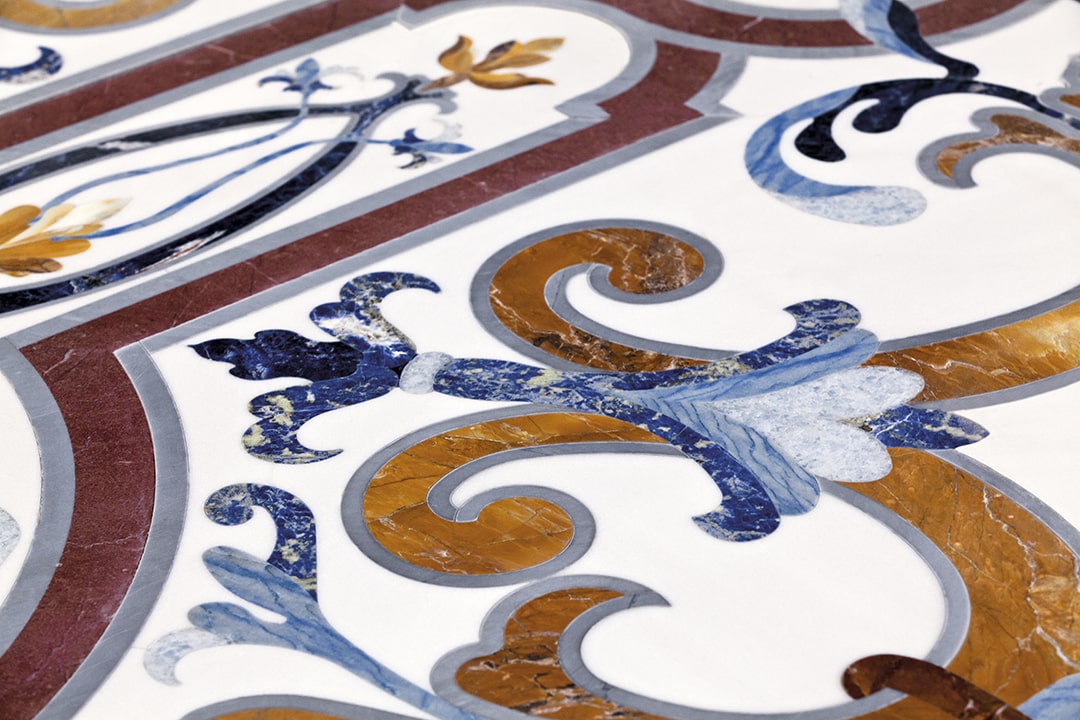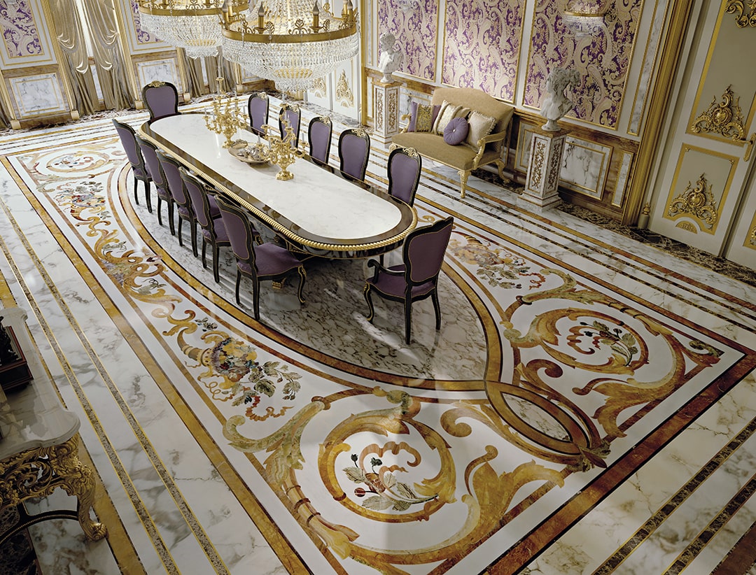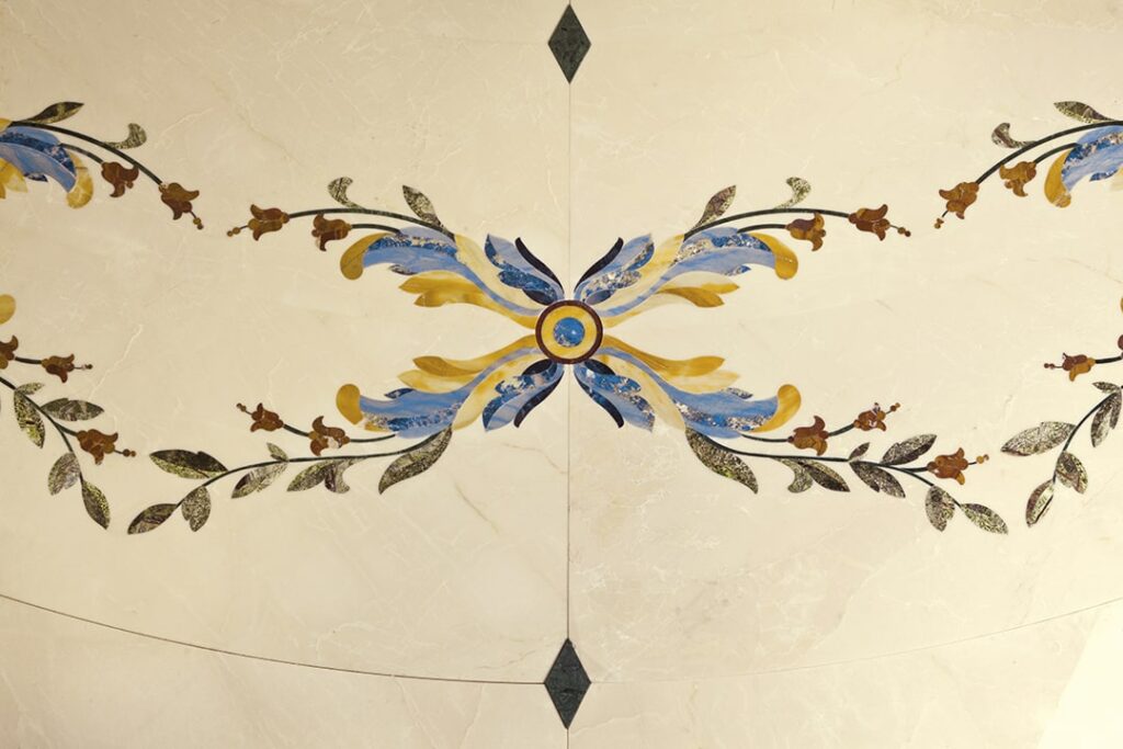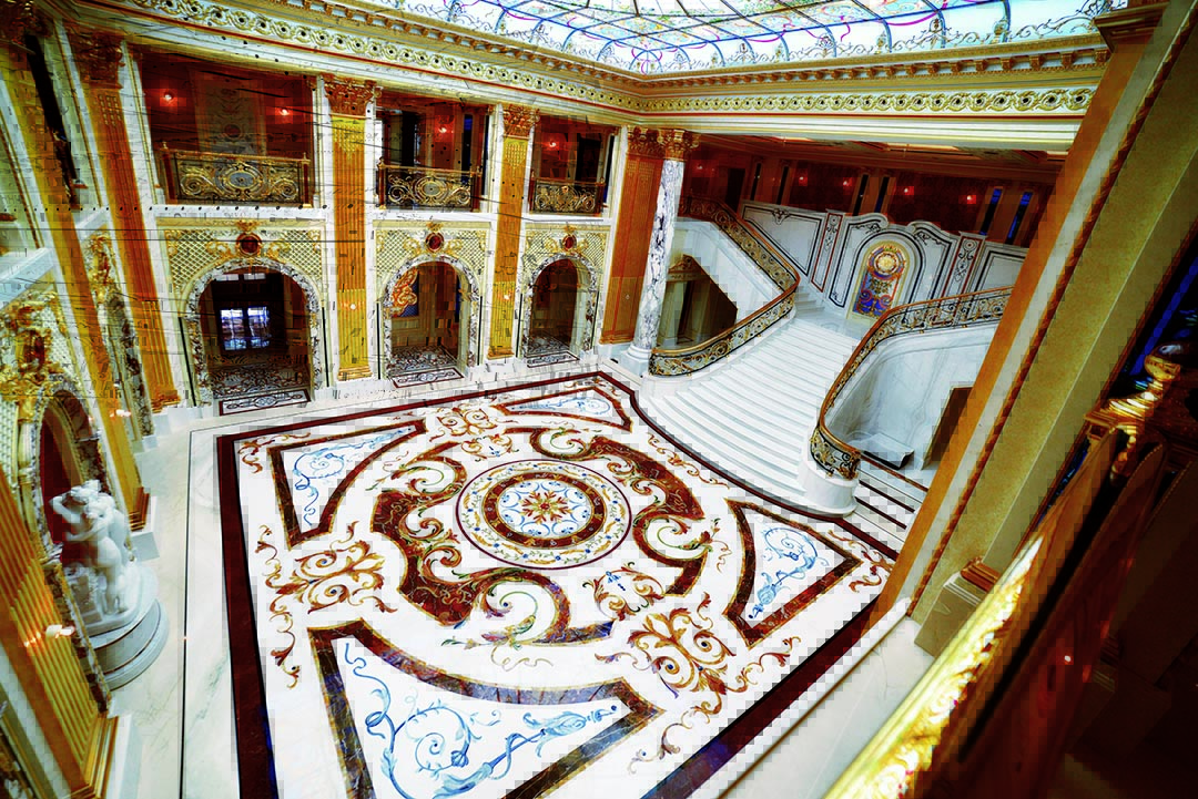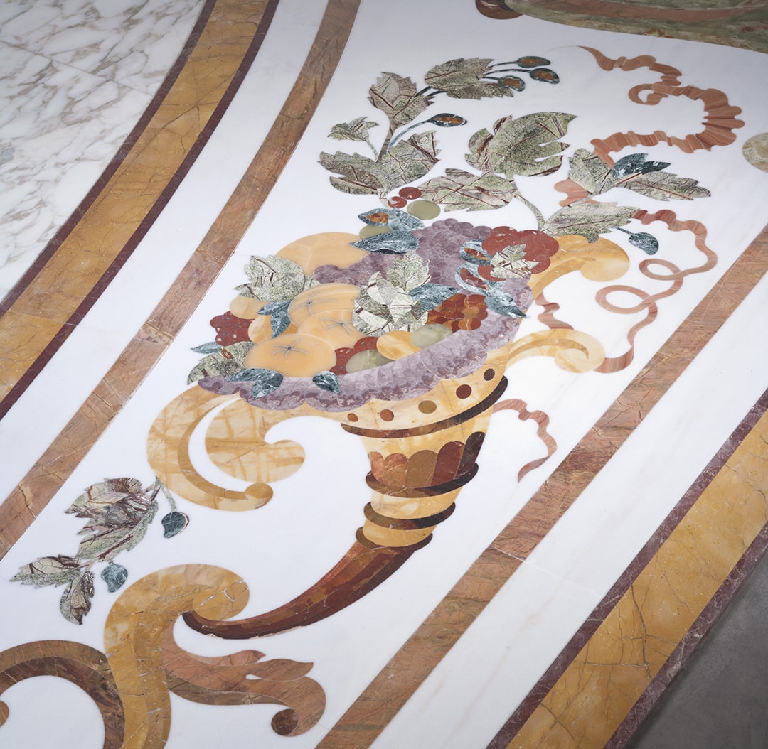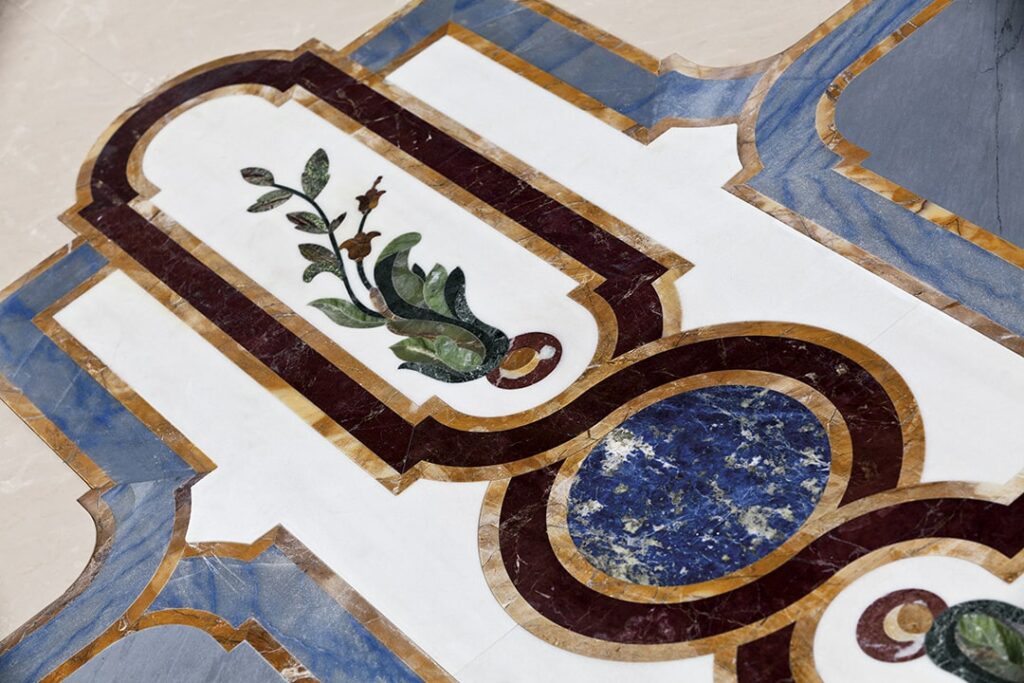 and the fountains, statues and columns. The extensive decorations were complex in their implementation due to the large surface area and the many artistically inlaid floor and wall facings, all different from each other and perfectly consistent with the style of each room.