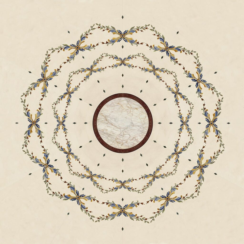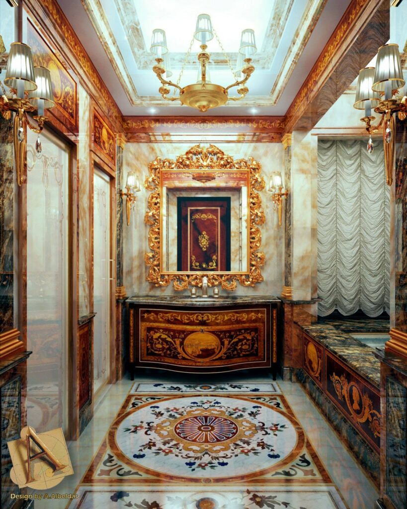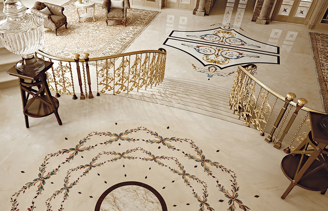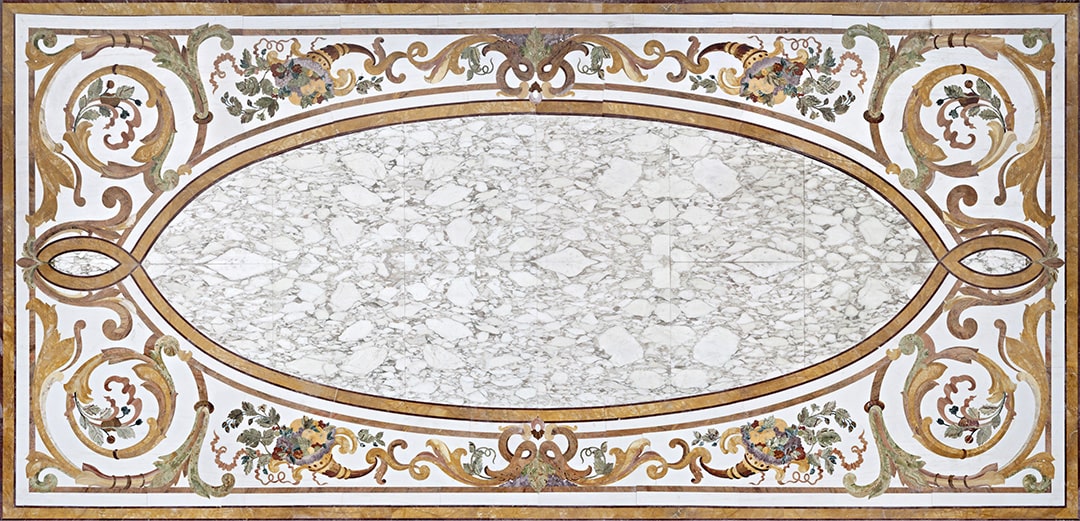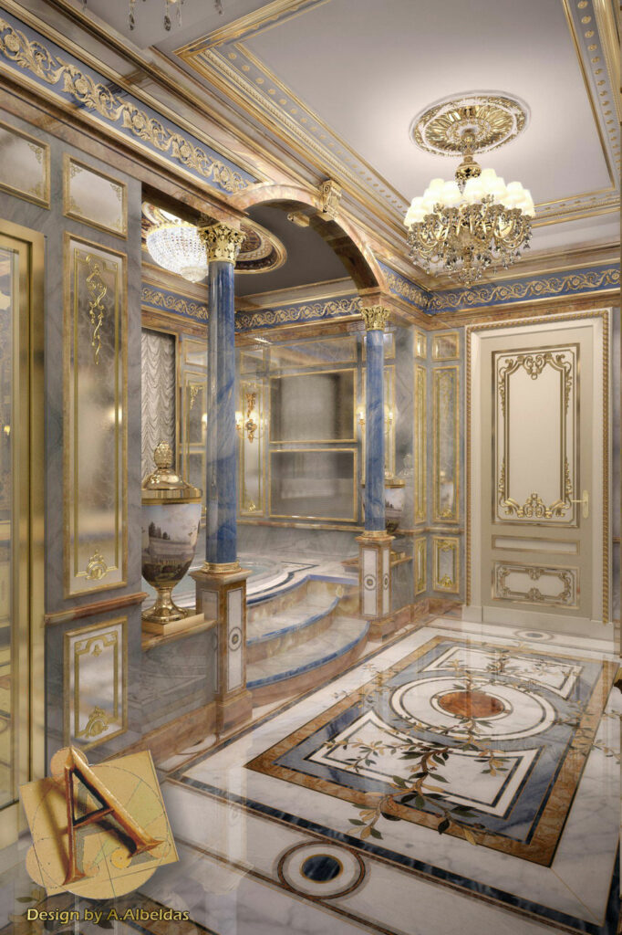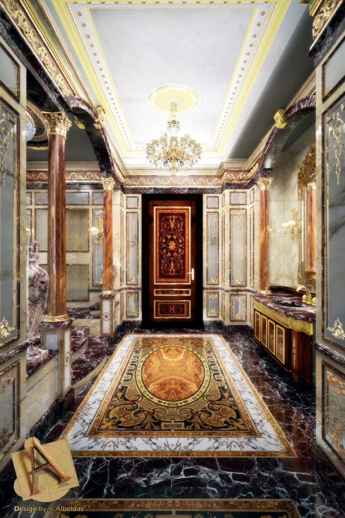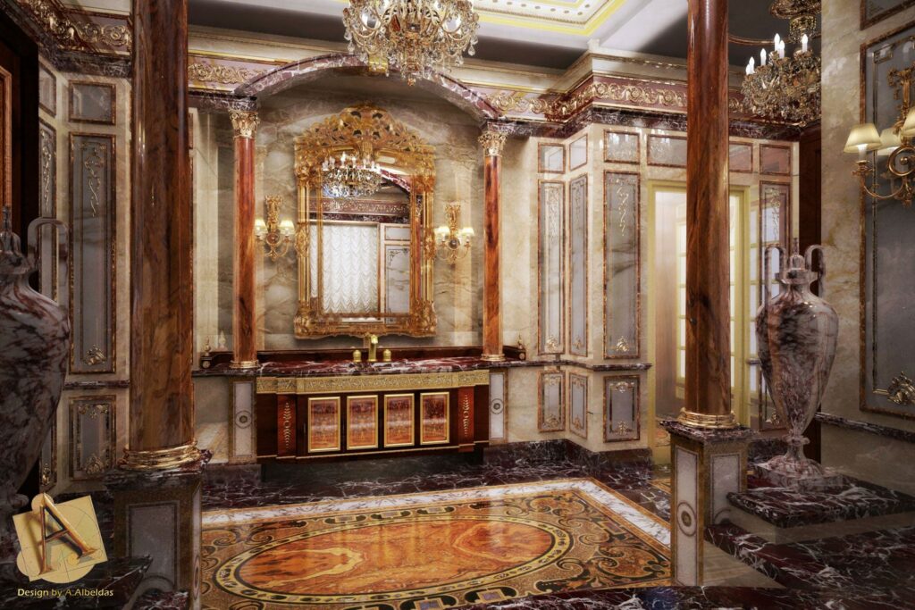 and the fountains, statues and columns. The extensive decorations were complex in their implementation due to the large surface area and the many artistically inlaid floor and wall facings, all different from each other and perfectly consistent with the style of each room.
