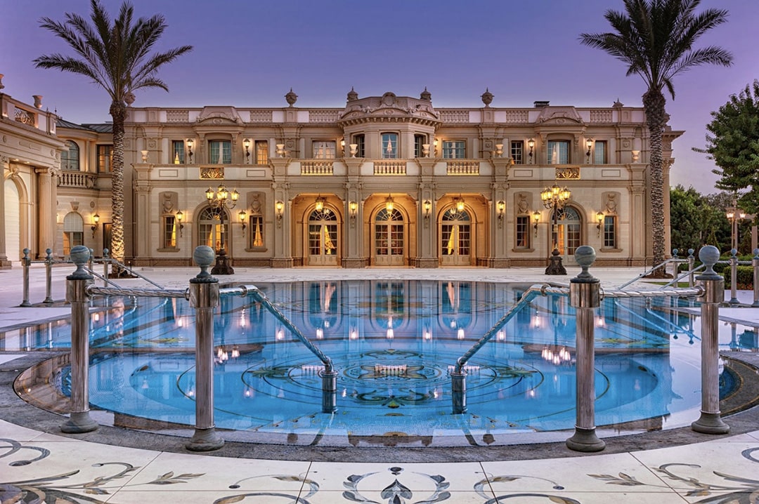 The property, which consists of a main building, an adjoining spa building and a guest house, covers an inhabitable area of 13,000 m2. The sumptuous main residence (spread over 6,400 m2 / 69,000 ft2) has numerous bedrooms with luxurious bathrooms, a spa with a steam room, gym, indoor and outdoor pools, wine cellar, billiard room, and home cinema, to name just a few of the facilities.