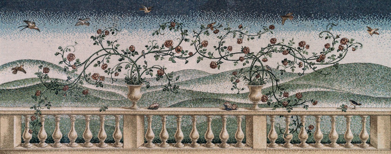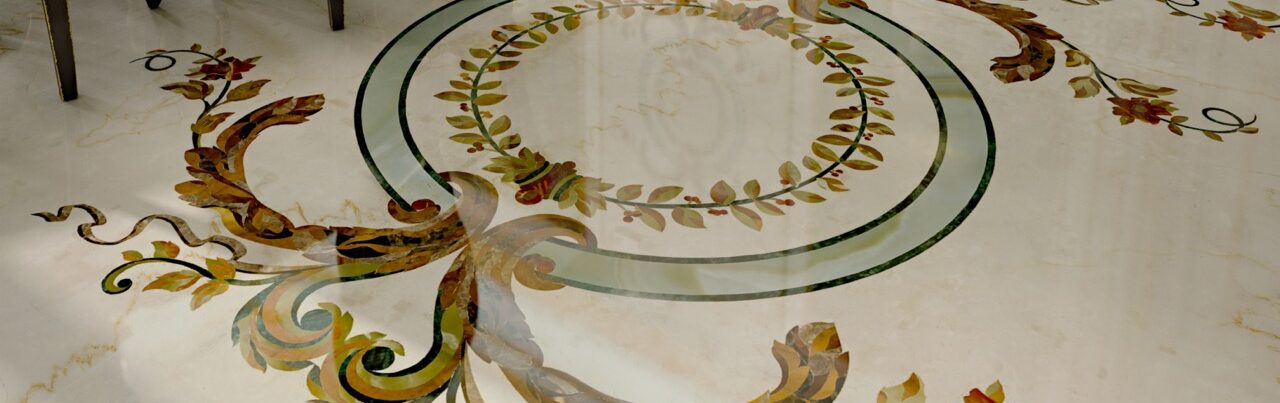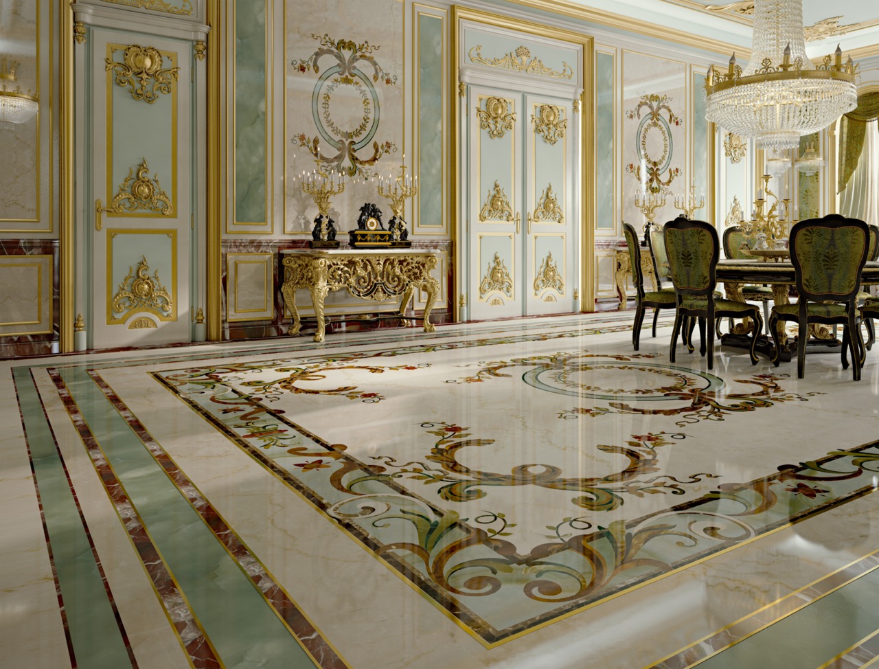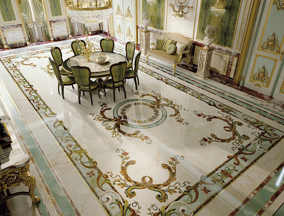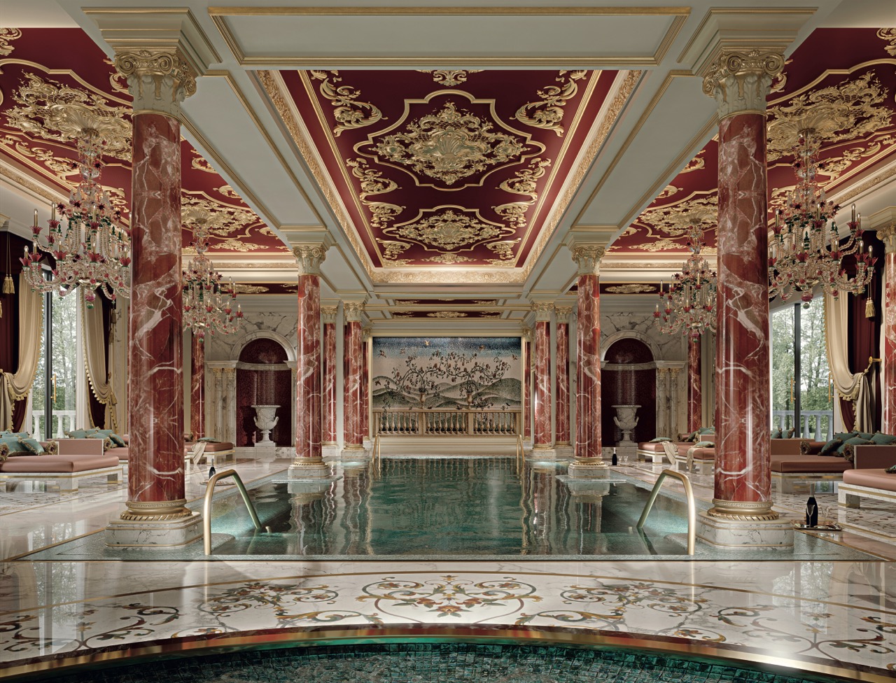 The large spa is embellished with inlaid flooring and a large artistic mosaic representing a balustrade and cachepot with a rose garden. The inlay floor in the dining room features onyxes in warm tones, such as Jade Green onyx combined with marbles such as Siena Yellow, Crema Impero and Sicilian Jasper.