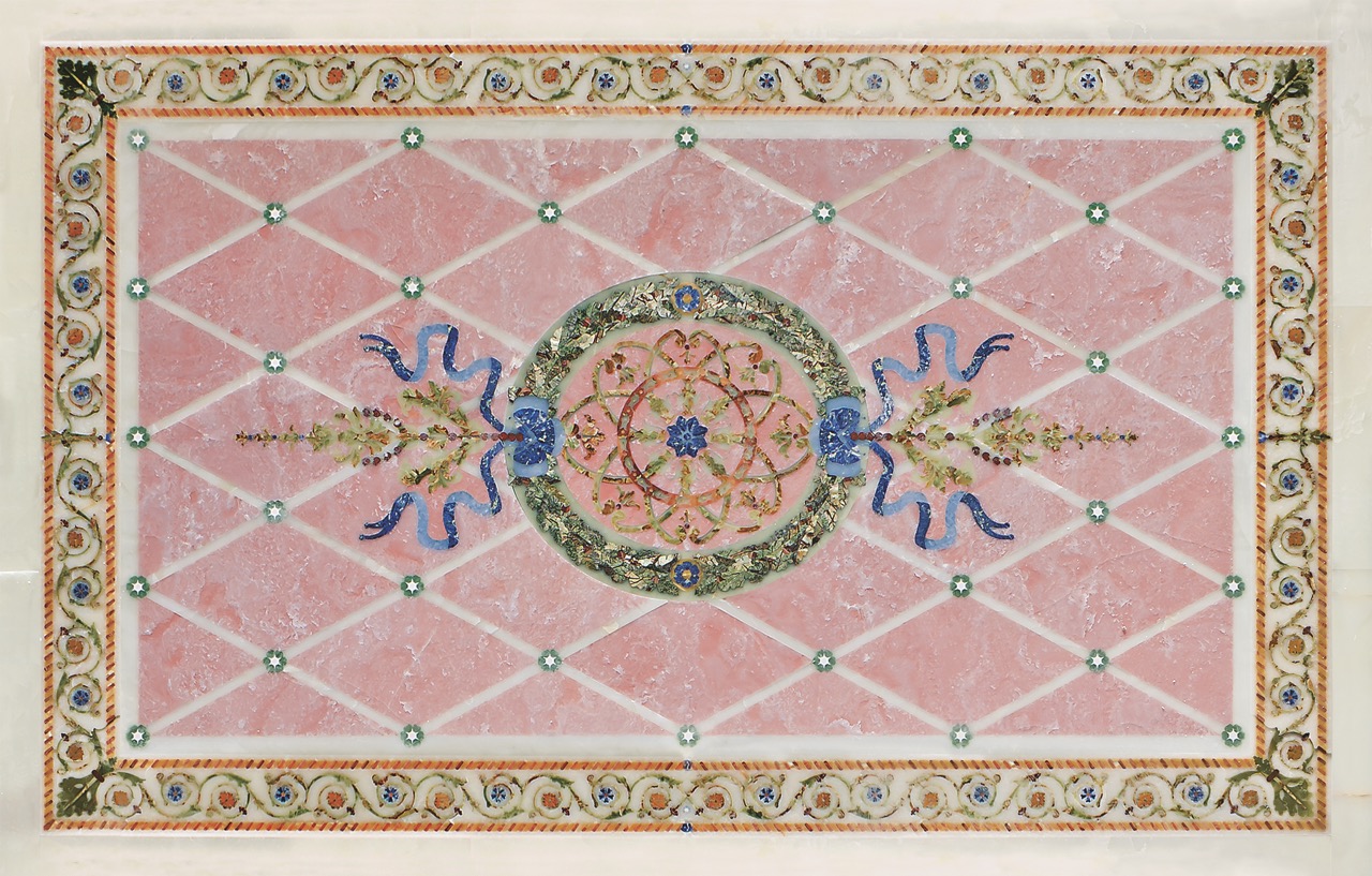 Equally luxurious are the bathrooms, such as the master bathroom, which is entirely clad in Pink Onyx, with inlaid perimeter frames and central medallions. Pastel-coloured onyxes include Honey Onyx, Jade Onyx and White Onyx.