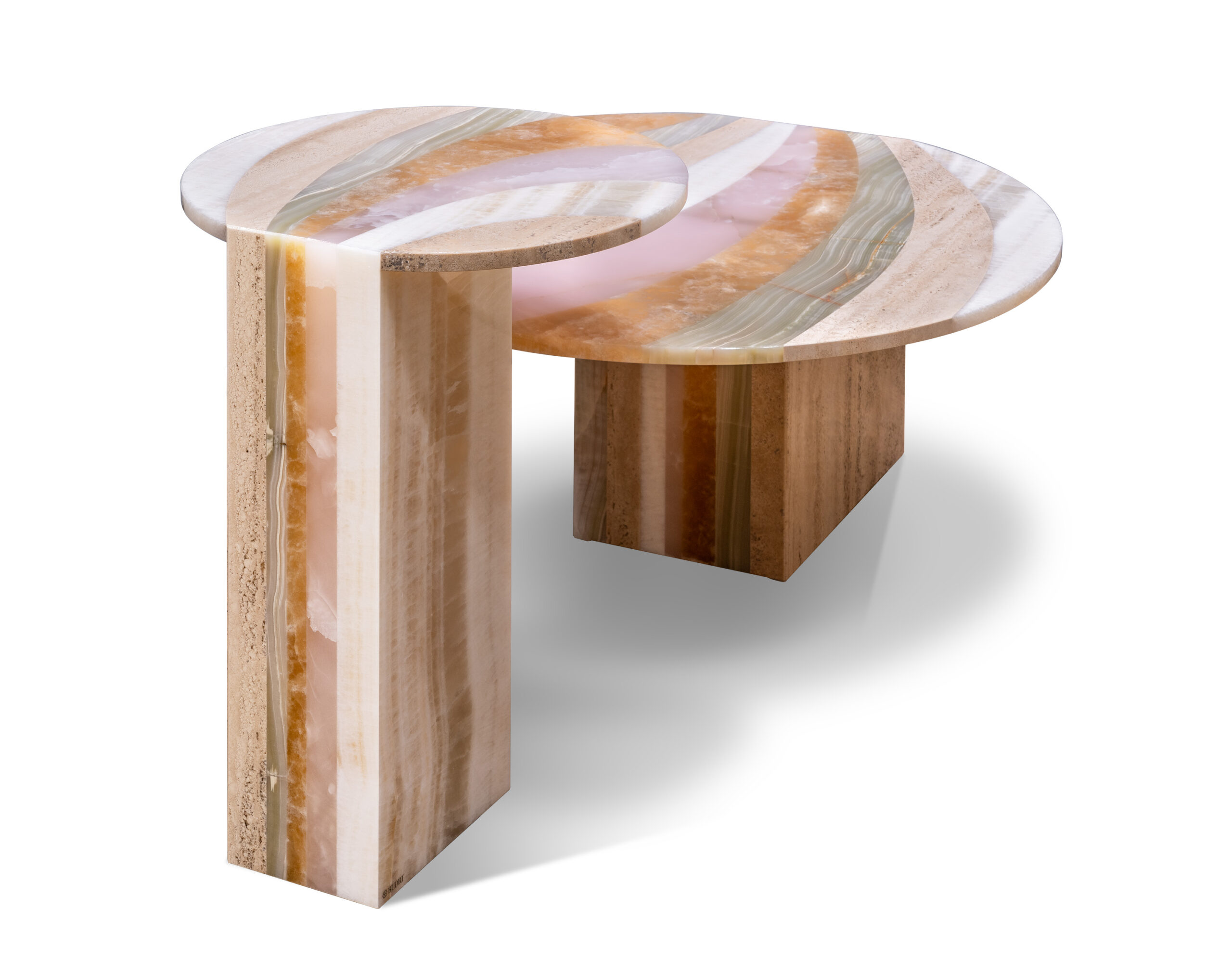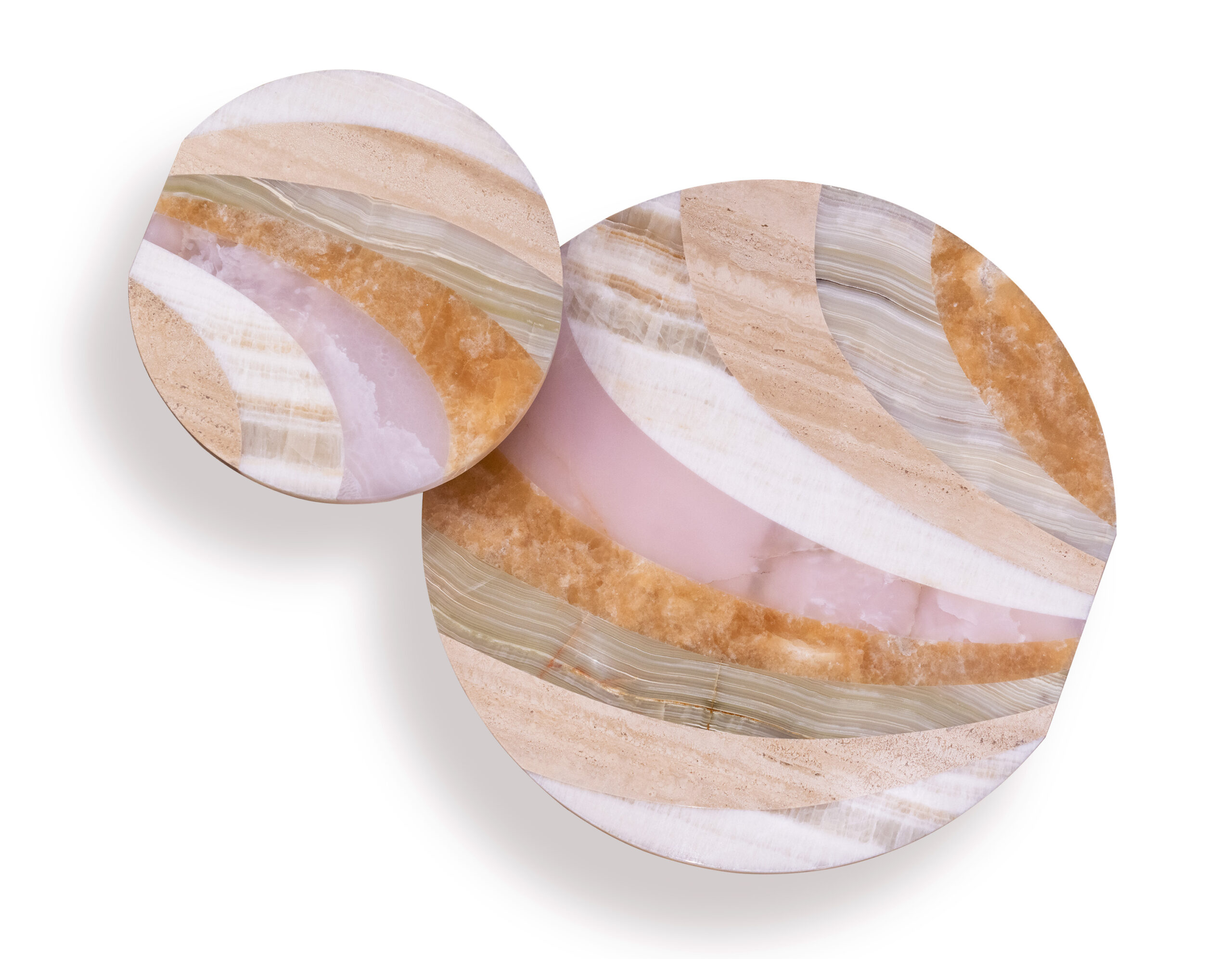 Patricia UrquiolaEdizione Aquarel degli iconici Coffee Table Marea, un raffinato esercizio di toni e gradazioni cromatiche in tonalità pastello. Si presentano in coppia con altezze e diametri diversi. La particolarità è espressa attraverso la continuità grafica del top circolare e del piede di forma monolitica. I marmi Travertino Romano Classico, Onice Rosa, Onice Miele, Onice Ivory, Onice Afghano presentano venature pittoriche e soavi trasparenze, elementi che rendono i complementi protagonisti in uno spazio.
