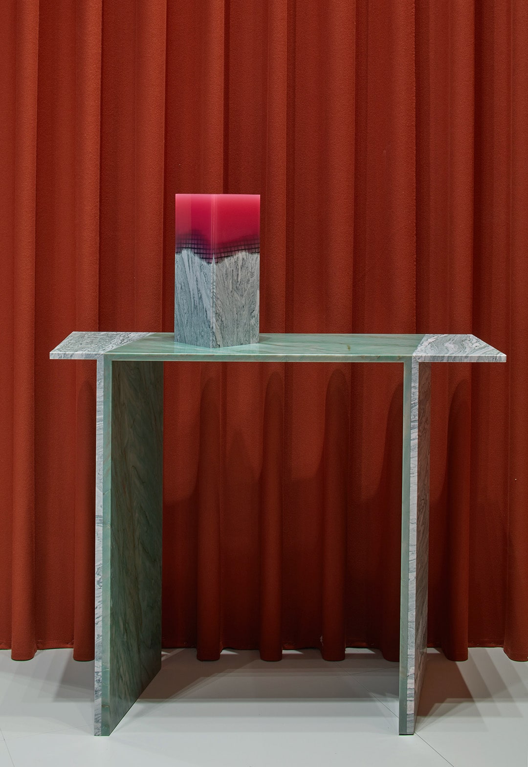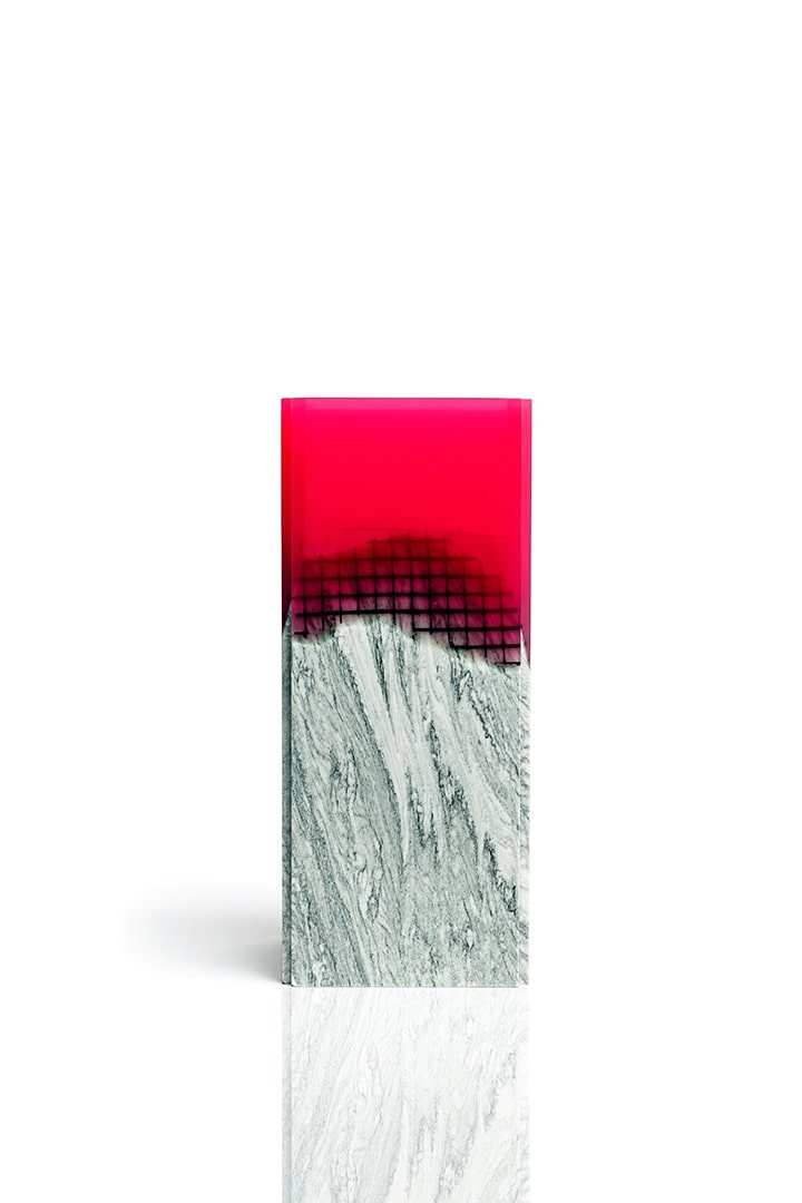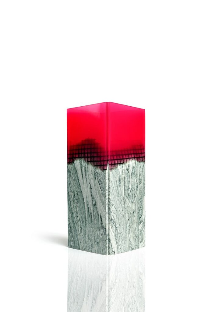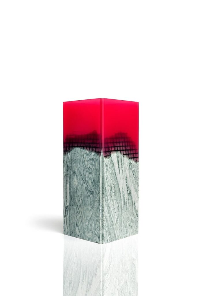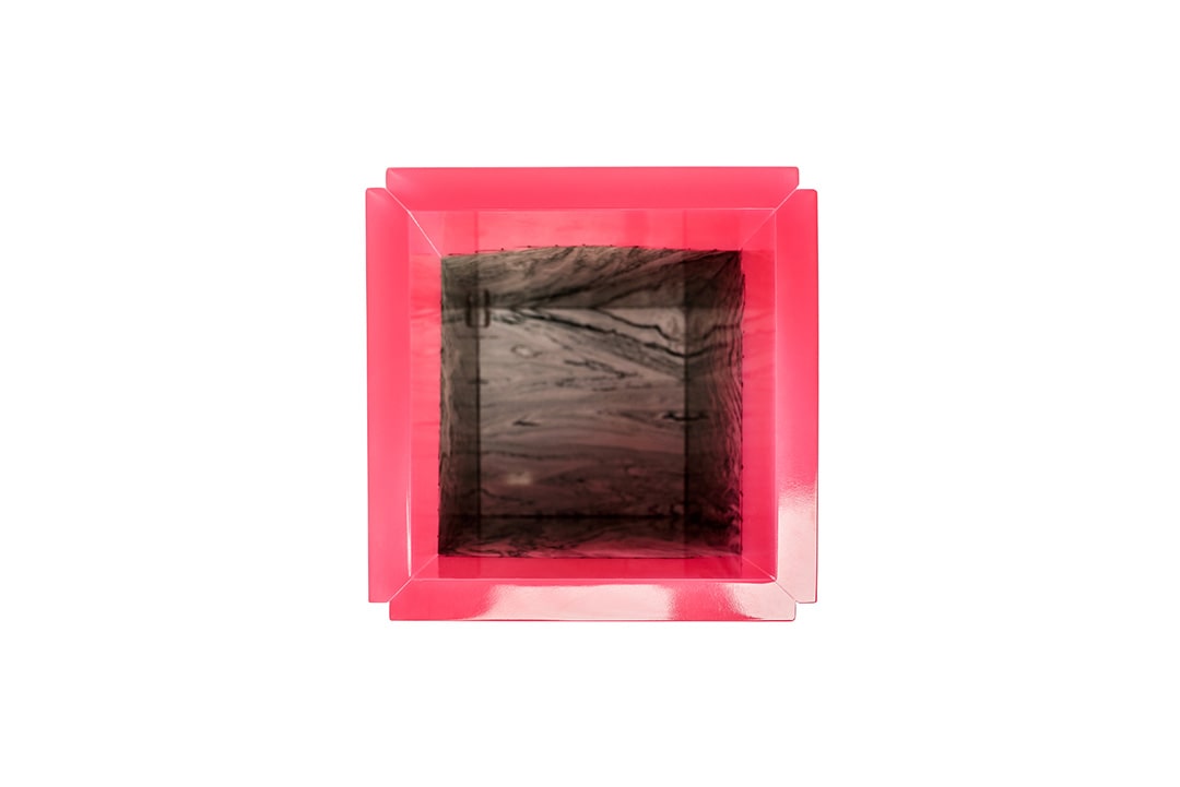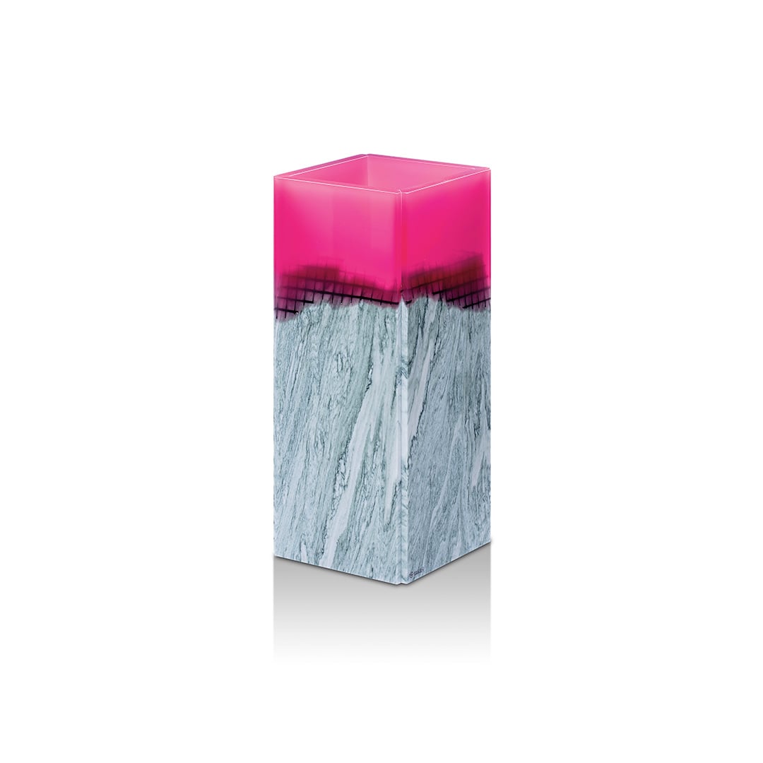 Patricia UrquiolaQuesta tipologia di vasi appartiene alla famiglia Orilla. La base si presenta in marmo Verde Cipollino, materiale di forte grafismo pittorico abbinato a resina rosa fluo. Il deciso disegno della pietra contrasta con la trasparenza della resina colorata.