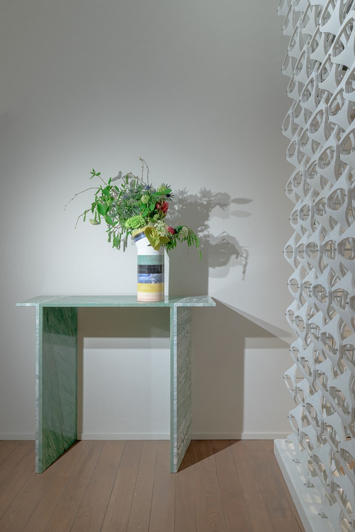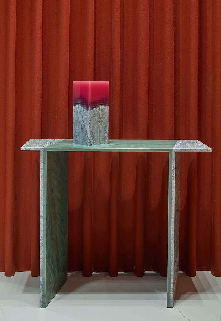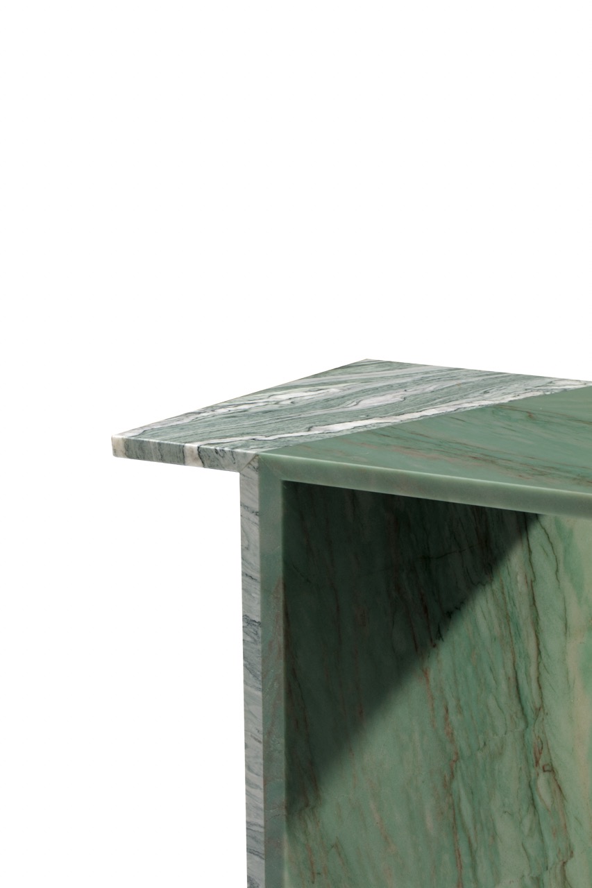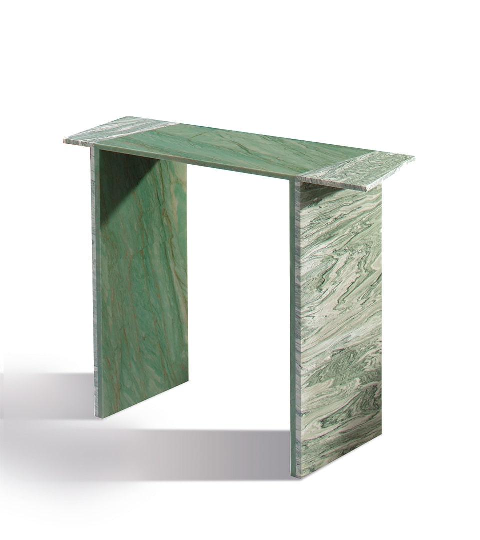 Patricia UrquiolaDi forte connotazione grafica, Orilla Consolle è realizzata in Verde Cipollino e Verde Acquamarina. Il piano presenta continuità grafica con i piedi posti in diagonale.