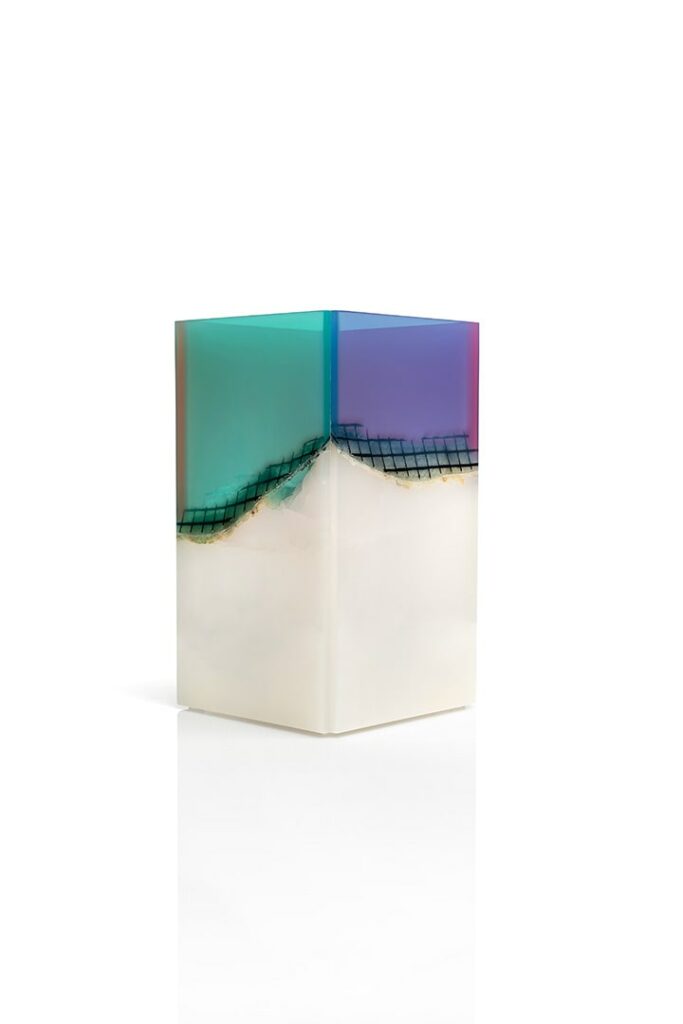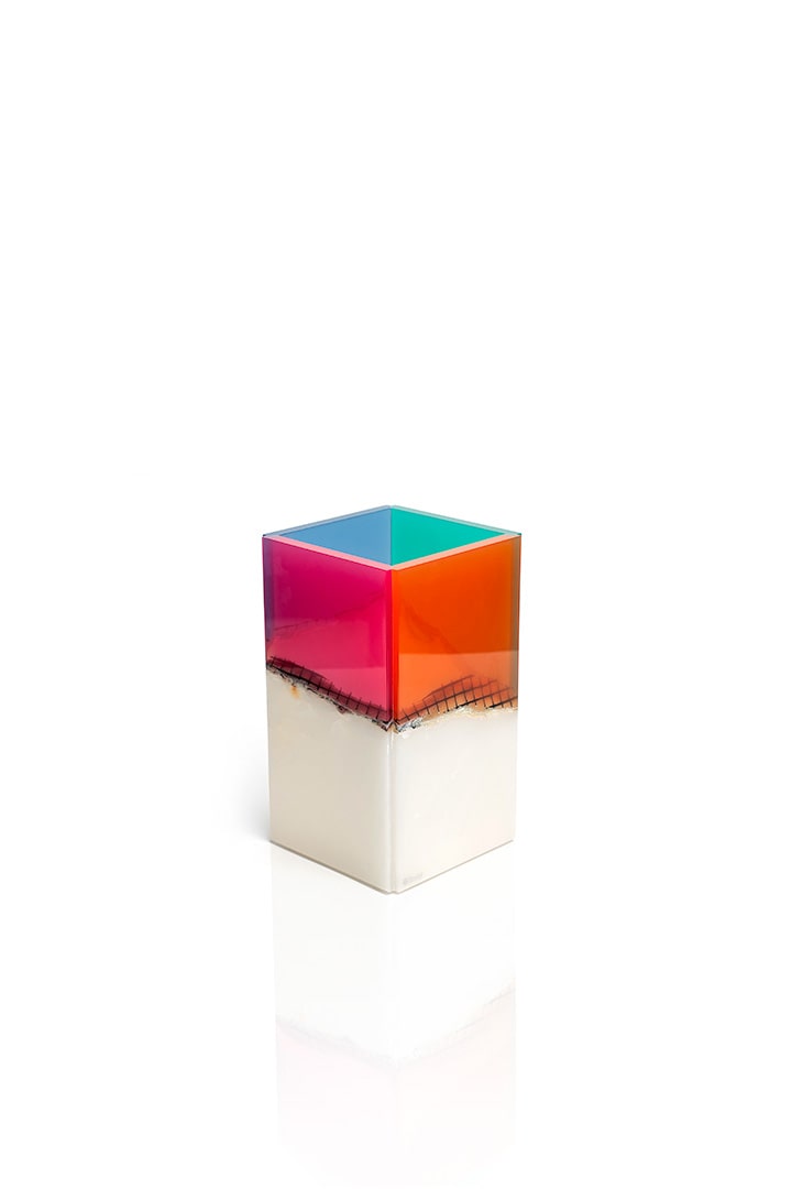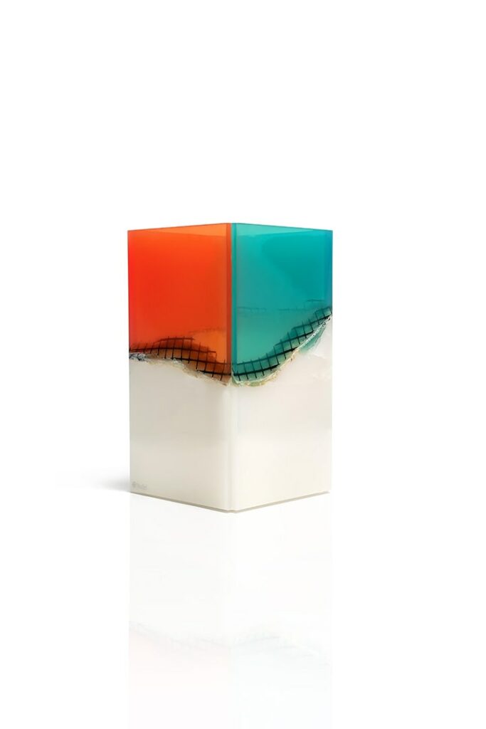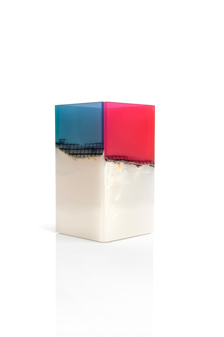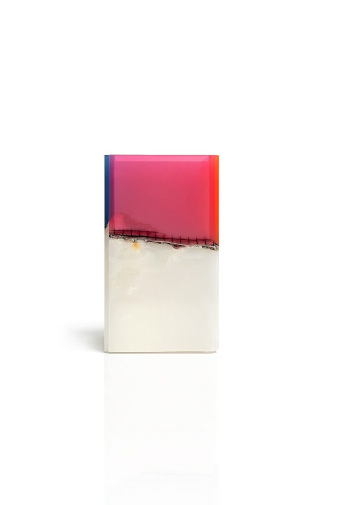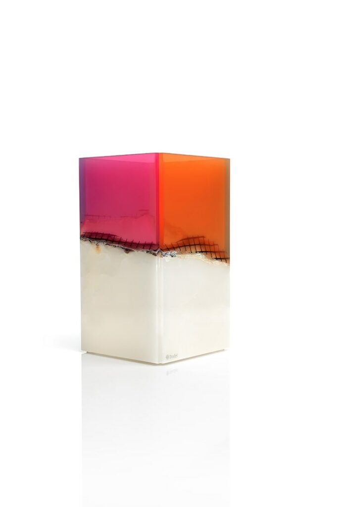 Patricia UrquiolaI vasi Orilla, in spagnolo ‘riva’ si ispirano alla riva del mare e alla limpidezza delle acque marine. Disponibili in tre diverse altezze, i vasi sono realizzati in prezioso Onice Bianco iraniano, apprezzato per la sua purezza e la sua stupefacente trasparenza. La presenza della rete nera, che spicca dall’Onice Bianco, è cicatrice della lastra originale dalla quale esso viene estratto. Le resine di quattro colori, verde smeraldo, blu indaco, rosso corallo e rosa fluo creano un forte contrasto, un gioco di luci e trasparenze che si sovrappongono nelle diverse prospettive. La combinazione di diverse altezze consente di creare un giochi di forme e volumi.