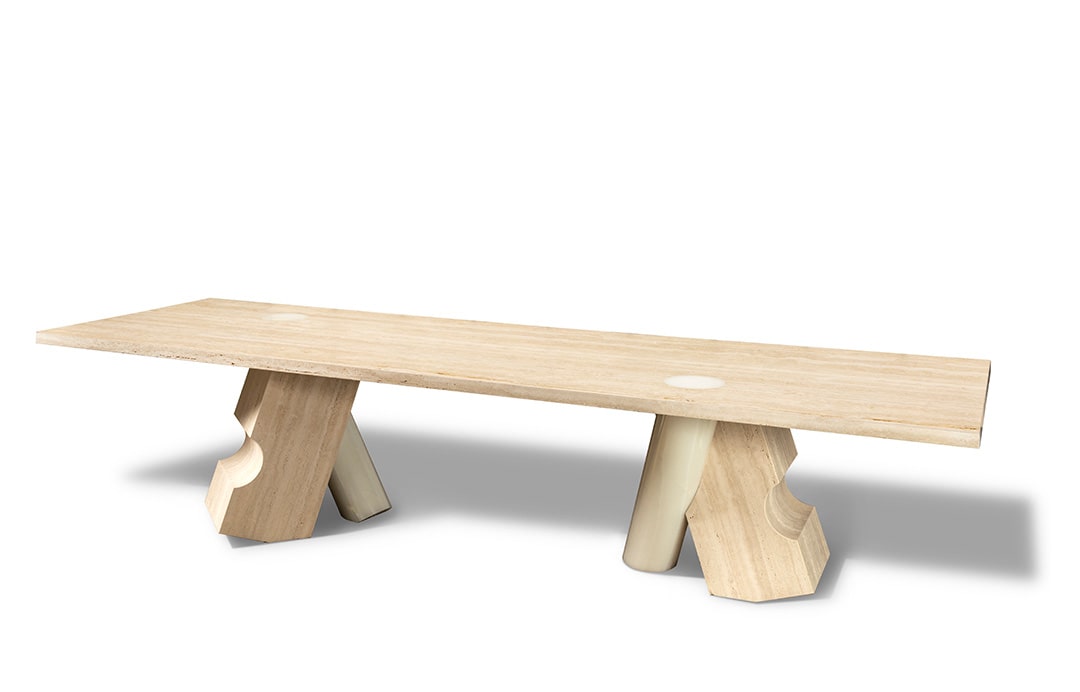 Patricia UrquiolaTavolo scultoreo in marmo Travertino Classico (a poro aperto, lucido), con elementi delle gambe in Onice Bianco Iraniano (lucido).
