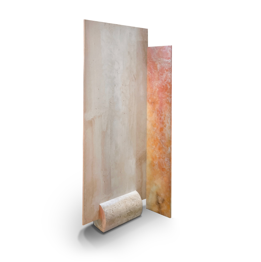 Patricia UrquiolaParavento in Travertino Classico Romano (finitura a poro aperto, lucidato) e Onice Aquarel Multicolor (finitura lucida), con base cilindrica in Travertino Classico Romano (finitura a poro aperto). Possibilità di combinare più Paravent per creare separè delle dimensioni desiderate.
