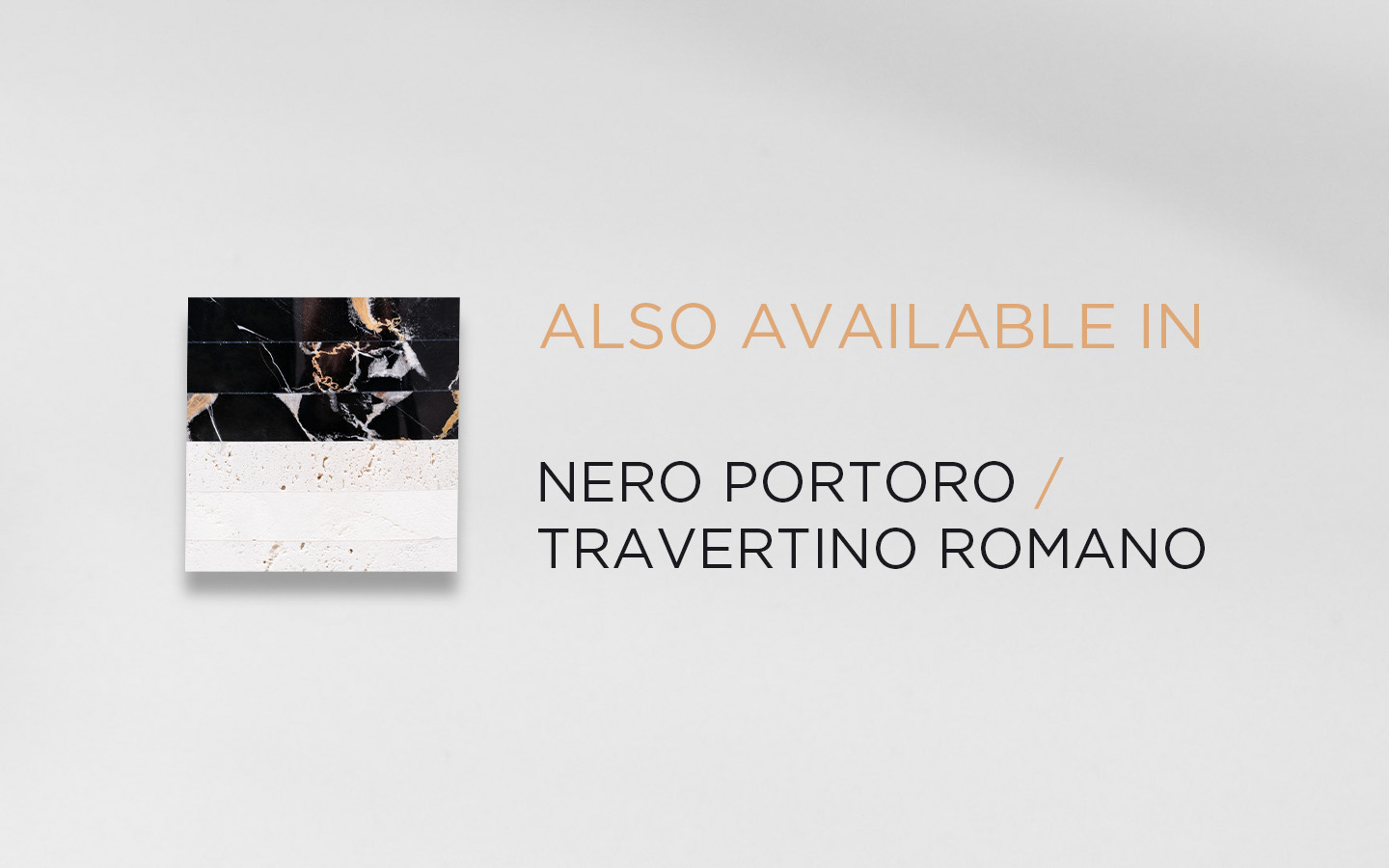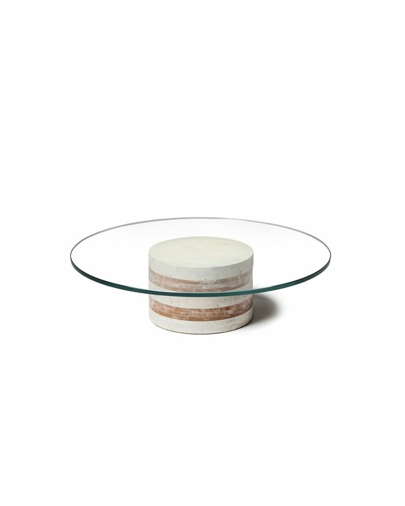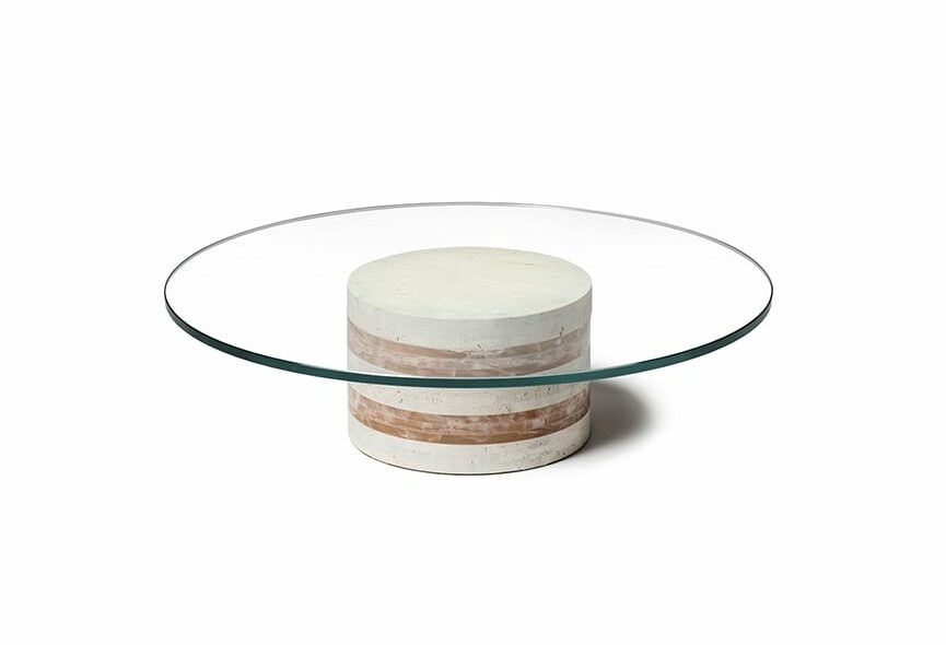 Patricia UrquiolaTavolo circolare con colonna centrale di marmo a righe in Travertino Classico e Onice Peach. Piano in vetro extra-chiaro. Disponibile anche nelle variante Travertino Classico e Nero Portoro.