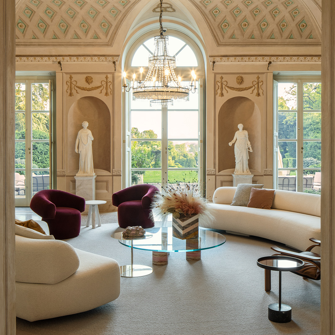 rincorrono e culminano nei tre cerchi superiori, esaltati dalla trasparenza del piano in vetro extra-clear.
