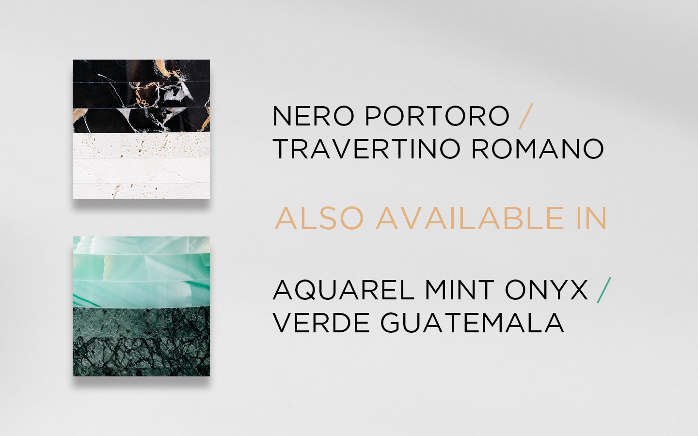 Disponibile anche nelle varianti in Nero Portoro e Travertino Classico Romano a poro aperto e in Verde Guatemala e Aquarel Mint Onyx.