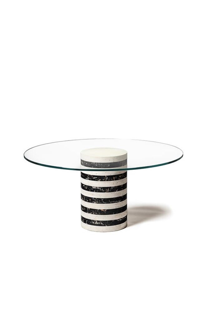 Patricia UrquiolaTavolo Living con colonna centrale in Nero Portoro e Travertino Classico sabbiato a poro aperto. Piano del tavolo in vetro temperato extra chiaro.