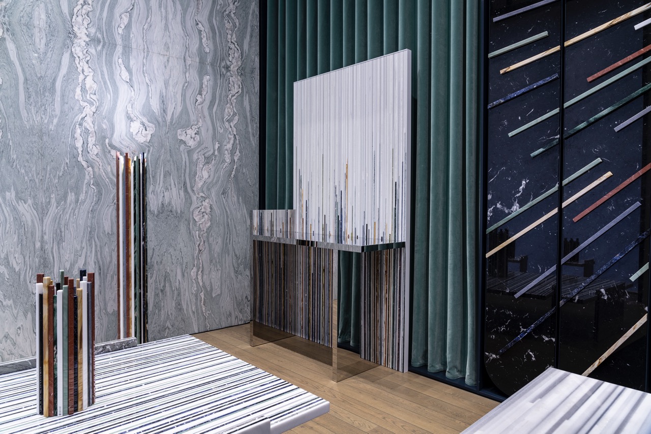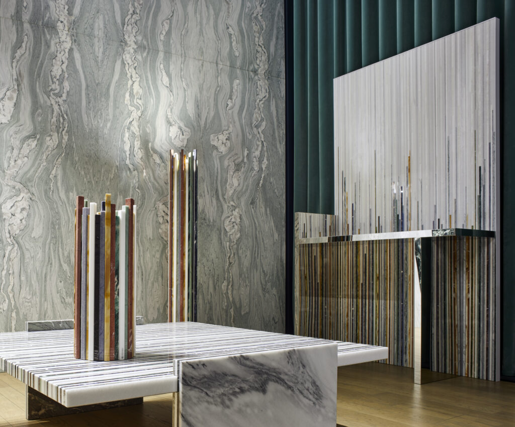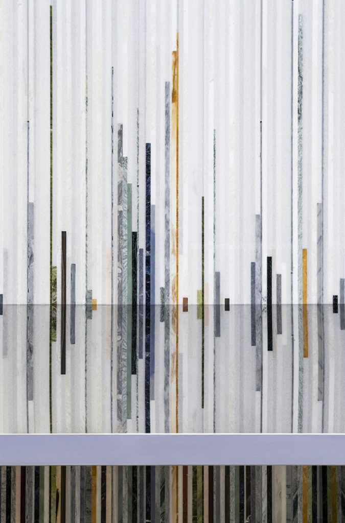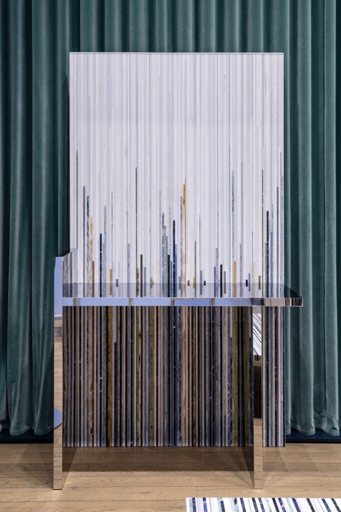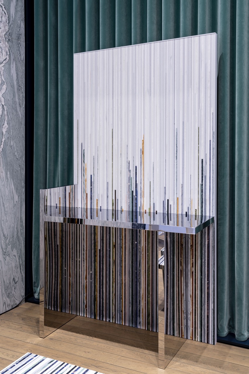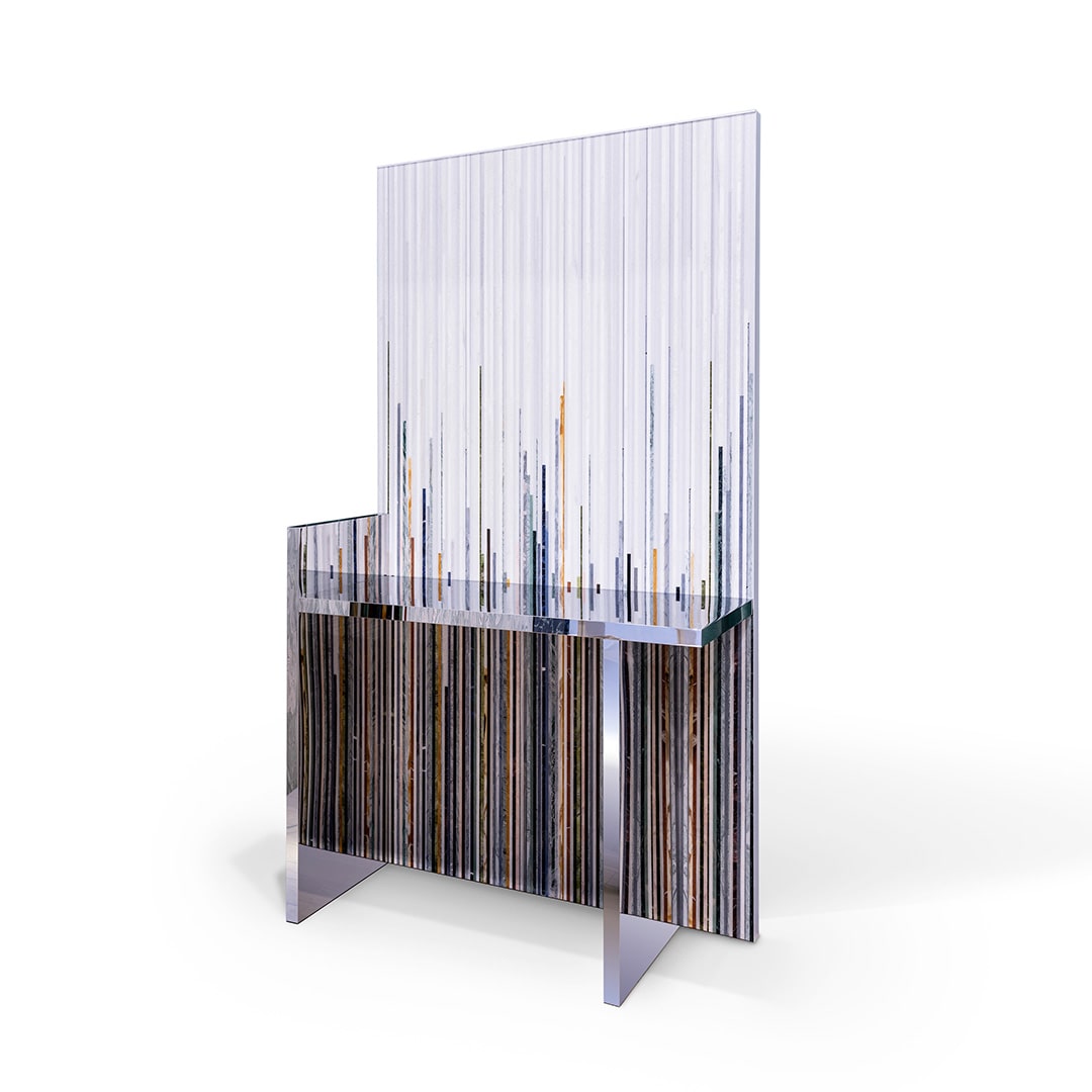 Gwenael NicolasConsolle composta da un rivestimento autoportante in marmi policromi, effetto millerighe: Il piano e piede sono realizzati in metallo specchiato e creano creando una sorprendente continuità grafica riflessa.