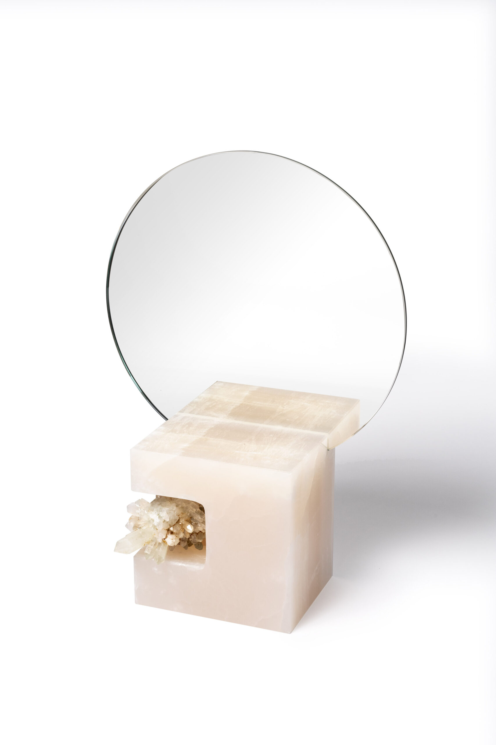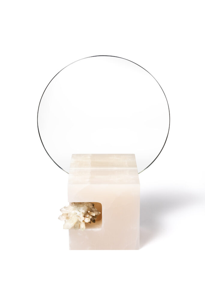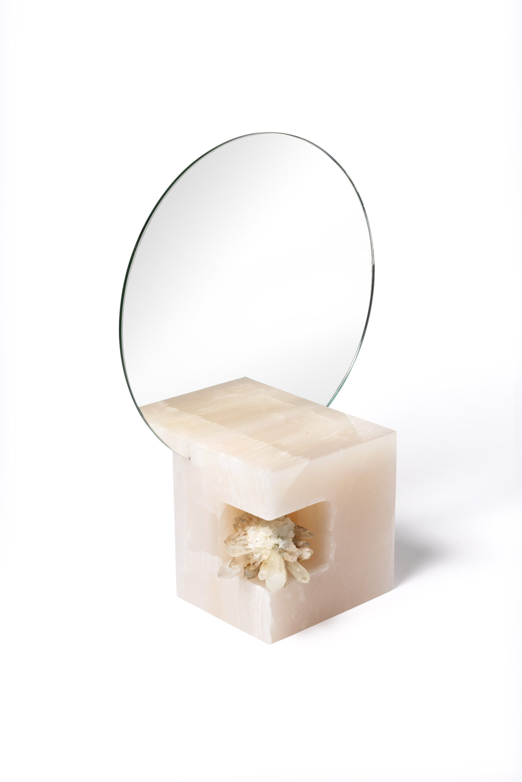 Geodie Mirror in Onice Rosa è un pezzo unico realizzato con un geode di quarzo policromo incastonato, come un gioiello, in un parallelepipedo in onice rosa. Lo specchio nella parte alta riflette l’immagine del prezioso geode, mettendo in luce tutte le sfaccettature dei minerali.tipo di marmo