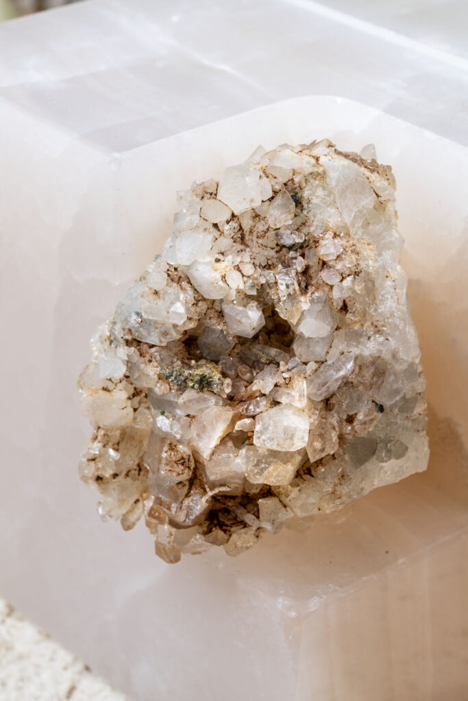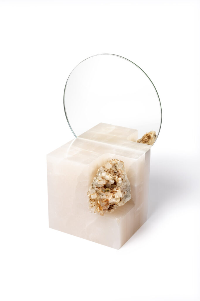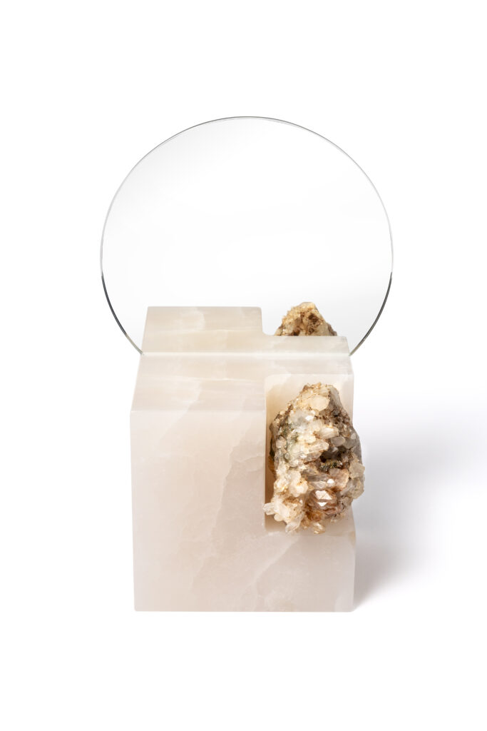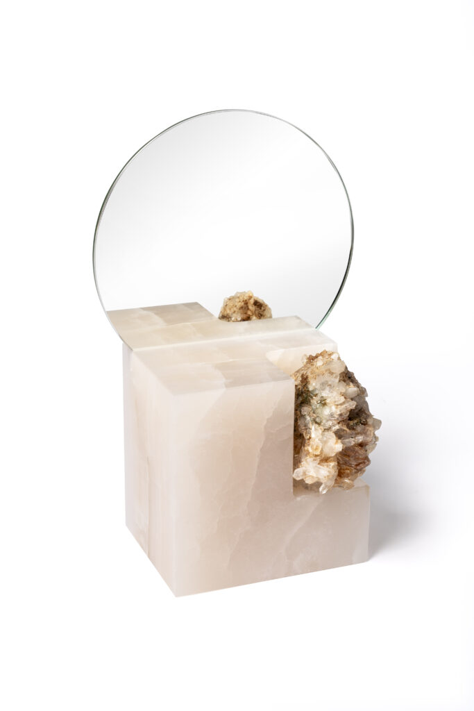 Geodie Mirror in Onice Rosa è un pezzo unico realizzato con un geode di quarzo policromo incastonato, come un gioiello, in un parallelepipedo in onice rosa. Lo specchio nella parte alta riflette l’immagine del prezioso geode, mettendo in luce tutte le sfaccettature dei minerali.tipo di marmo