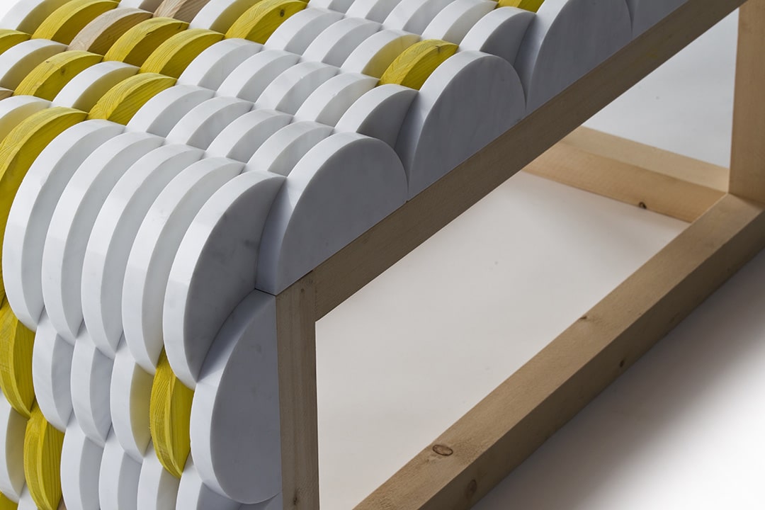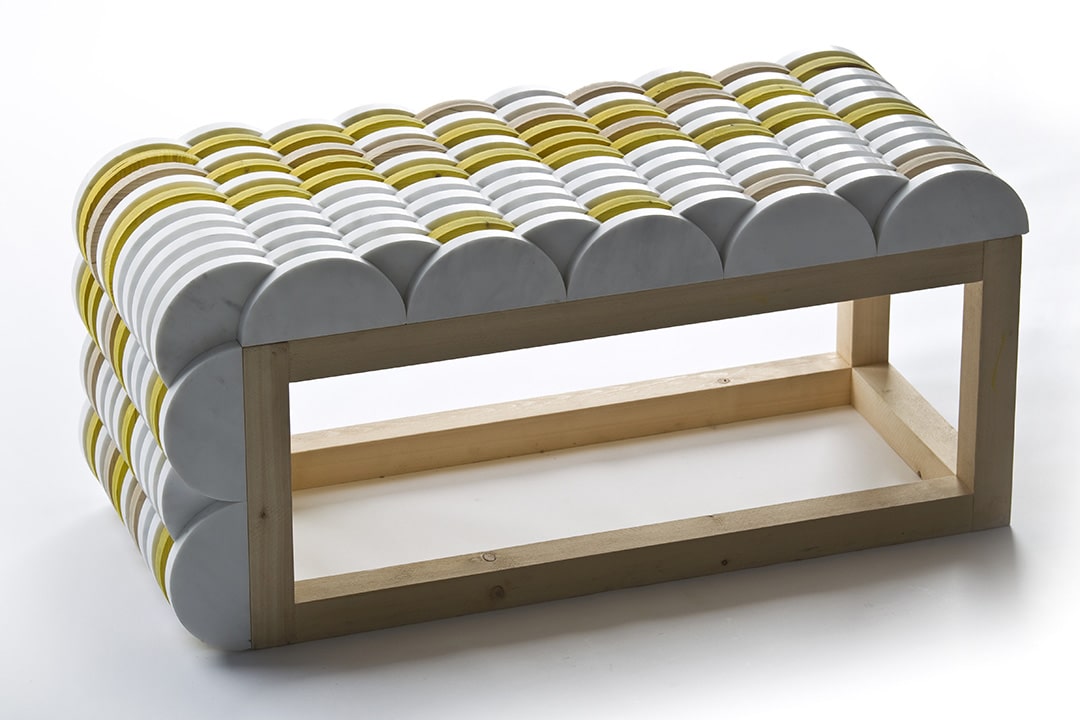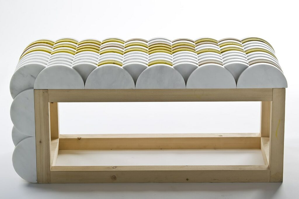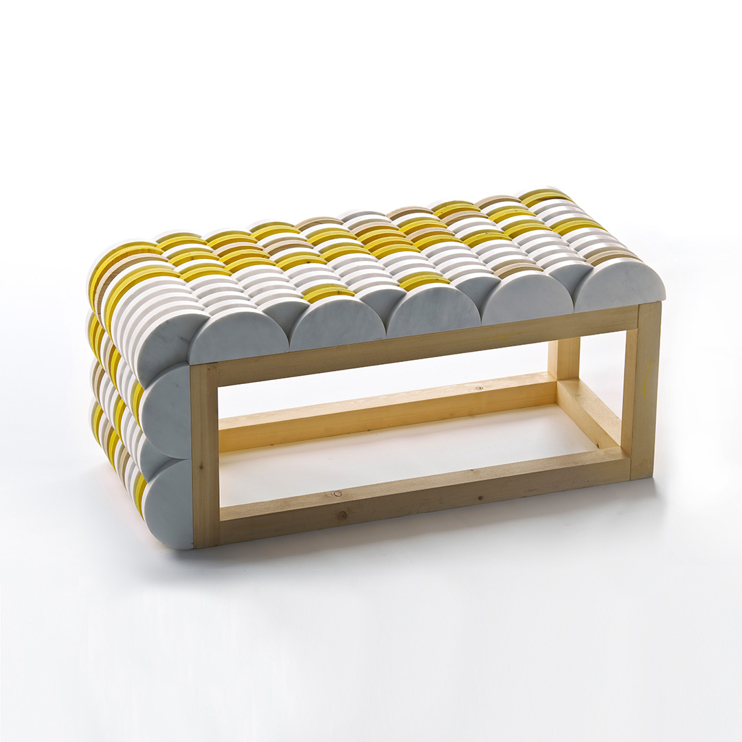 Patricia UrquiolaPanca e sgabello sono realizzati in marmo Bianco Lasa, faggio naturale e tinto giallo fluo; la struttura di sostegno è in faggio naturale. La seduta, composta da semicerchi sfalsati che alternano legno e marmo, compone una trama rigida ma estremamente confortevole. A completare la collezione, lo sgabello con lo stesso motivo a semicerchi rovesciati, a formare una seduta piana.