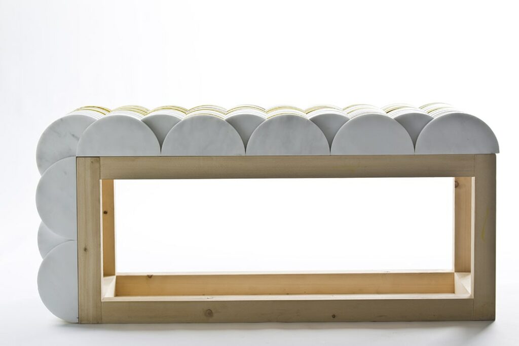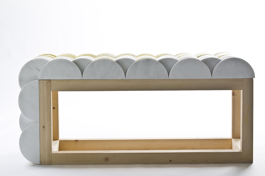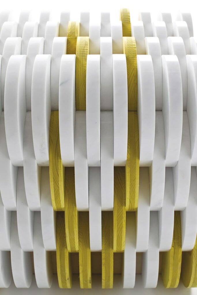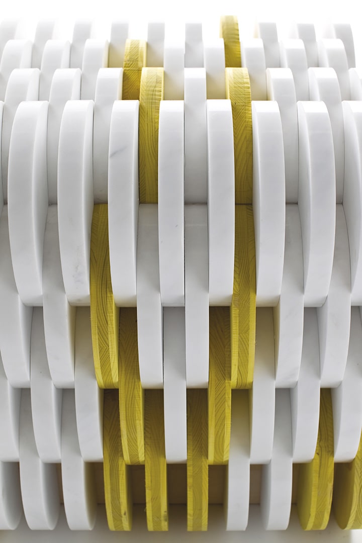 Patricia UrquiolaPanca e sgabello sono realizzati in marmo Bianco Lasa, faggio naturale e tinto giallo fluo; la struttura di sostegno è in faggio naturale. La seduta, composta da semicerchi sfalsati che alternano legno e marmo, compone una trama rigida ma estremamente confortevole. A completare la collezione, lo sgabello con lo stesso motivo a semicerchi rovesciati, a formare una seduta piana.