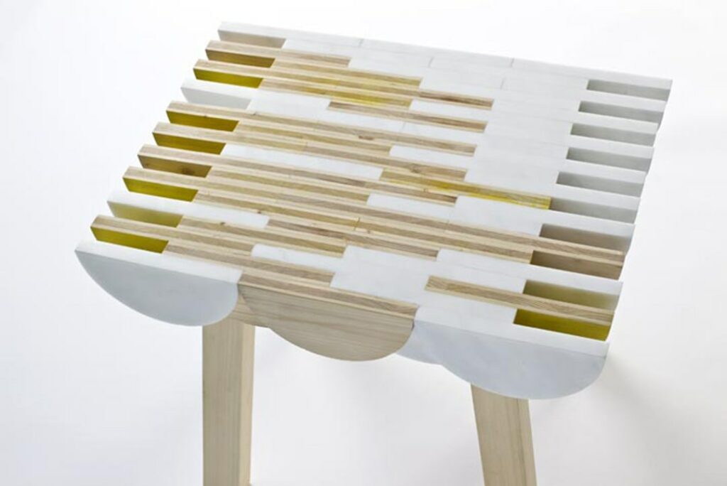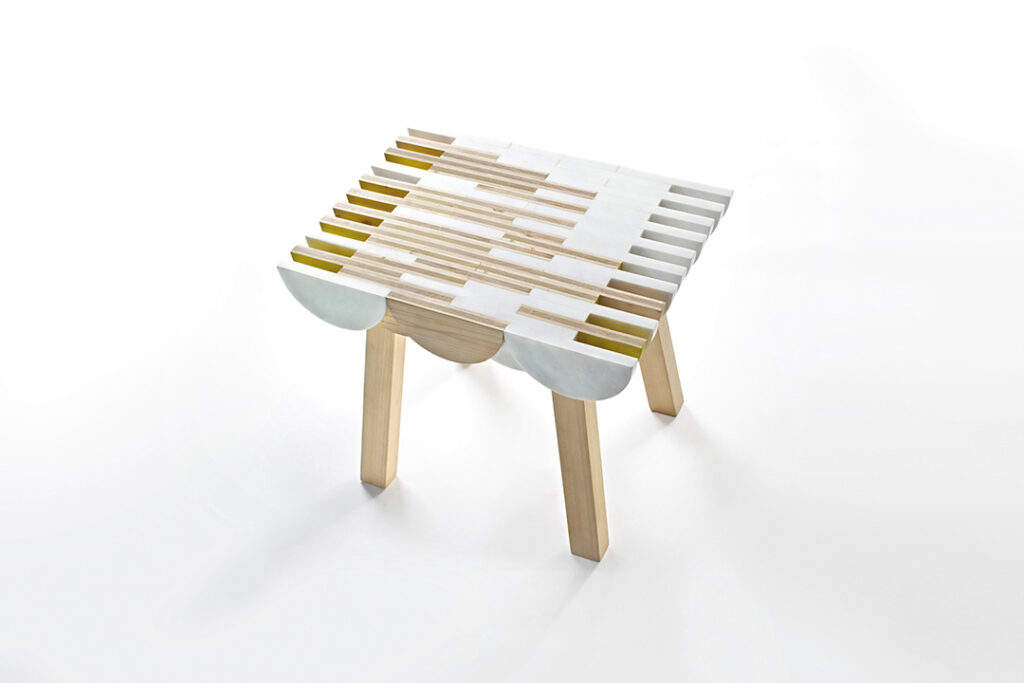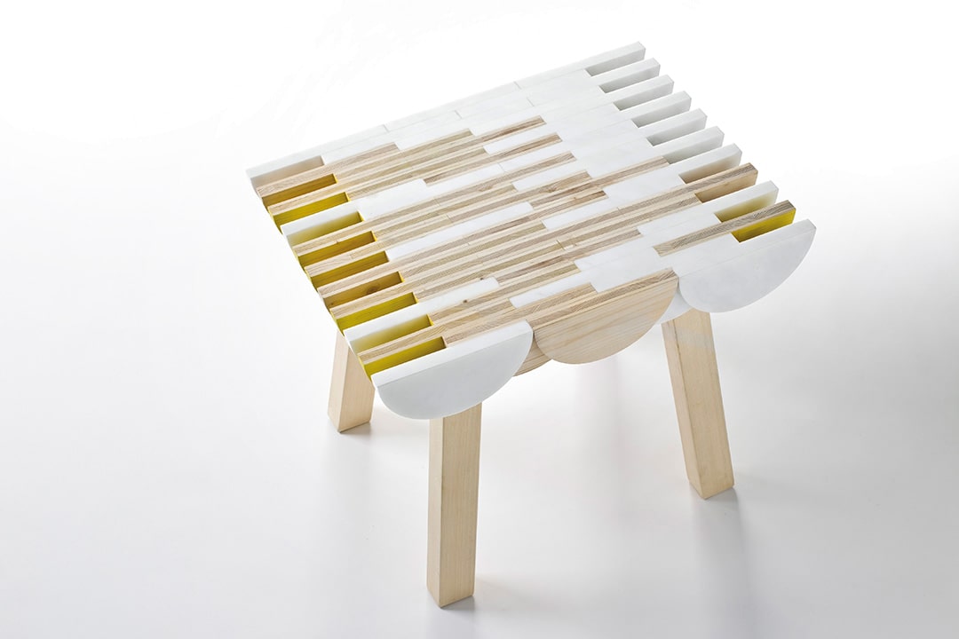Patricia UrquiolaPanca e sgabello sono realizzati in marmo Bianco Lasa, faggio naturale e tinto giallo fluo; la struttura di sostegno è in faggio naturale. La seduta, composta da semicerchi sfalsati che alternano legno e marmo, compone una trama rigida ma estremamente confortevole. A completare la collezione, lo sgabello con lo stesso motivo a semicerchi rovesciati, a formare una seduta piana.