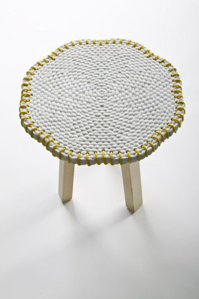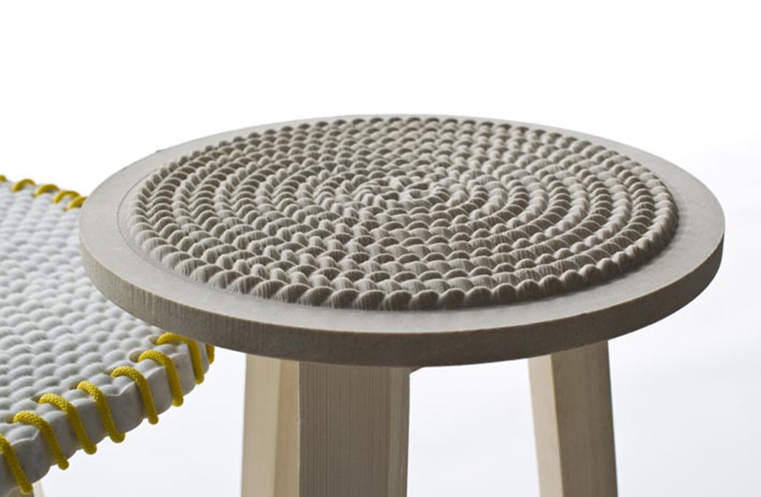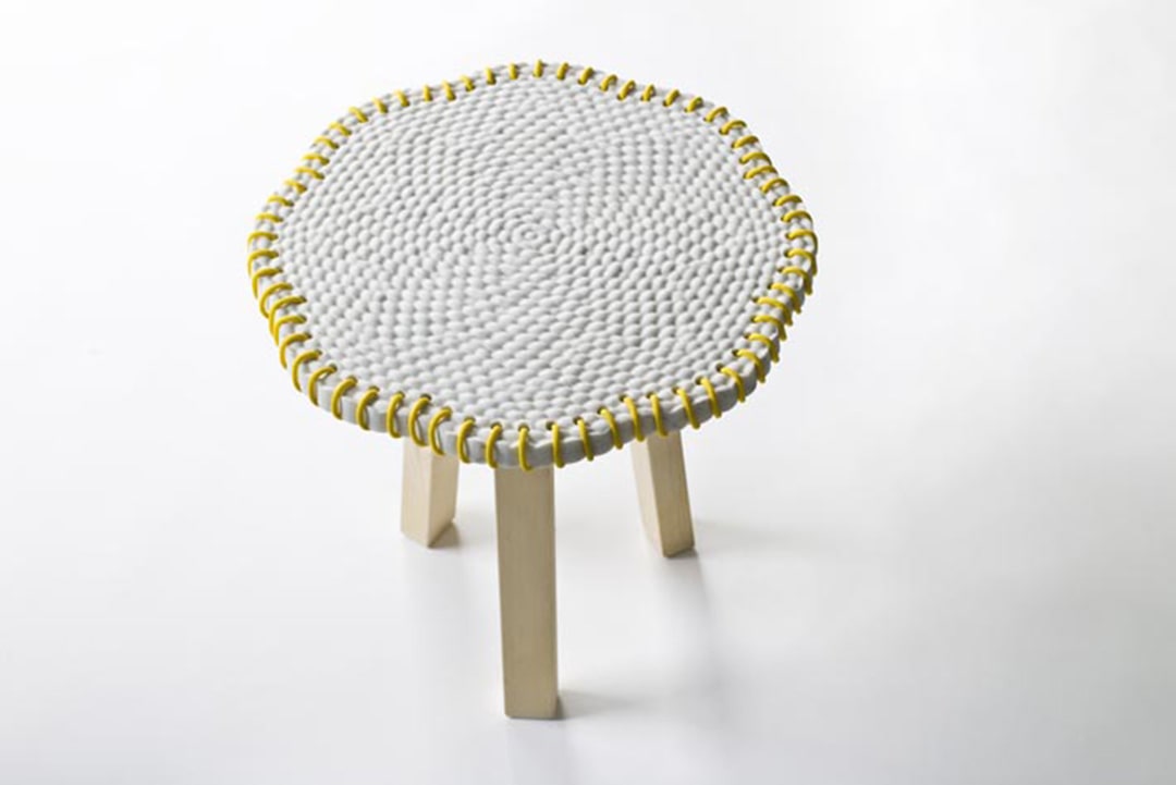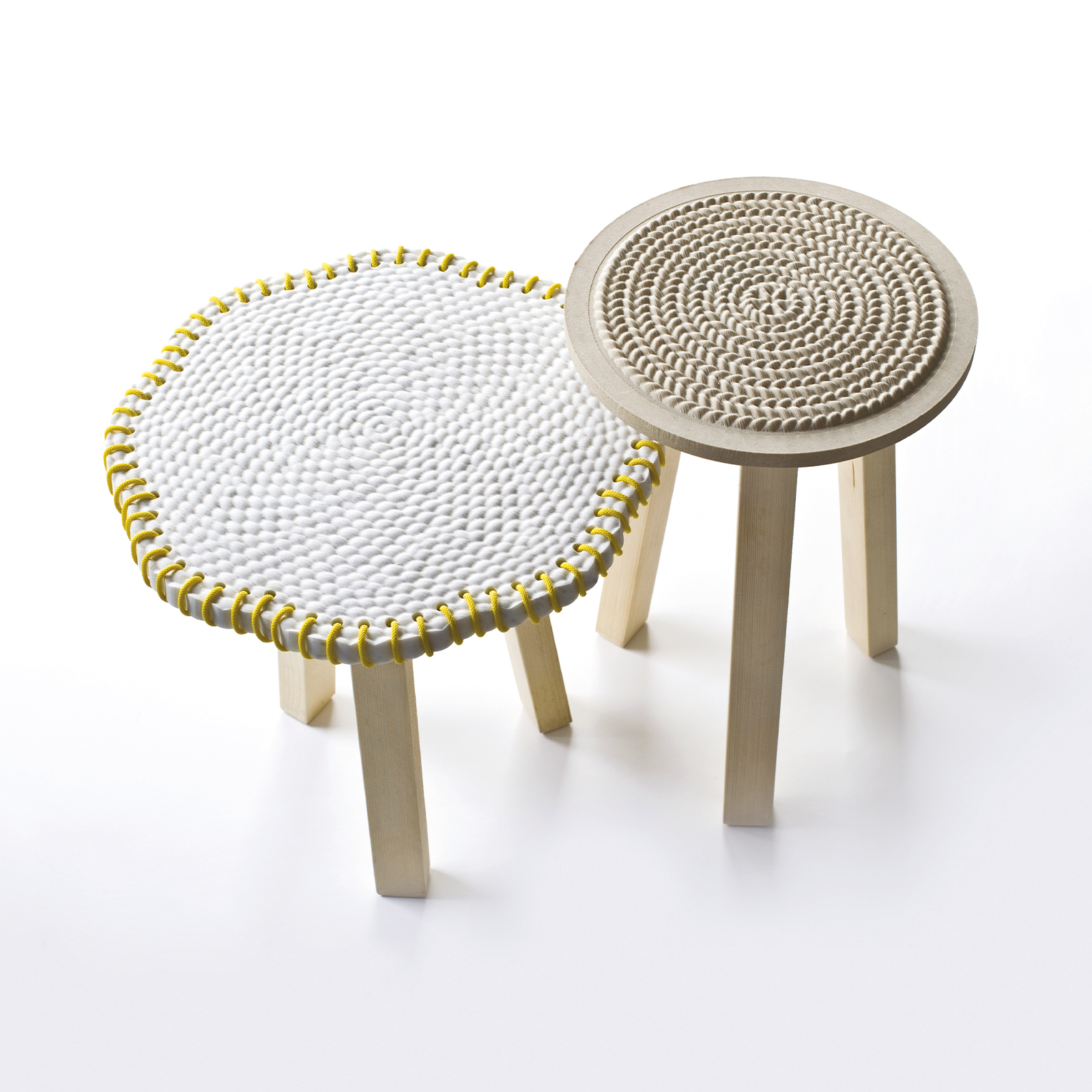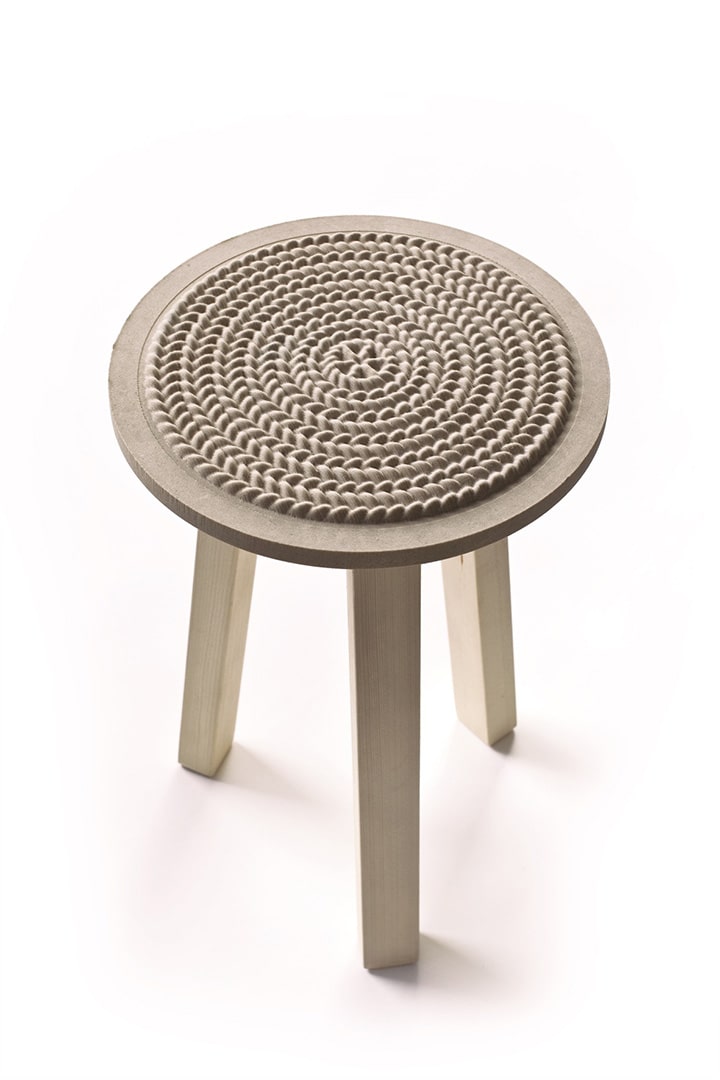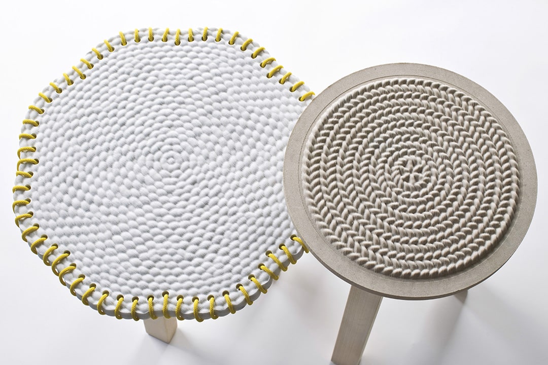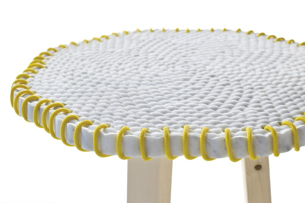 Patricia UrquiolaDella stessa materica natura del Nat|f|Use Carpet, i coffee tables Nat|f|use sono disponibili in coppia: Coffee Table 01, in Marmo Bianco di Carrara, rifinito dal segno grafico di corda giallo fluo, e Coffee Table 02, in Limestone, con motivo tricot concentrico. I due coffee table non sono disponibili separatamente.