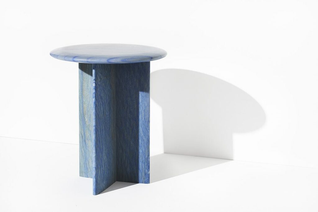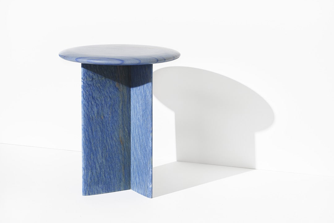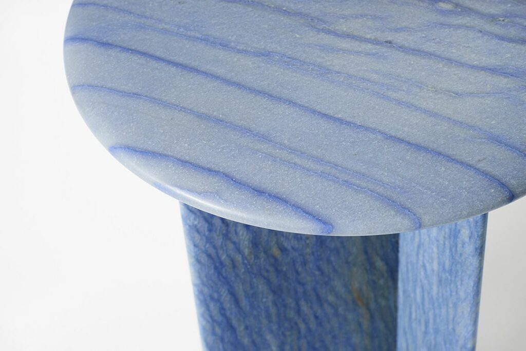 Patricia UrquiolaCoffee Table Papiro, disponibile in due materiali: Azul Macauba, preziosa quarzite, estratta dalla cava brasiliana di Macaùba, o Palissandro Bluette. Il sottile disco, con finitura semi lucida, appoggia su piede a “T“ mettendo in risalto l’andamento longitudinale delle venature.