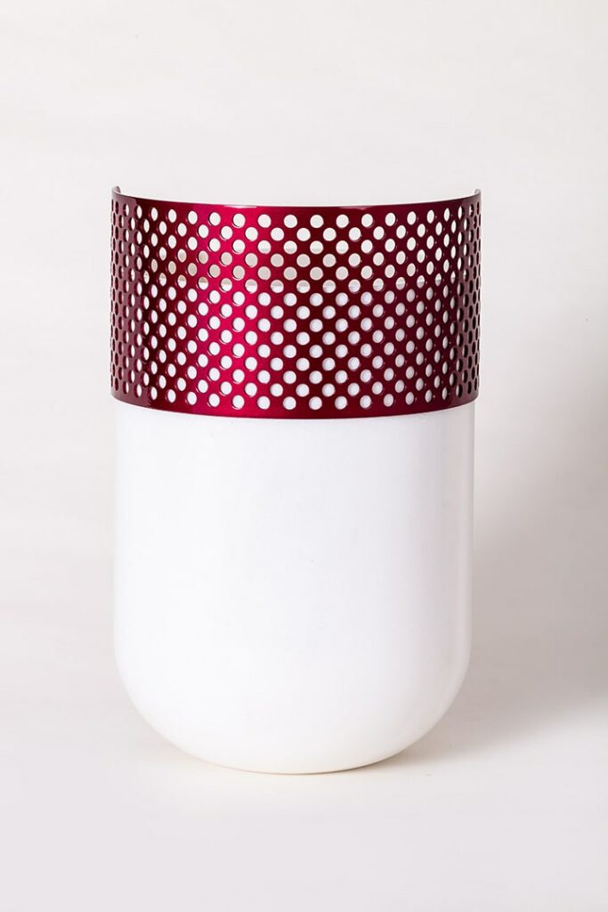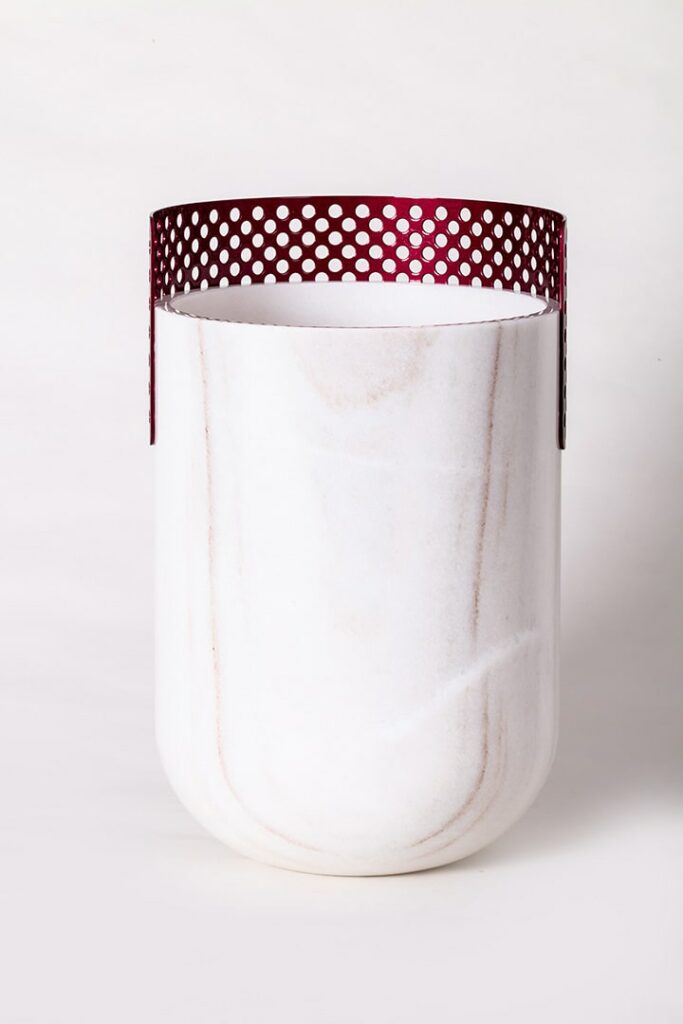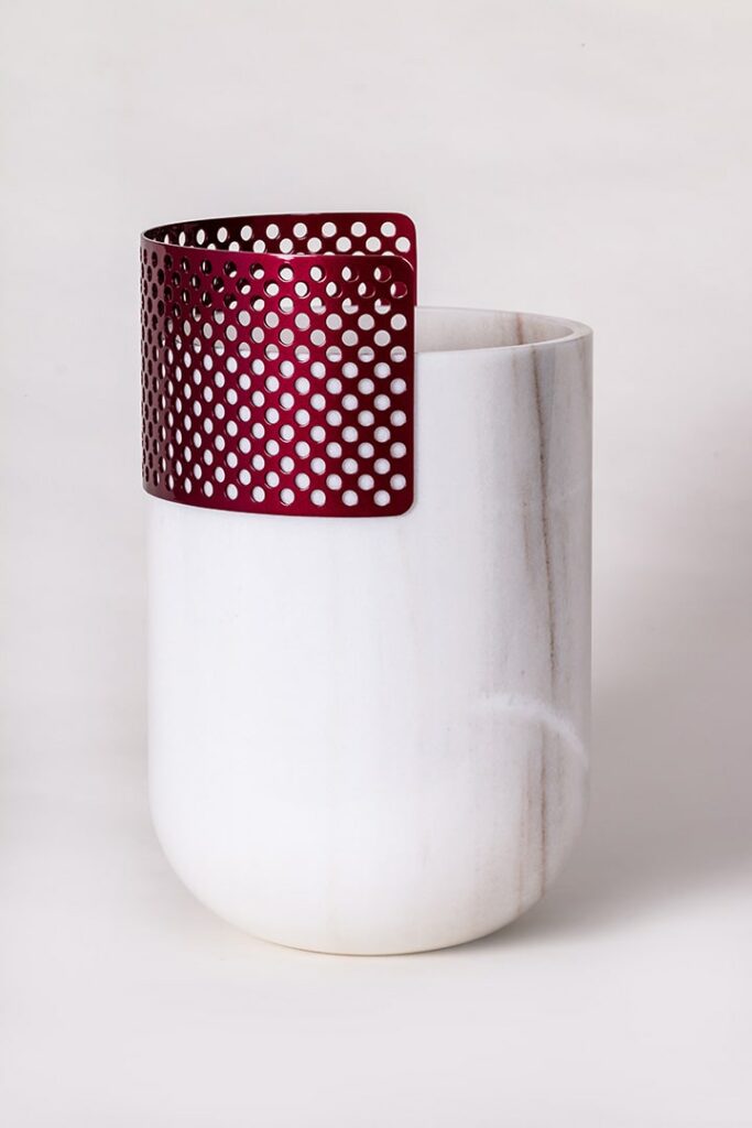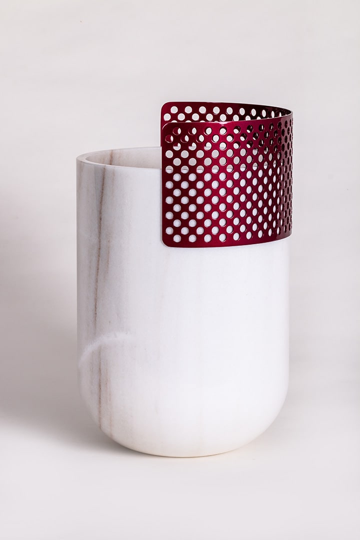 Patricia UrquiolaVaso realizzato da un massello di Bianco Lasa Covelano, con veletta traforata in metallo color Cherry che sovrasta.