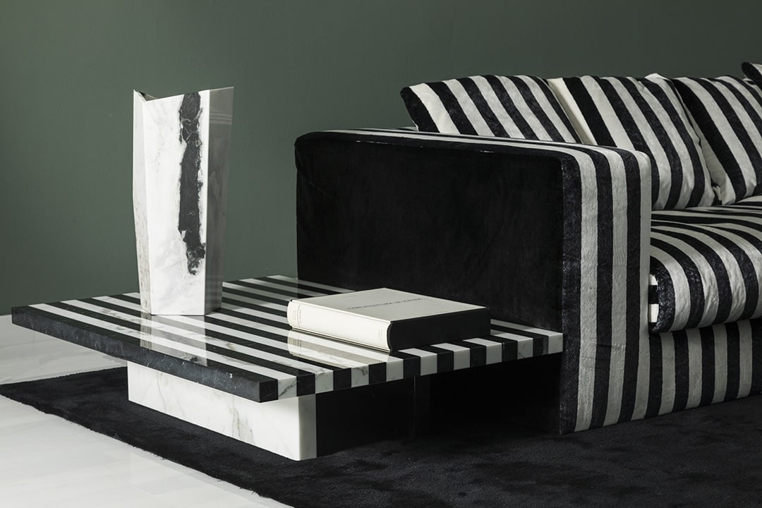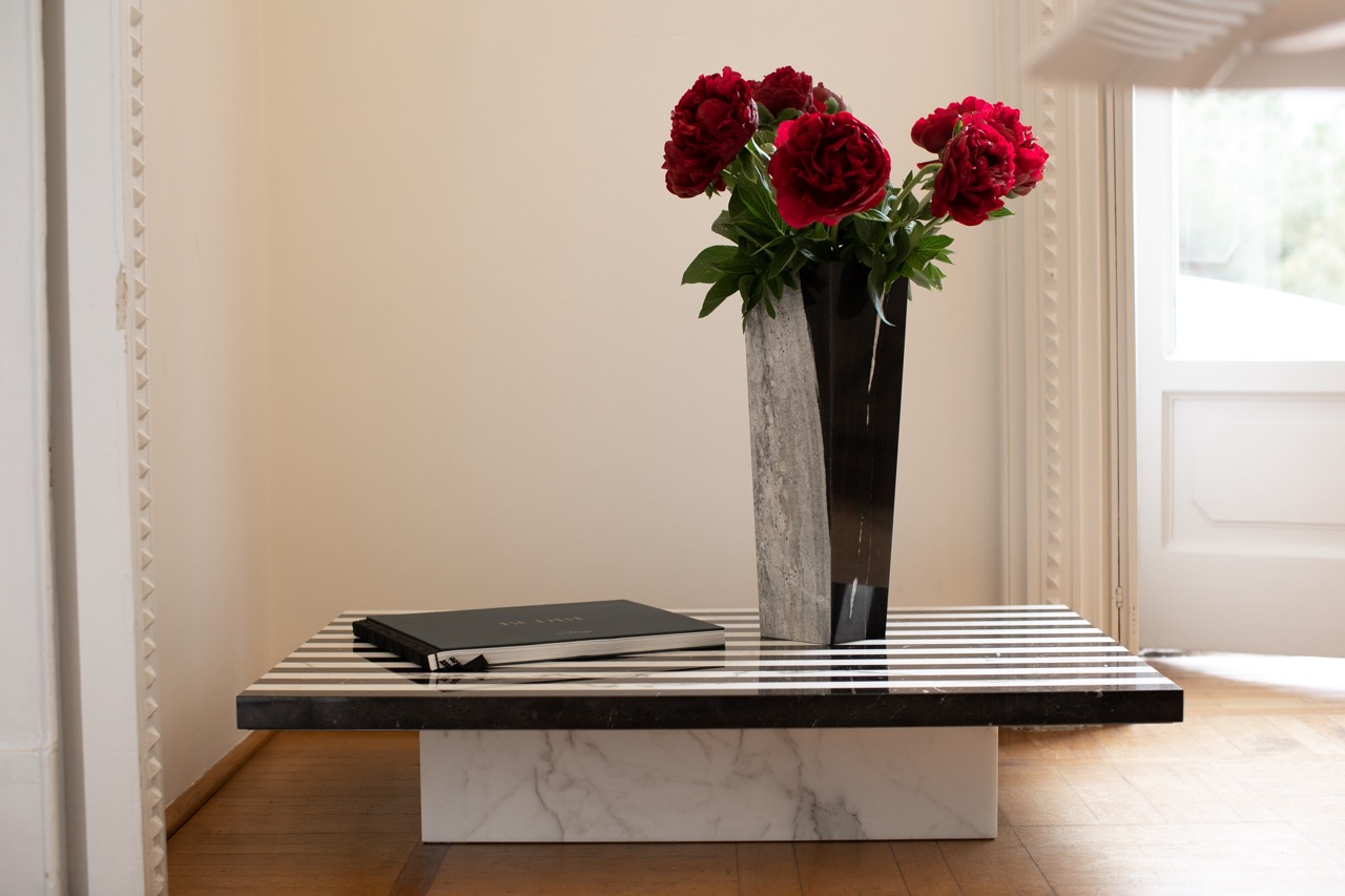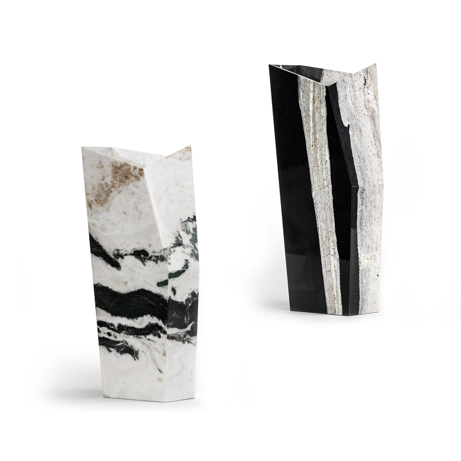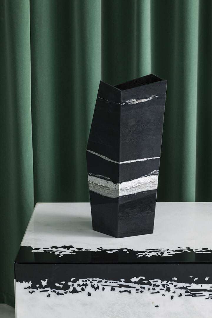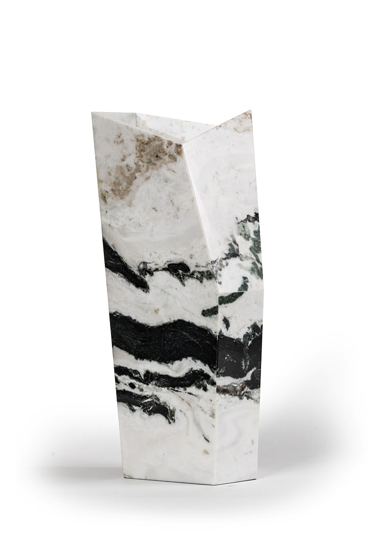Gwenael NicolasVasum e’ realizzato da cinque poligoni diversi tra loro, uniti dalla venatura dei marmi pittorici Panda White oppure Nero Copacabana. L’apparente spigolosità di Vasum scompare grazie alla morbidezza ed eleganza della pietra. Disponibile nella variante in Panda White o in quella in Nero Copacabana.