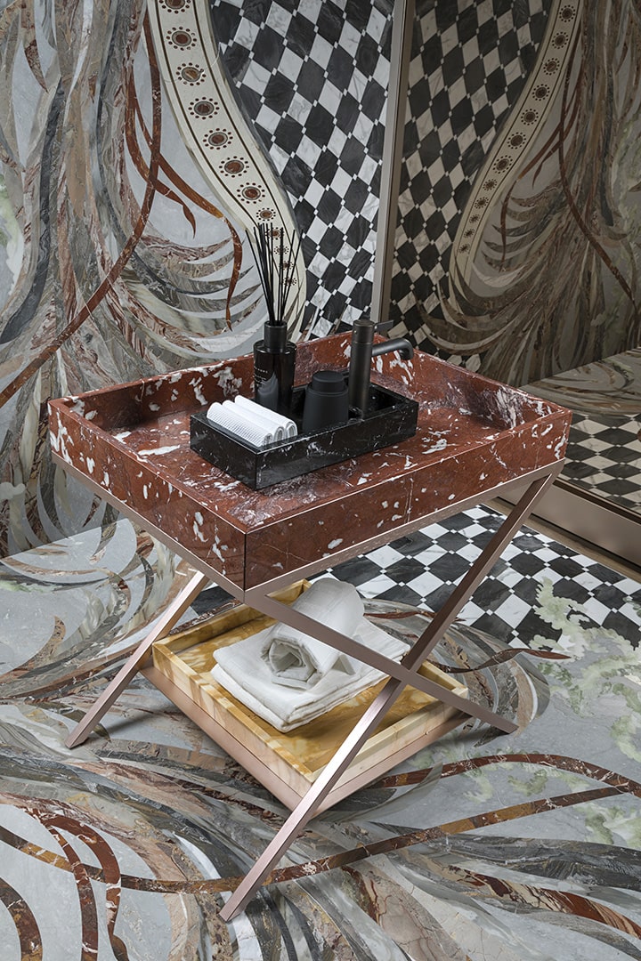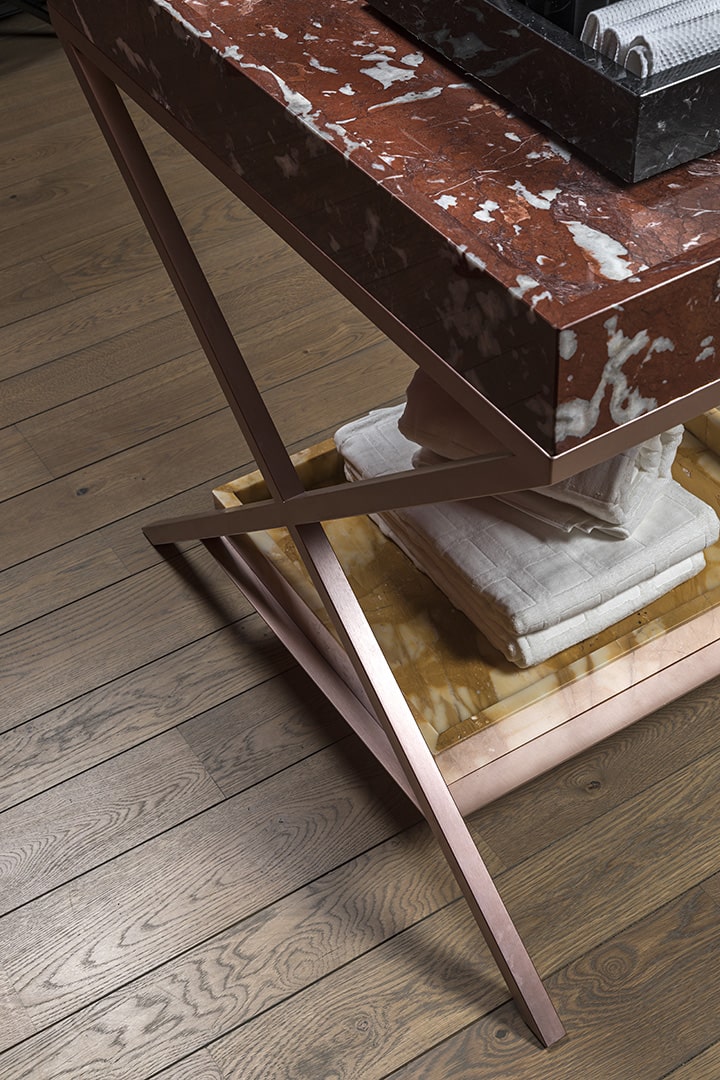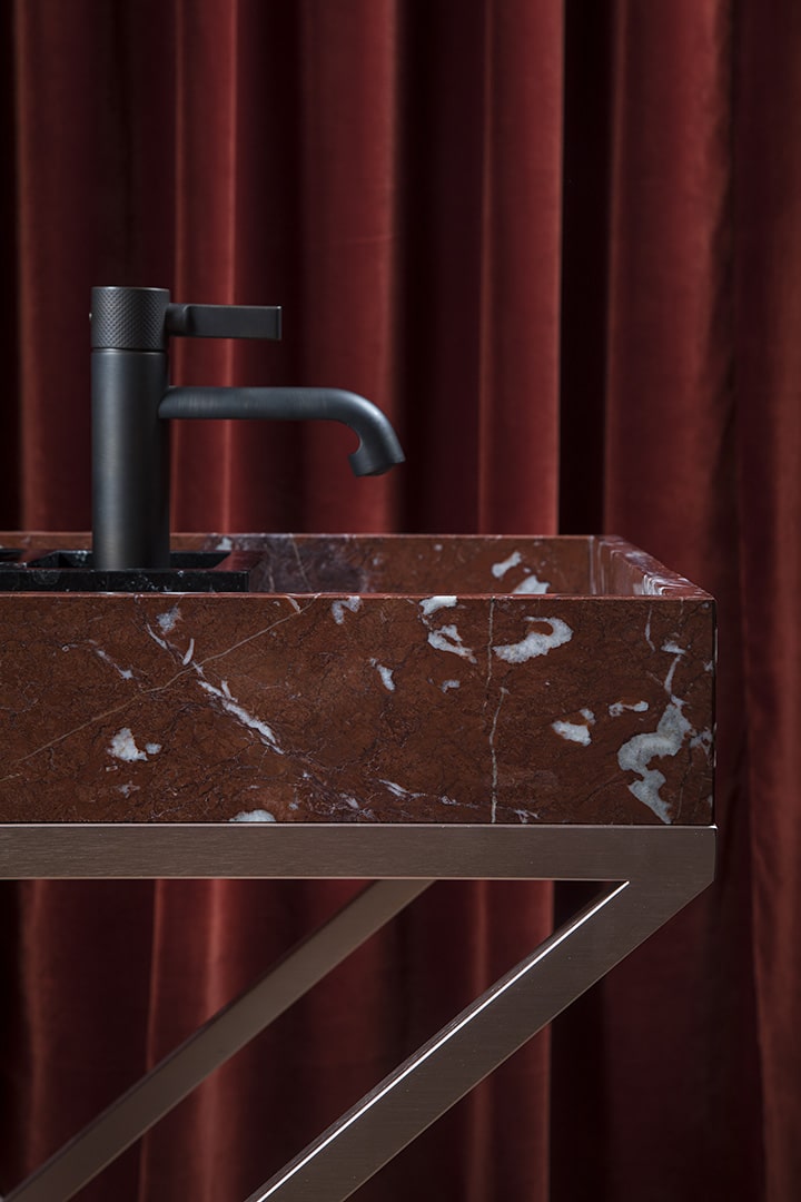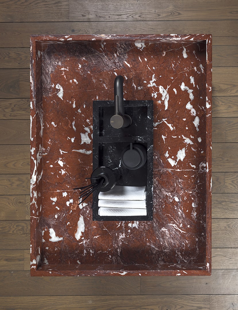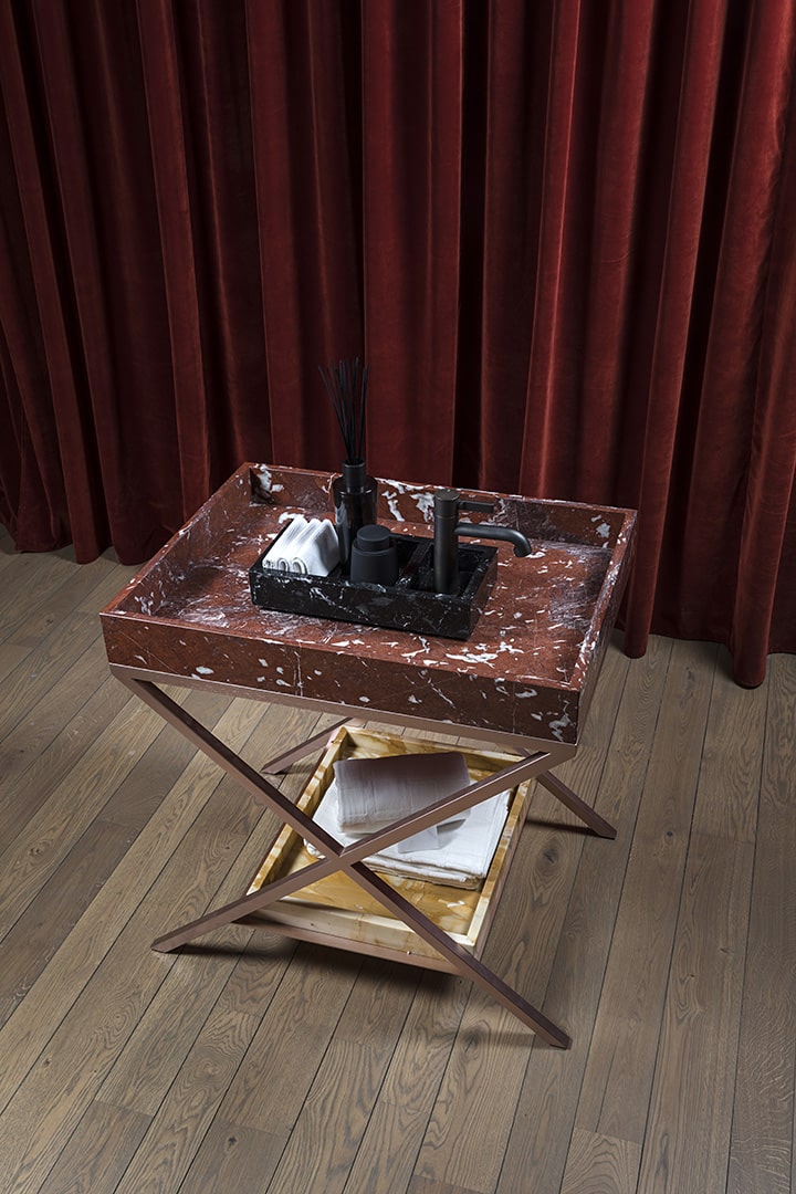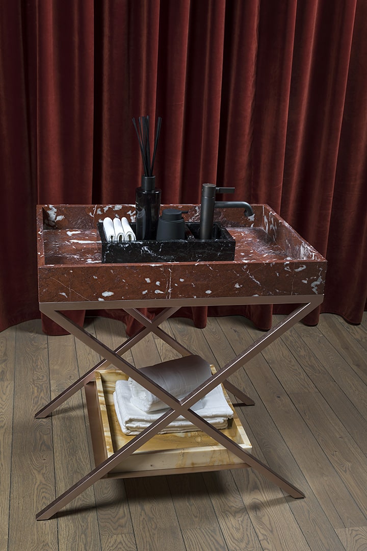 Sonja VizziniSistema lavabo monoposto costituito da tre vassoi in marmo sovrapposti poggianti su tre pliant metallico rame satinato. Vassoio interno Nero Marquinia per alloggiamento saponi e lavette. Bacino acqua principale in marmo Rosso Francia con scarico centrale e piletta a scomparsa. Vassoio sottostante in marmo Giallo Siena per alloggiamento asciugamani. Rinforzo metallico tra le lastre.