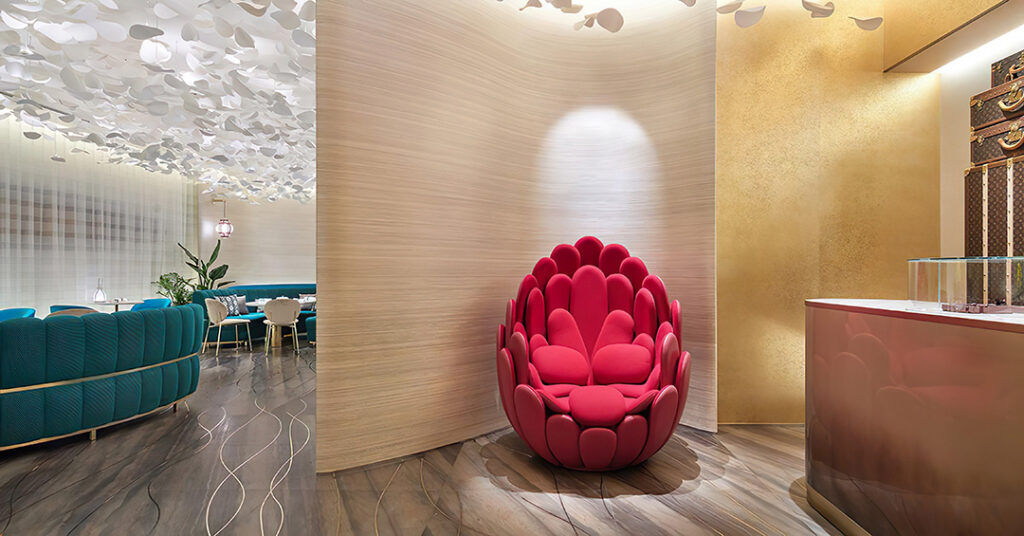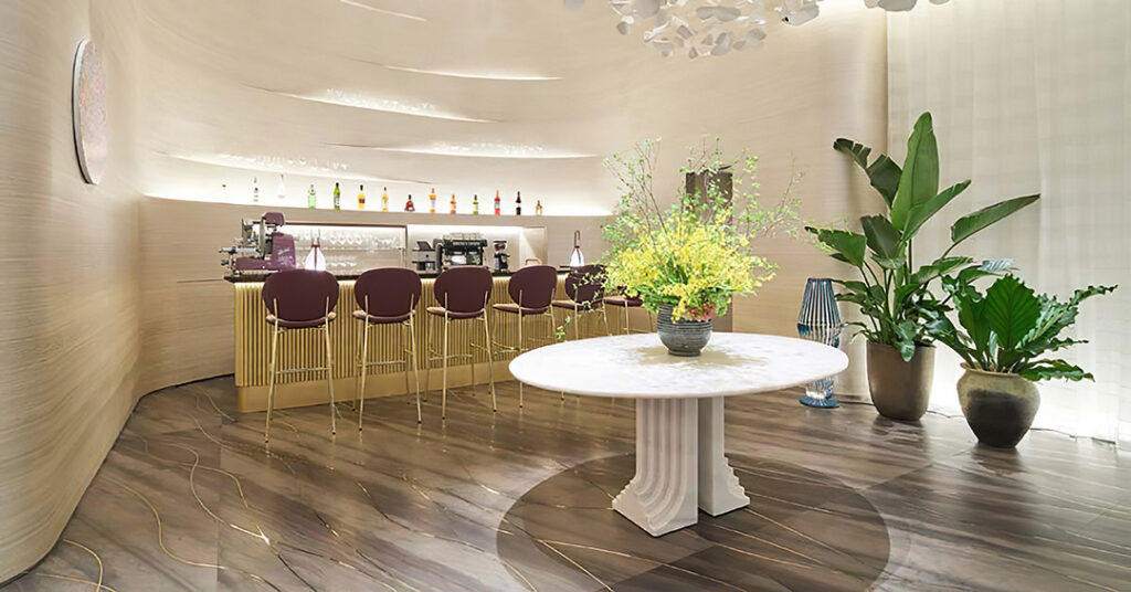 Progetto su misura per il quale Budri ha realizzato l’ampia pavimentazione in marmo taupe con intarsi in ottone. Il pattern sinuoso mette in risalto la finitura matt del pavimento e la lucentezza del metallo.