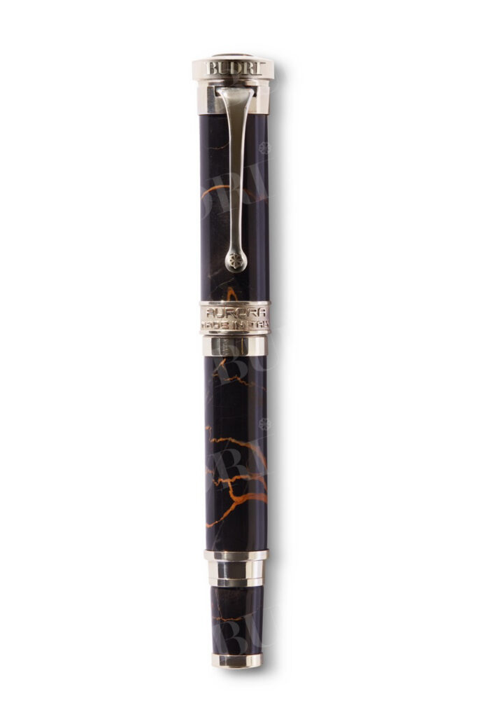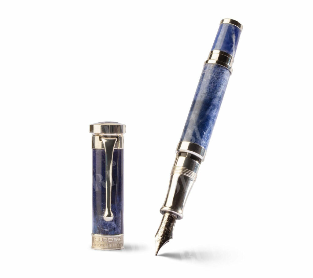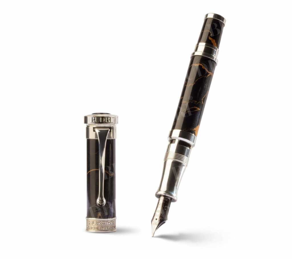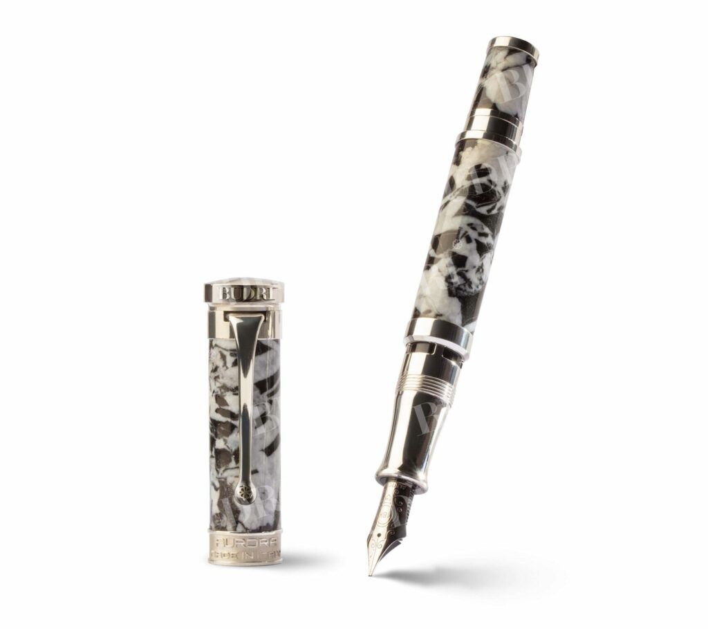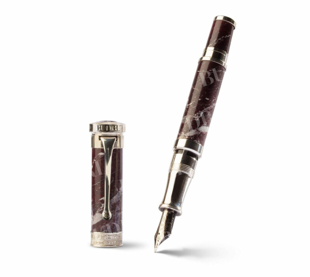 Collezione di penne stilografiche brandizzate Budri e Aurora, rivestite in marmo ultrasottile incollato su fibra di carbonio. Realizzate in Lapis Lazuli, Grand Antique, Nero Portoro, Rosso Levanto e Rain Forest Green.