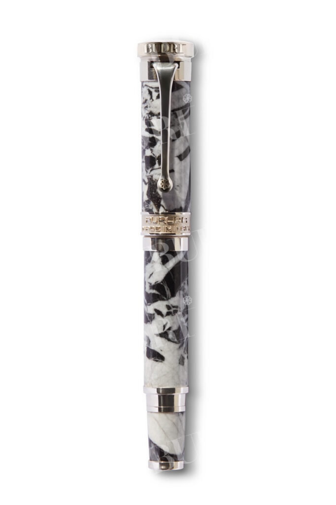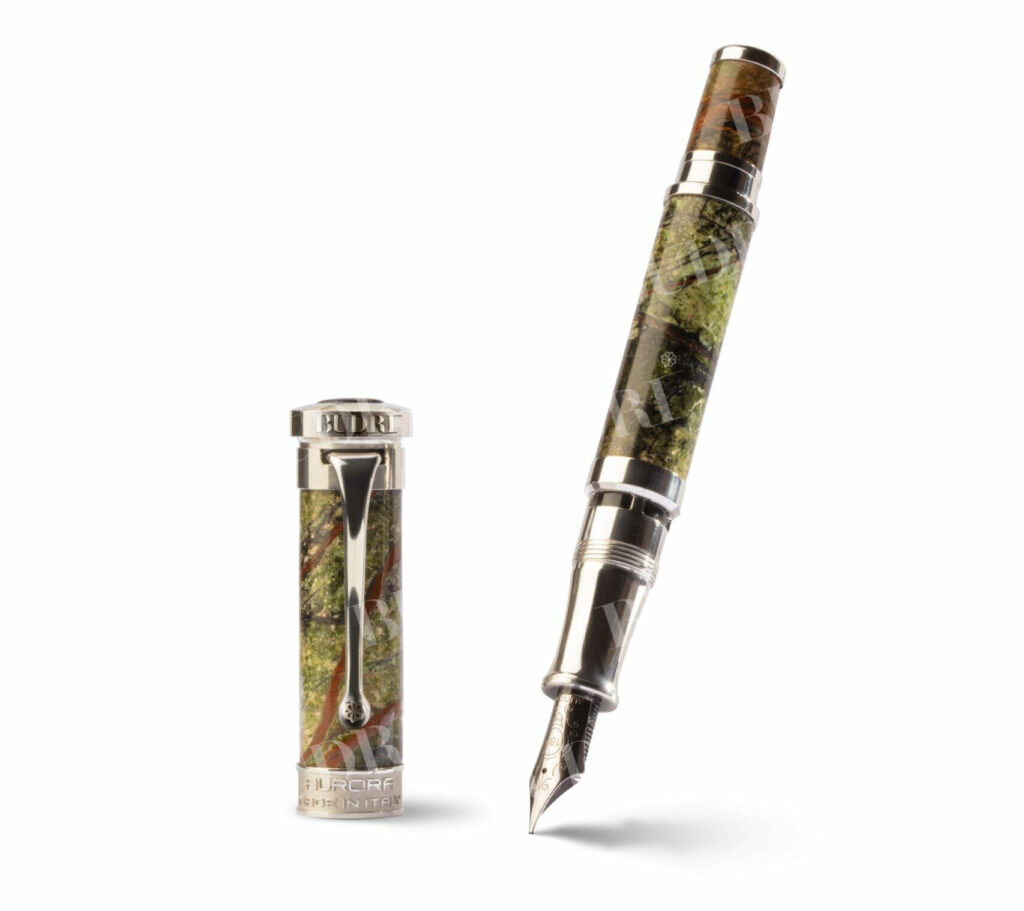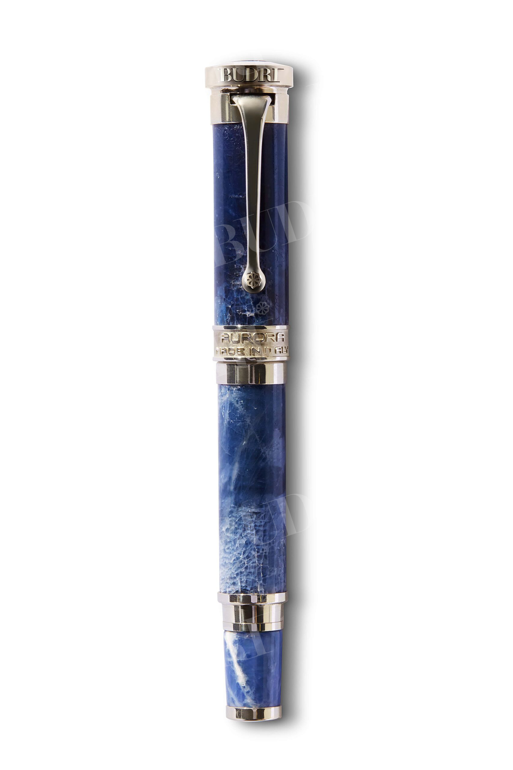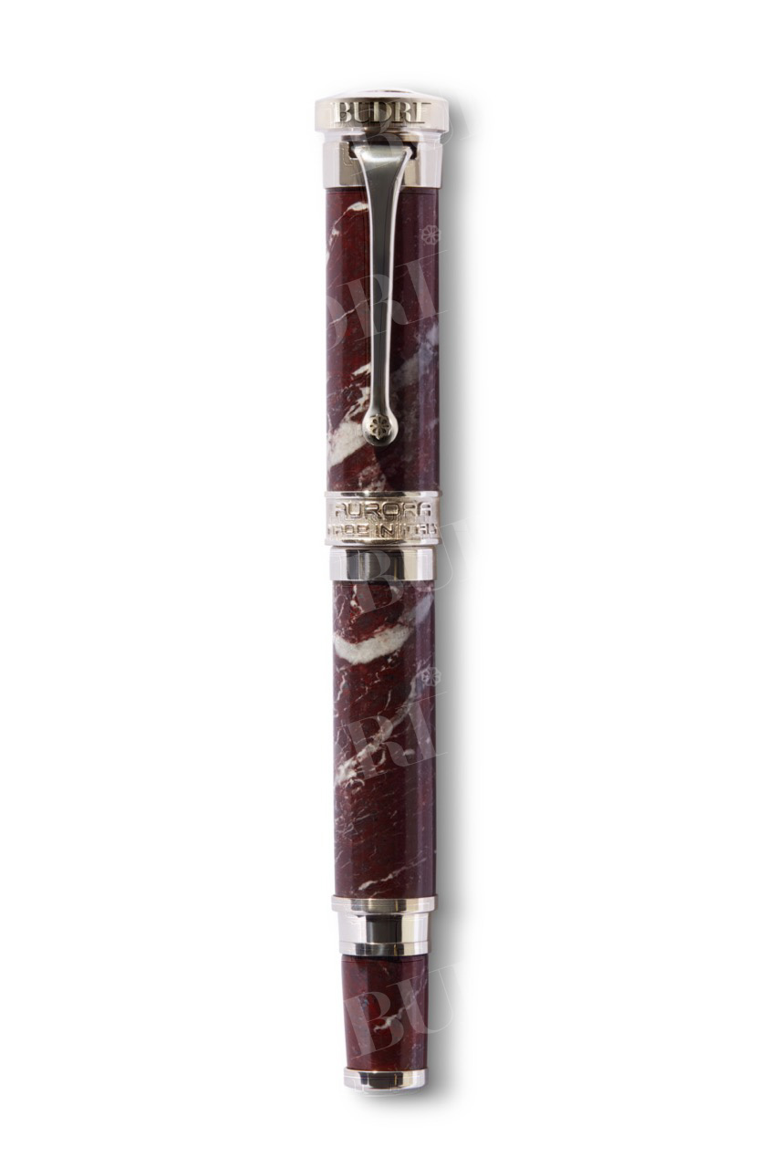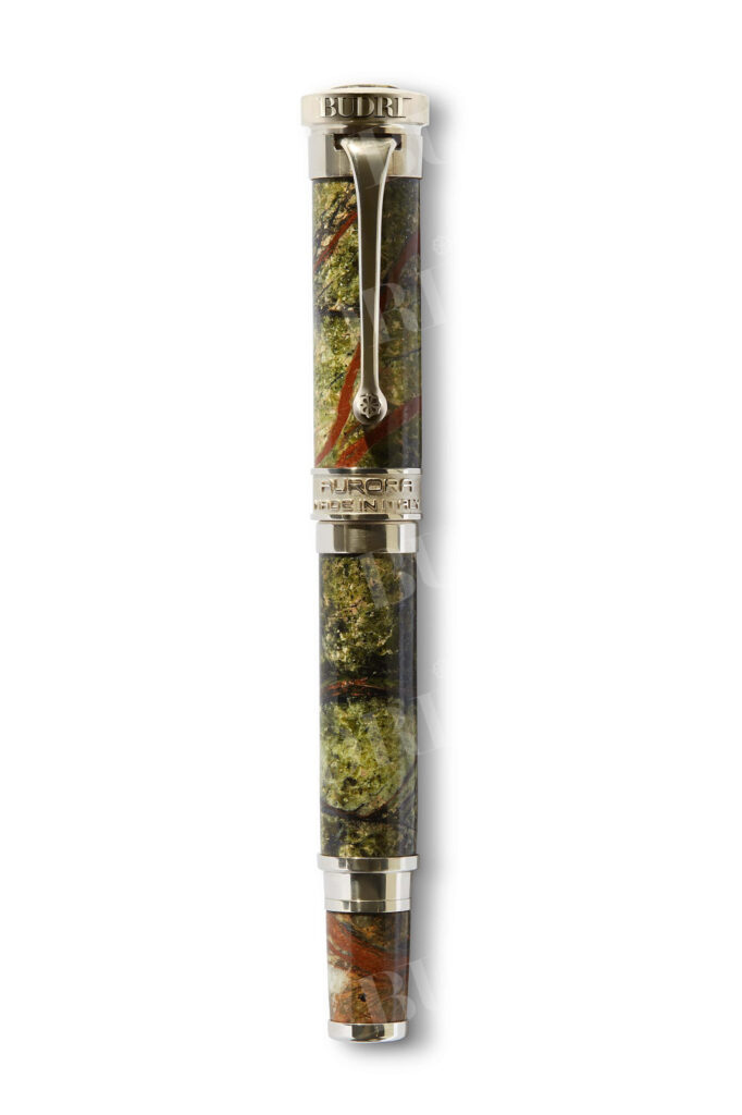 Collezione di penne stilografiche brandizzate Budri e Aurora, rivestite in marmo ultrasottile incollato su fibra di carbonio. Realizzate in Lapis Lazuli, Grand Antique, Nero Portoro, Rosso Levanto e Rain Forest Green.