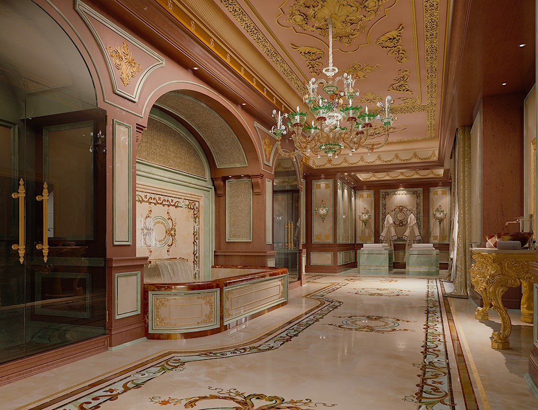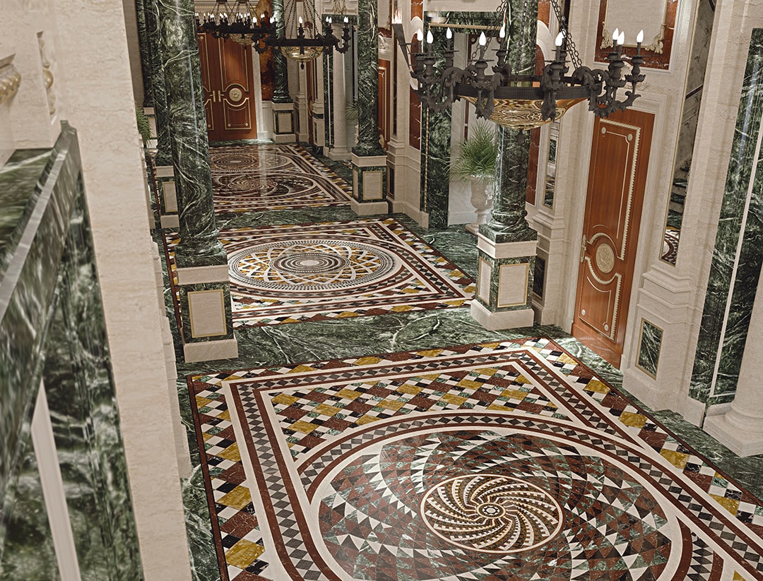 Della medesima tipologia il Main Corridor con colonne in Verde Alpi ed intarsi geometrici sulle superfici a voler riprendere i motivi della Spa. Il Master Bathroom presenta pavimenti e rivestimenti intarsiati in Onici preziosi dai toni caldi.